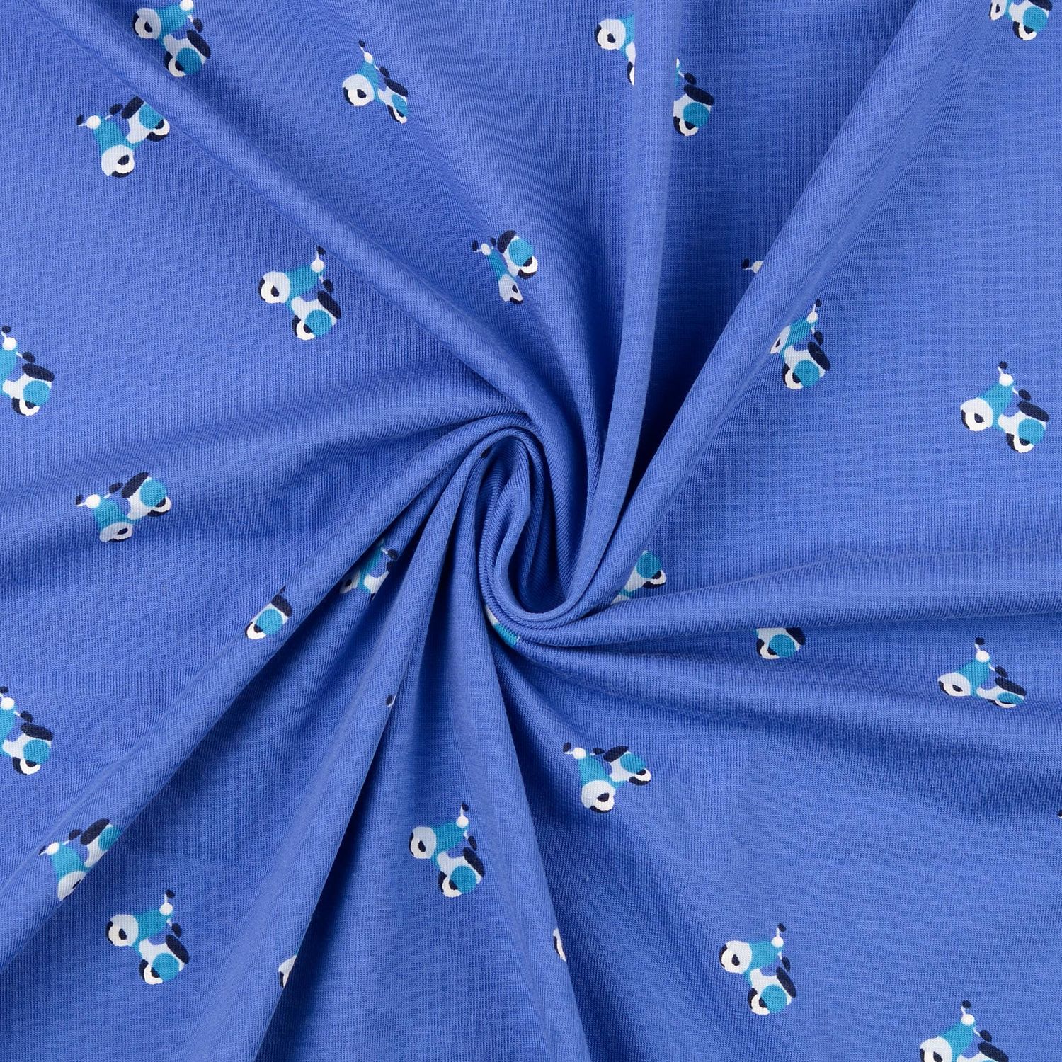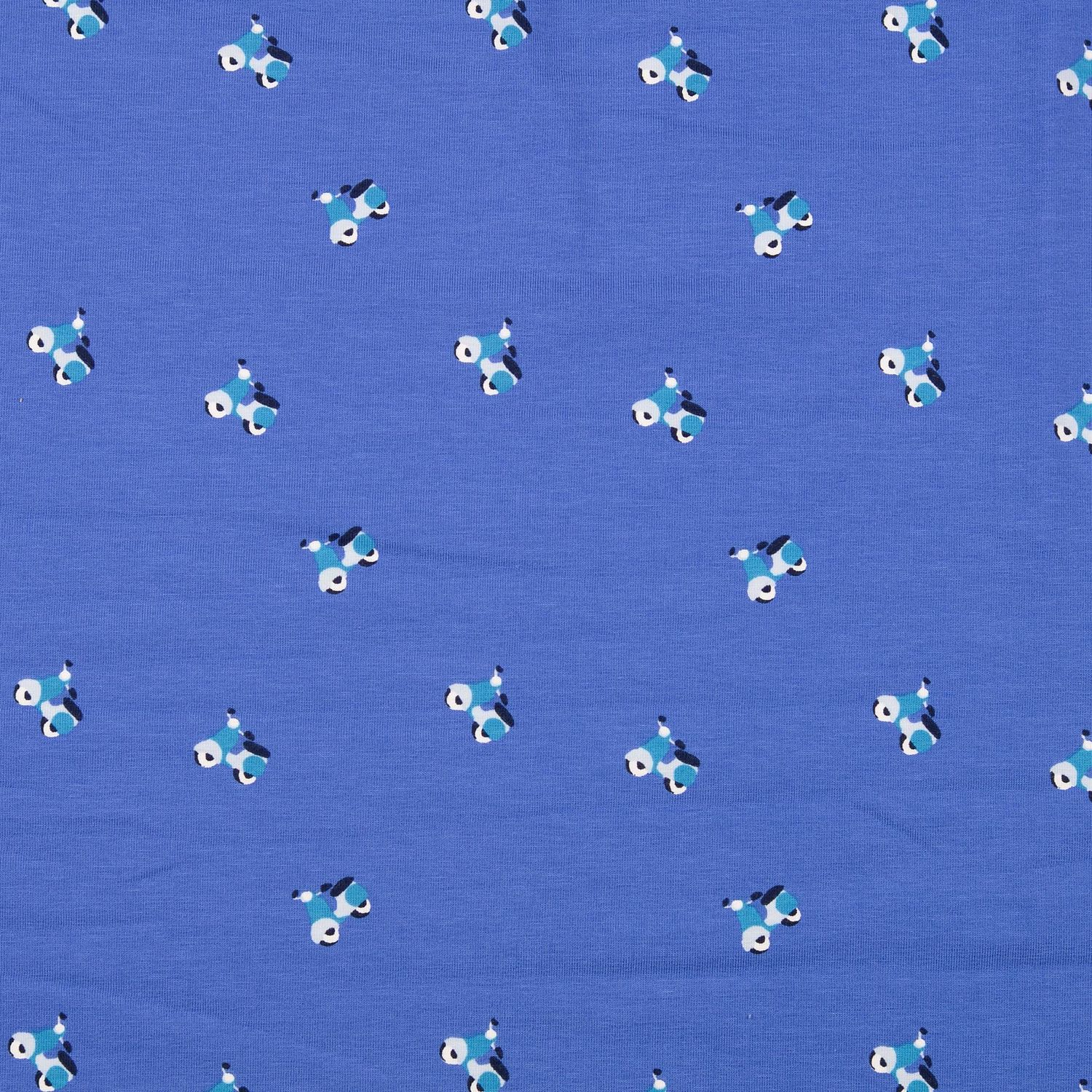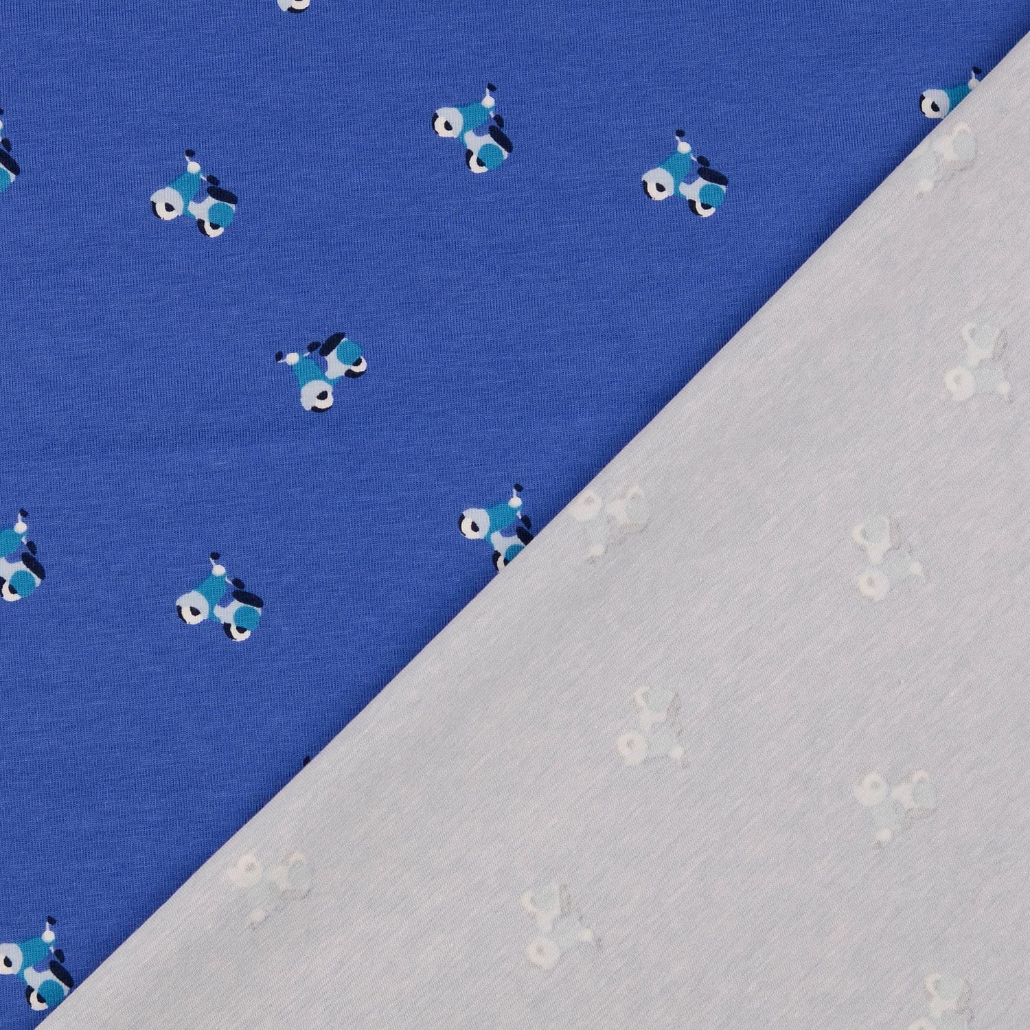Met deze jersey gaat de fantasie op volle snelheid! Op een zachte blauwe achtergrond rijden kleine scooters in vrolijke kleuren over de stof – soms in krachtig rood, soms in fris geel, met subtiele details in wit en donkerblauw. Het speelse ontwerp is levendig maar niet te wild, perfect voor kleine en grote scootervrienden.