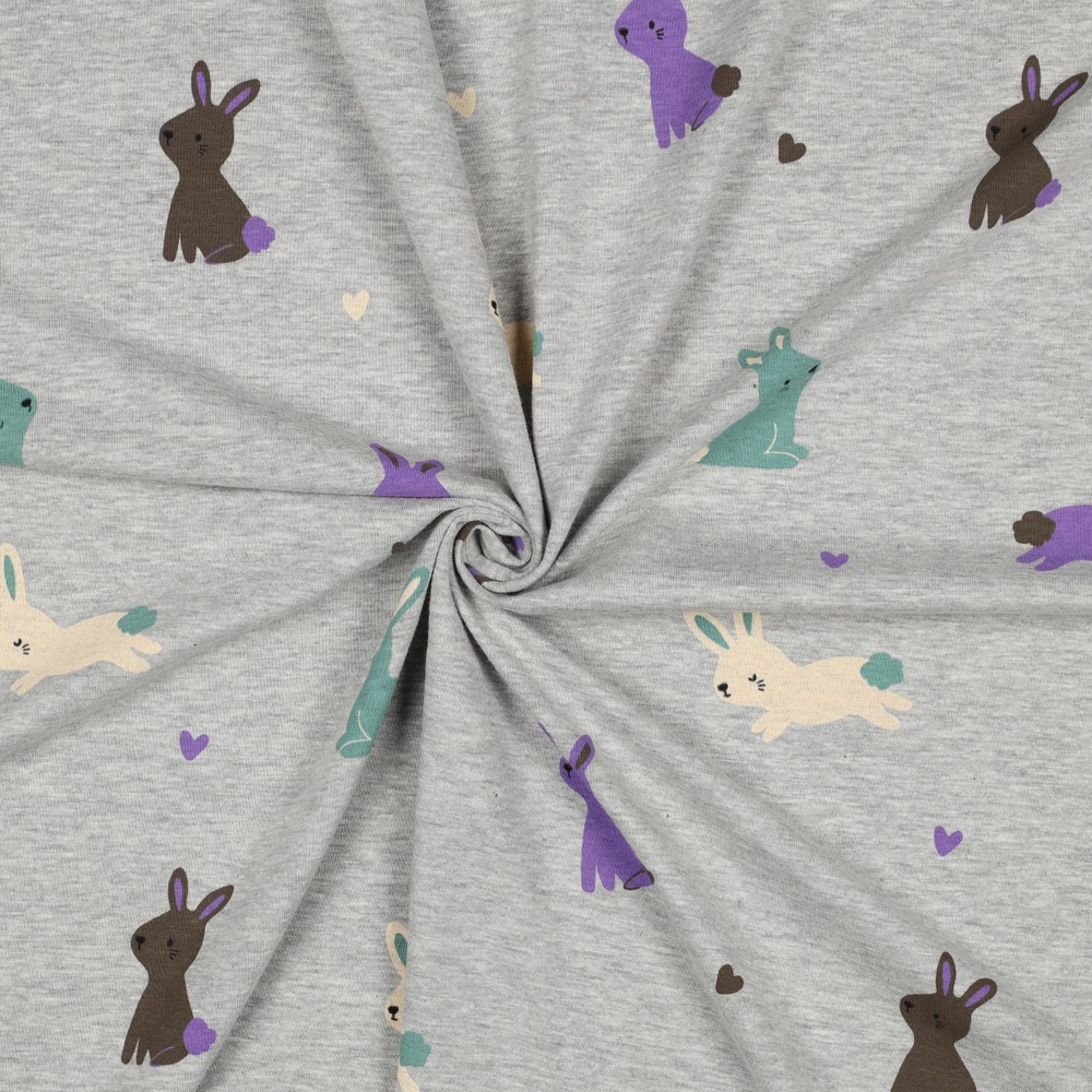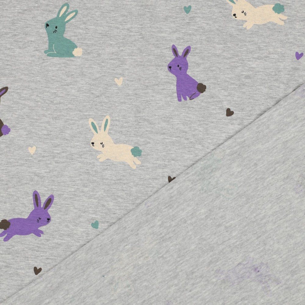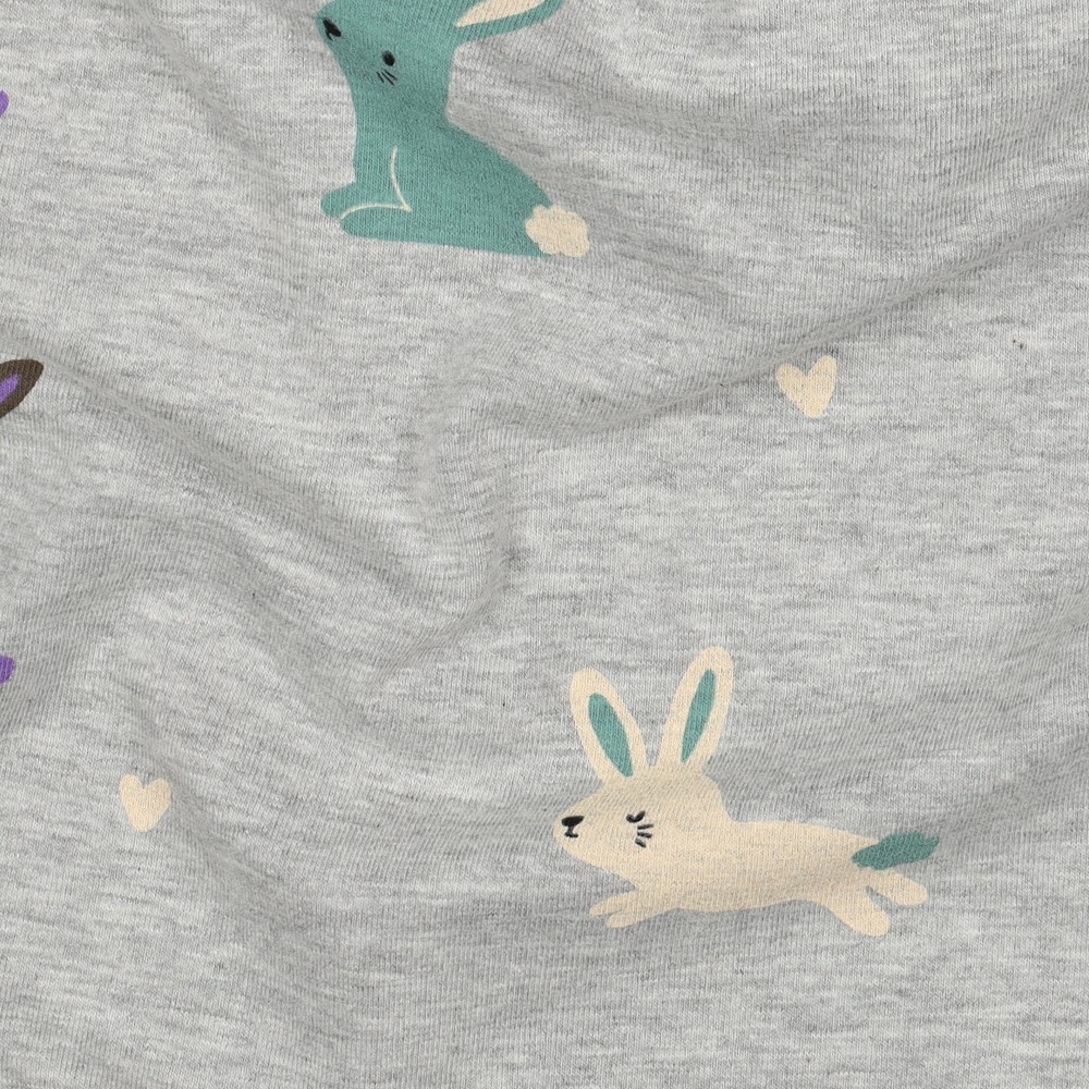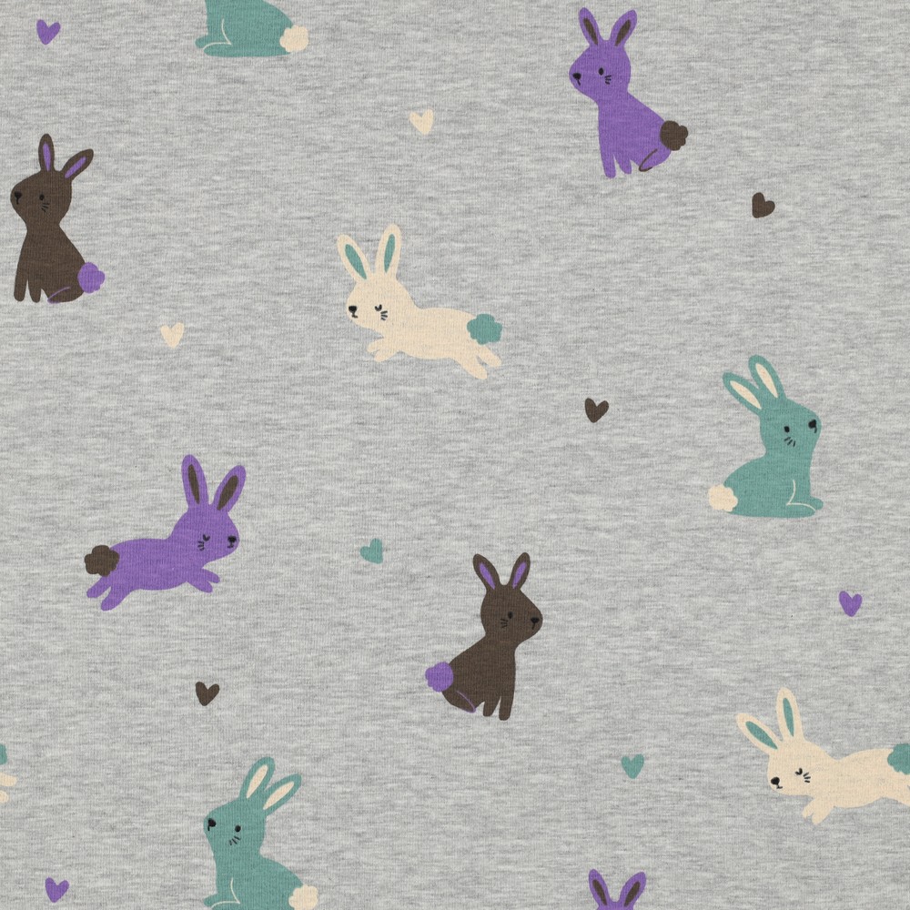 Een stof om verliefd op te worden: Kleine, tere konijntjes dartelen op de zacht gevlekte grijze tint, omringd door liefdevol gerangschikte hartjes. De konijntjes zijn getekend met fijne lijntjes en zien eruit alsof ze zo uit een kinderboek komen - speels, vriendelijk en gewoonweg knuffelbaar.