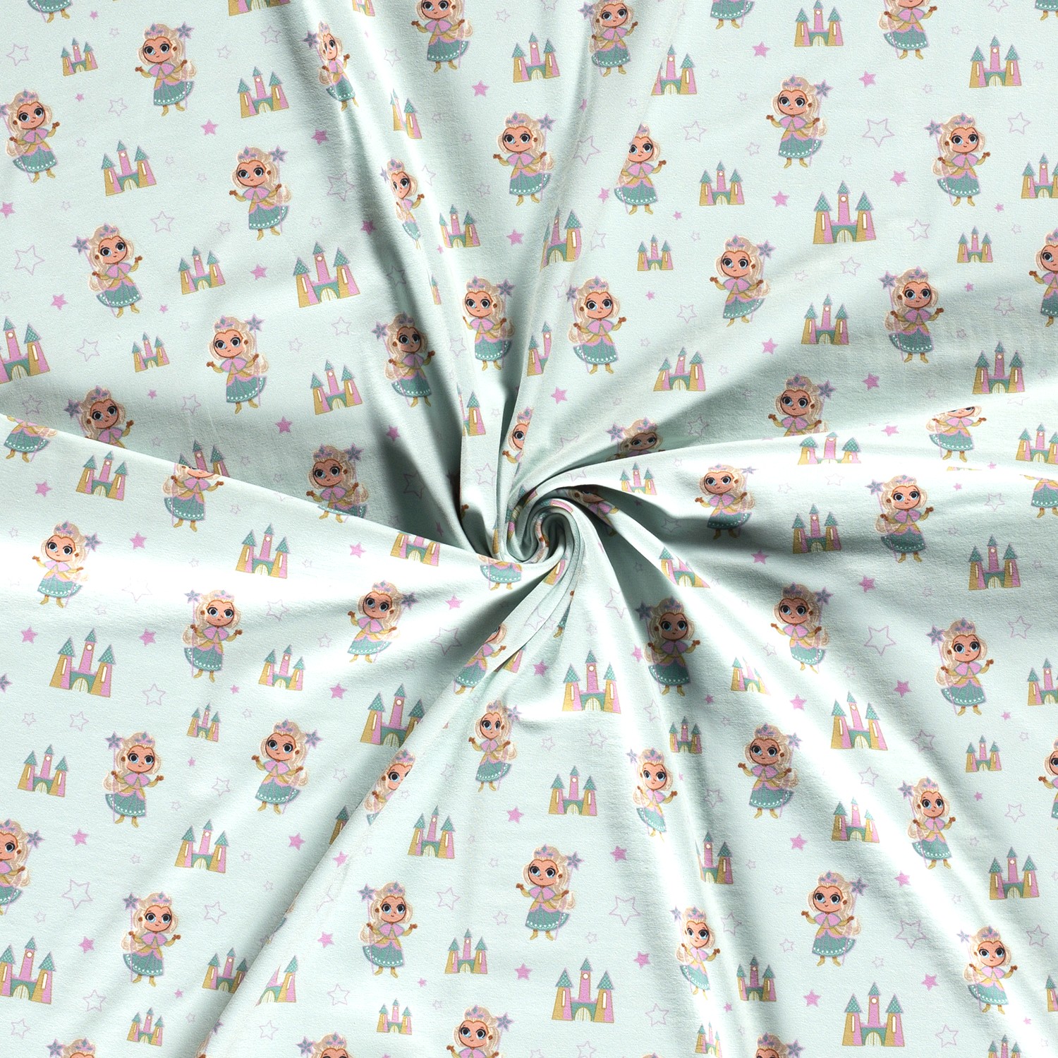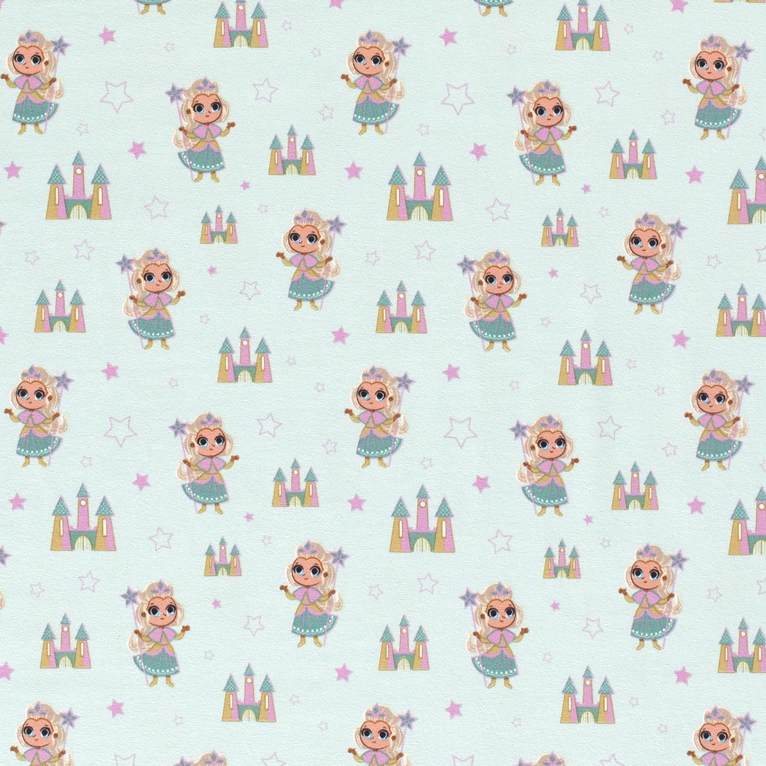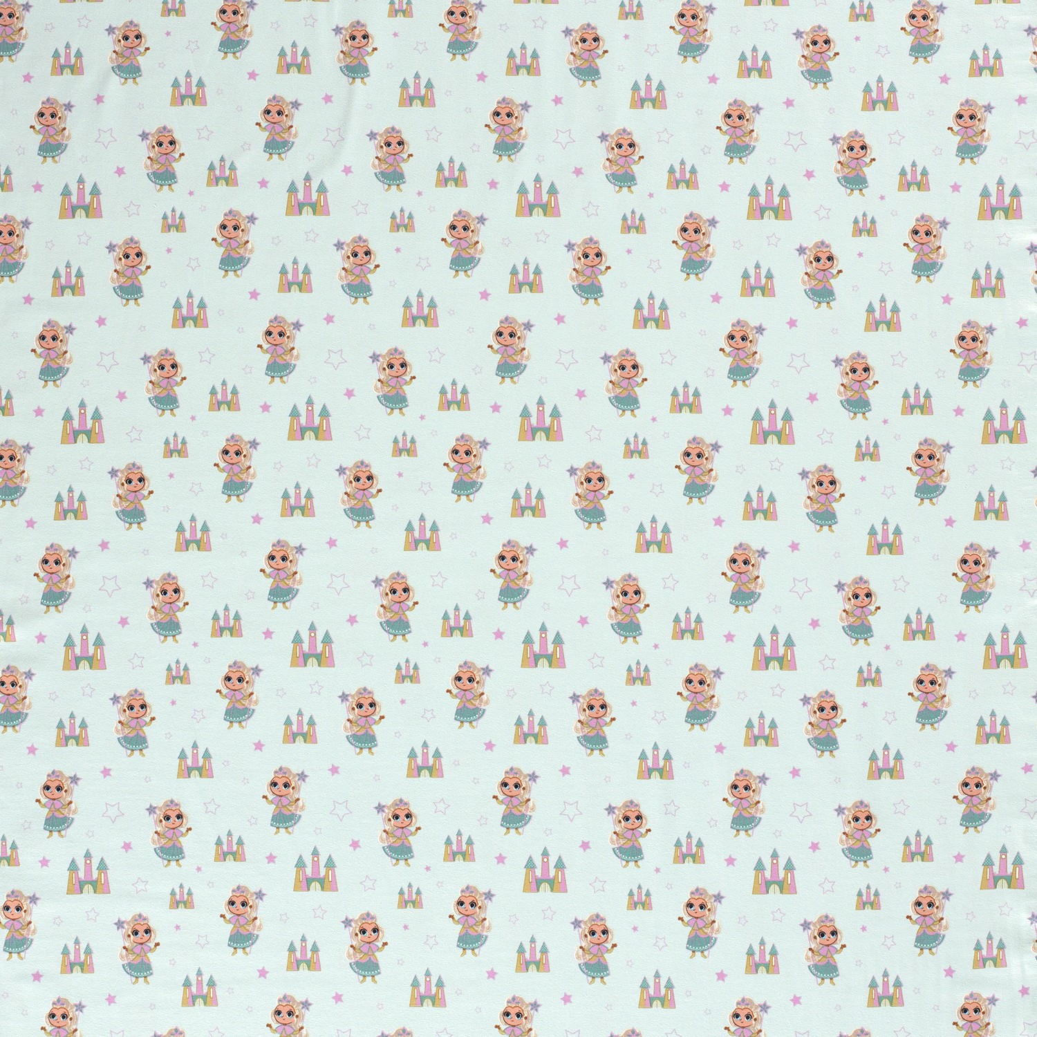 Een zachte lichtmint als achtergrond, met kleine droomkastelen en burchten omgeven door fijne sterretjes – deze jersey lijkt wel een scène uit een sprookjesboek. De liefdevol ontworpen kastelen in zachte grijs- en beigetinten vormen een mooi contrast met het frisse mint, terwijl de kleine sterretjes het ontwerp een speels en luchtig karakter geven.