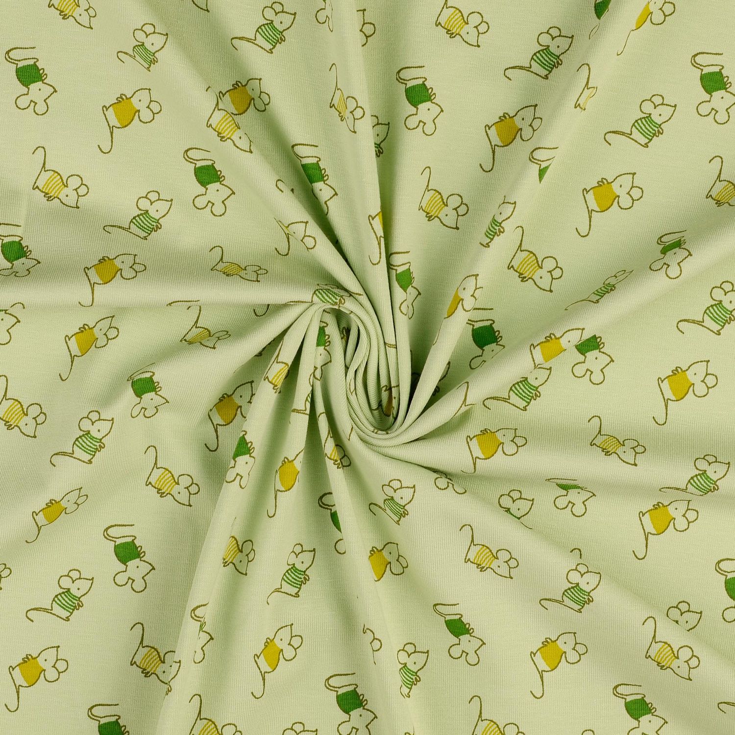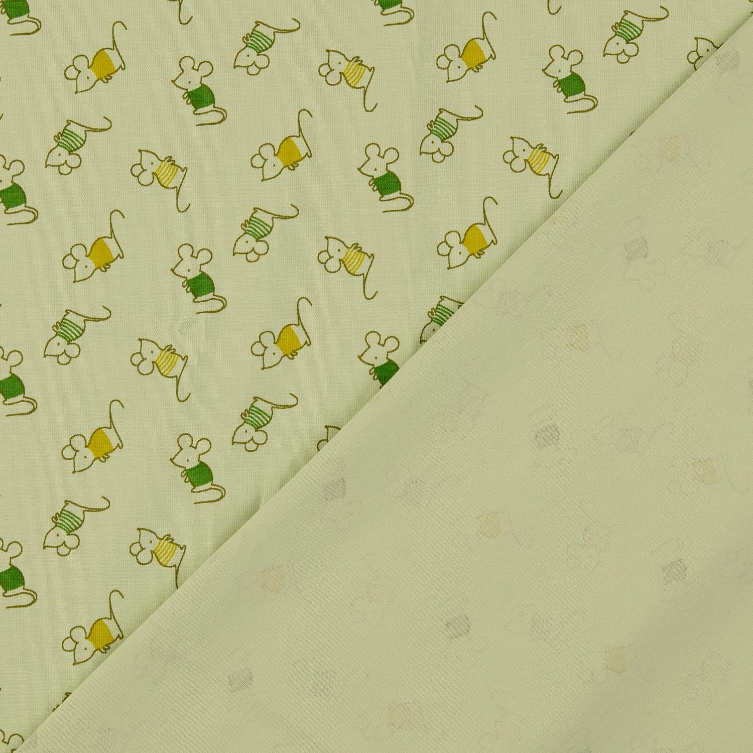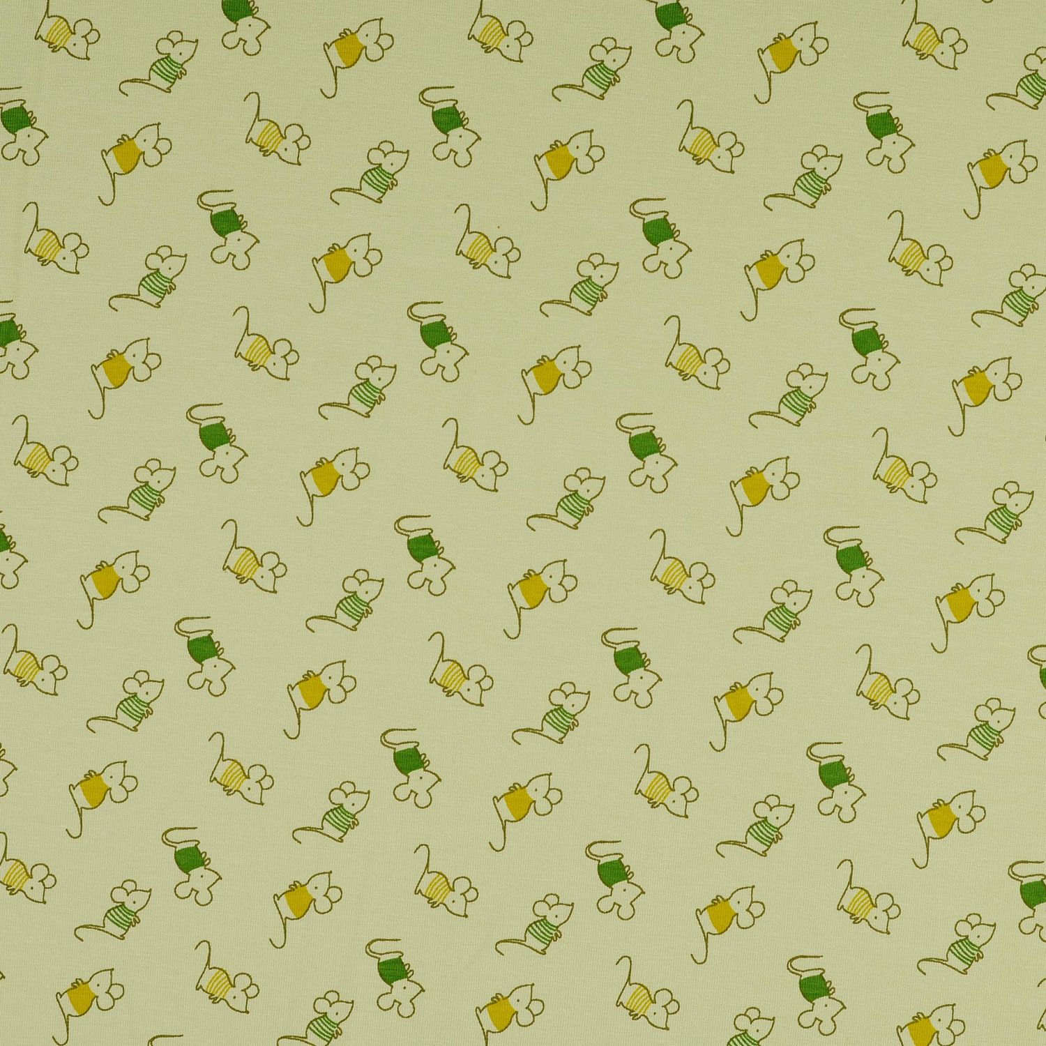 De kleine muisjes dartelen vrolijk over de stof en zijn uitgevoerd met fijne details – van de oortjes tot het staartje. De zachte mintkleur oogt fris en modern en combineert prachtig met effen stoffen in wit, grijs, naturel of pasteltinten.