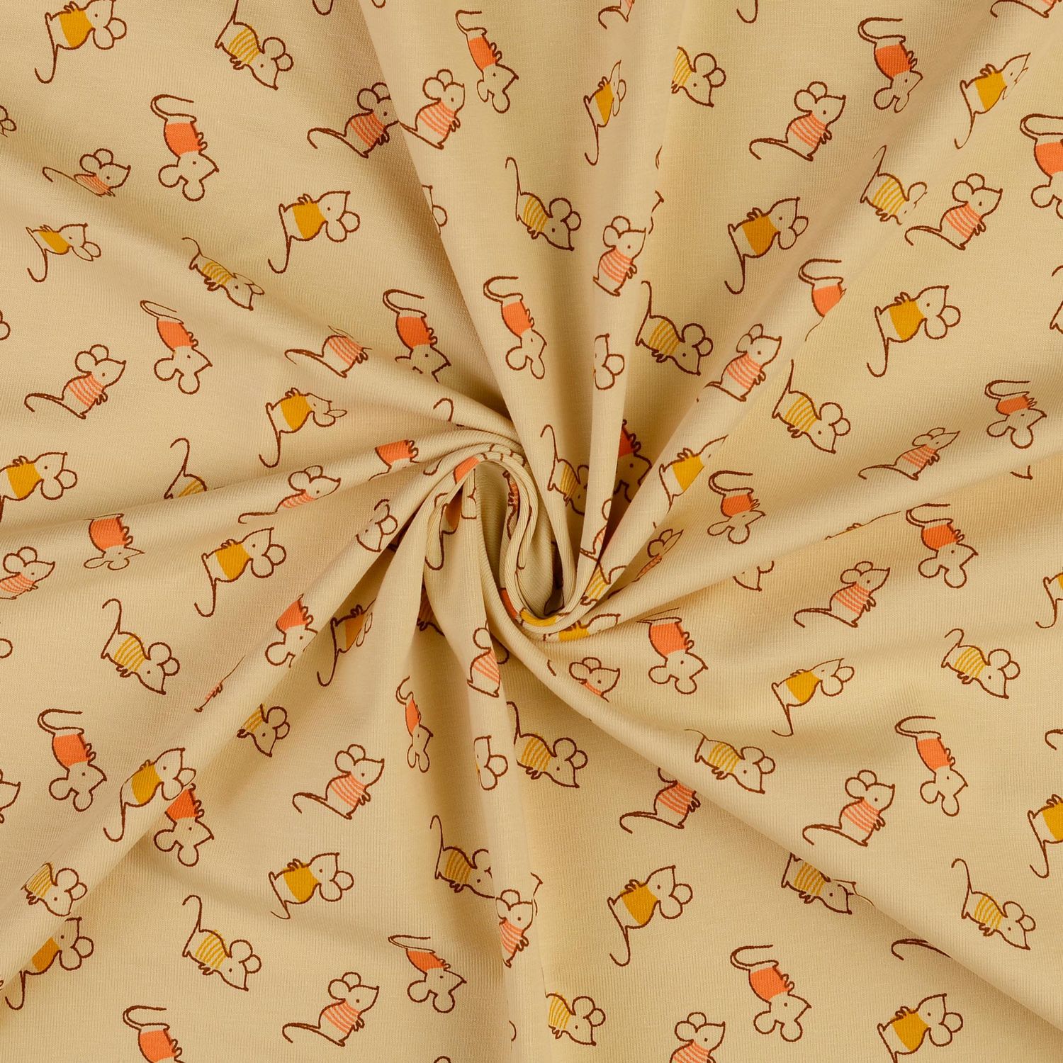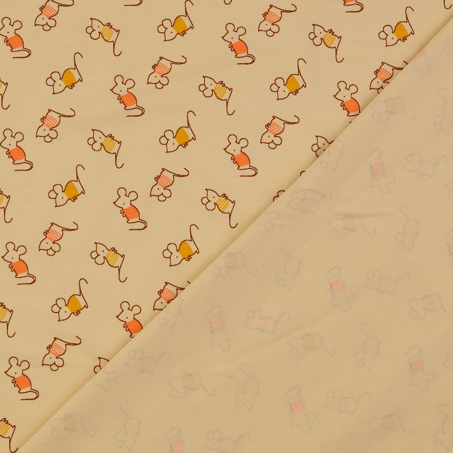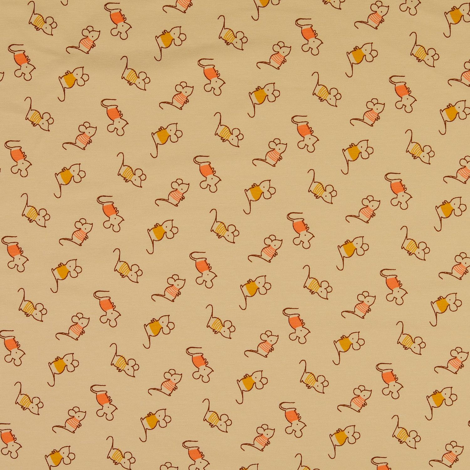 Dit betoverende jersey-ontwerp verleidt met een warme abrikooskleur die meteen een goed humeur verspreidt. Kleine, liefdevol ontworpen muizen dartelen erop rond, getekend met fijne lijnen en subtiele details, waardoor de stof een speels maar toch stijlvol karakter krijgt.