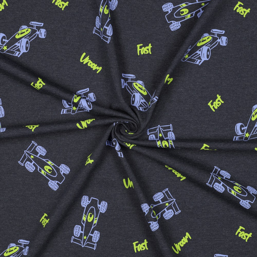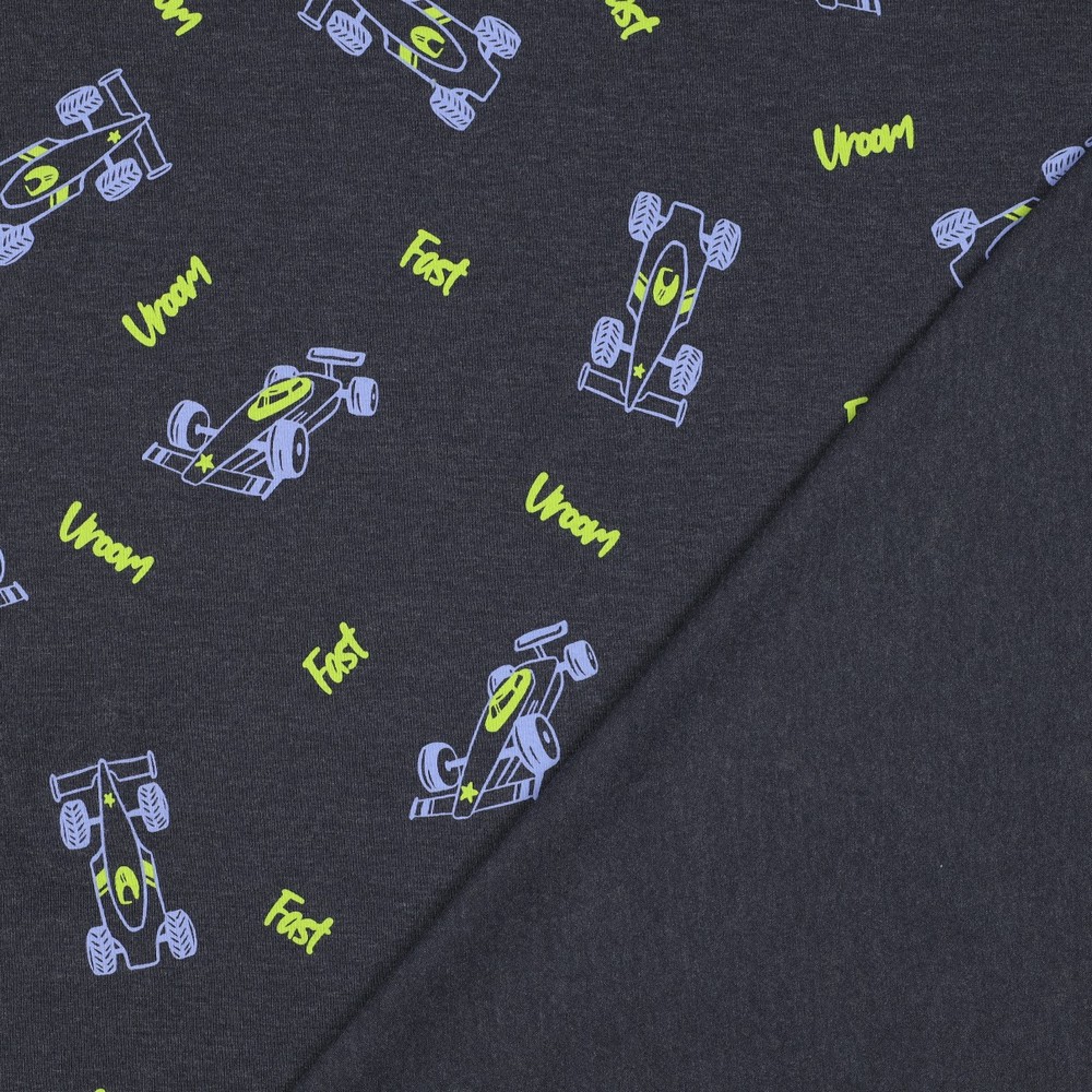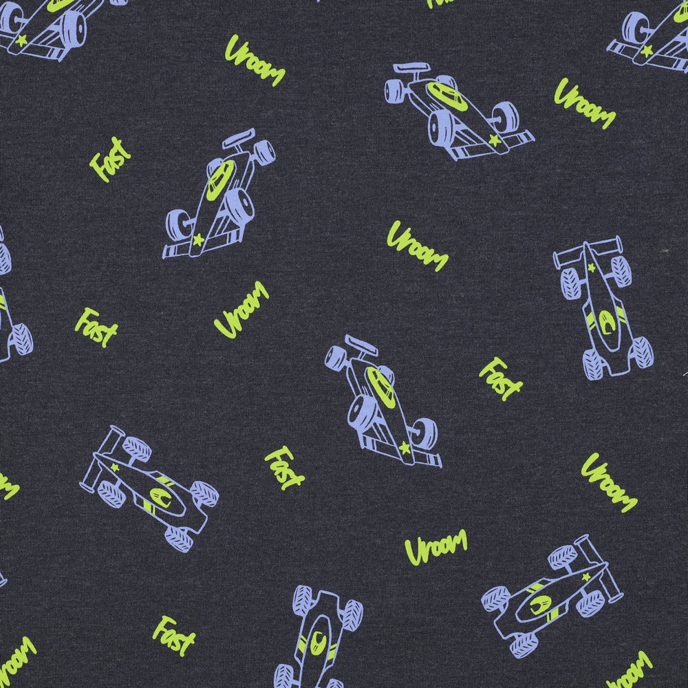 Hier komt snelheid in de kledingkast! Op een casual grijs gemêleerde achtergrond racen kleine raceauto's in felle kleuren over de stof – sportieve bolides in rood, blauw en geel worden afgewisseld met subtiele details zoals startnummers en strepen.