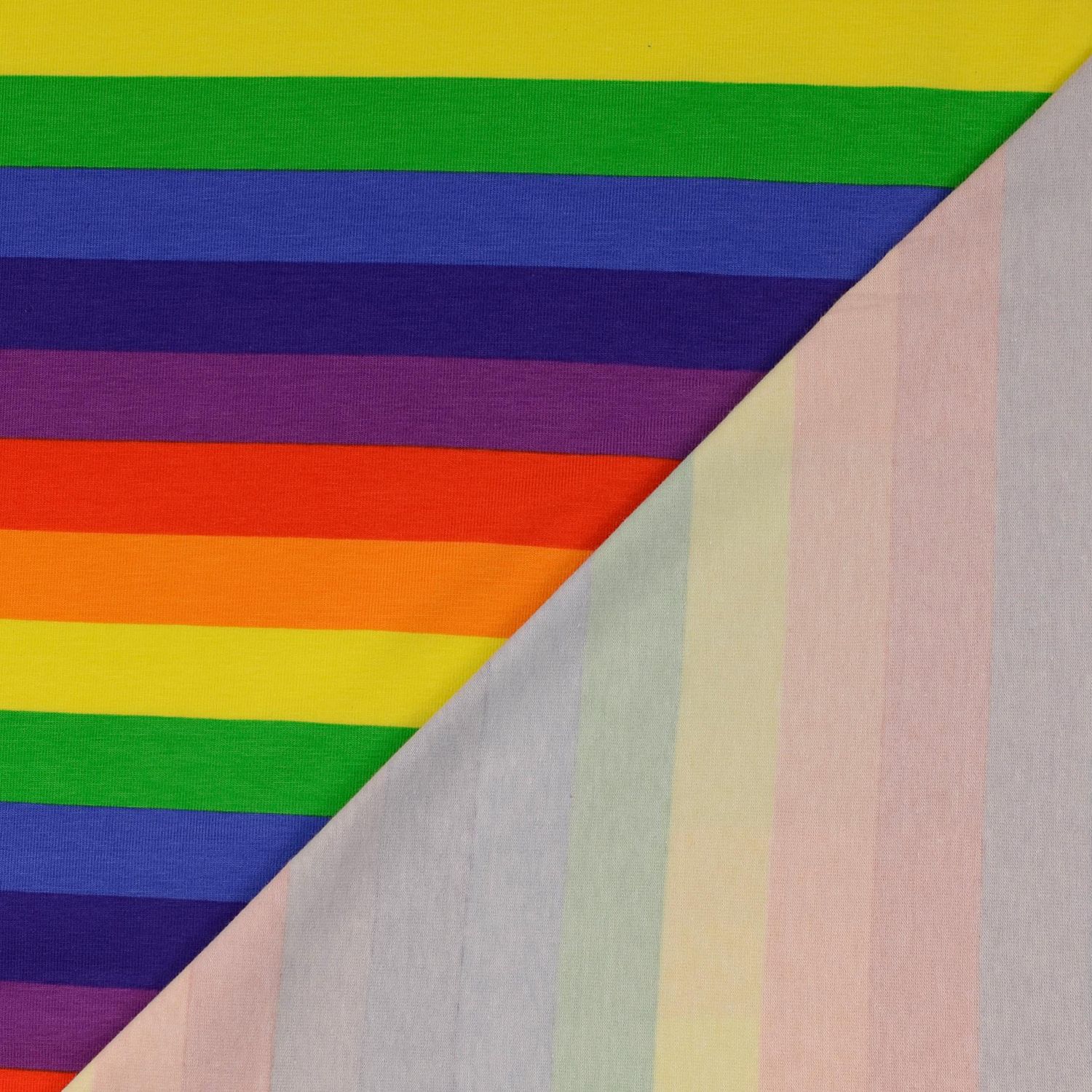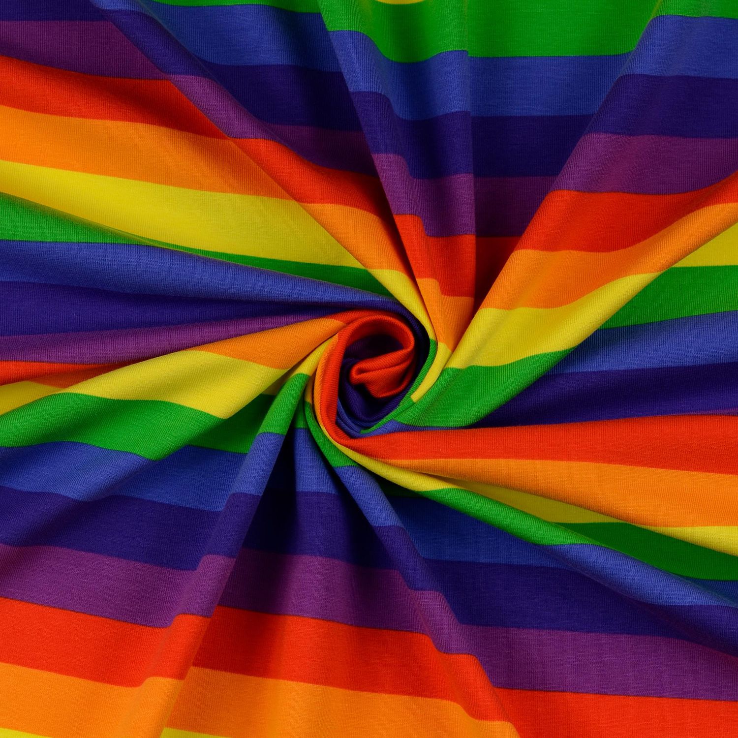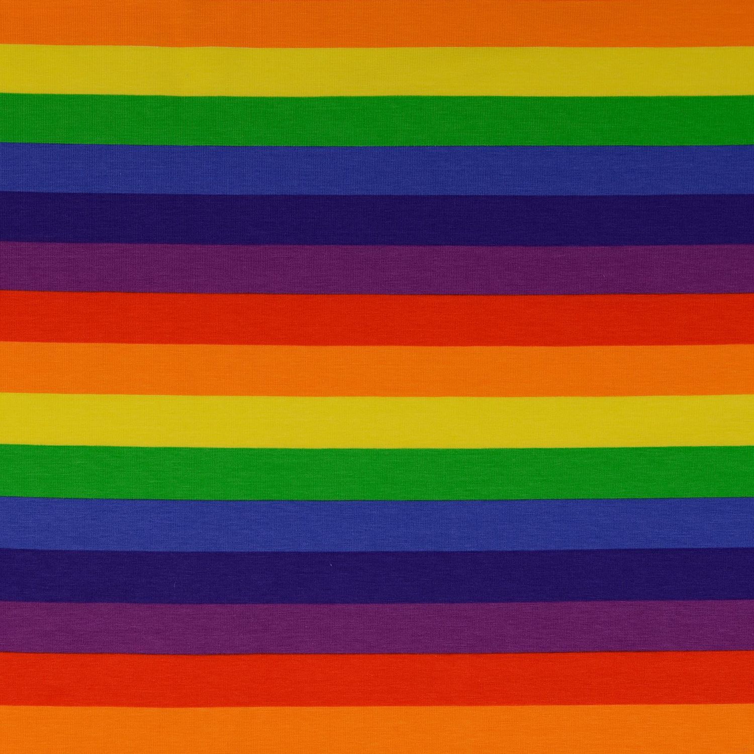 Deze vrolijke jersey brengt kleur in elk naai-project: Stevige, brede blokstrepen in heldere regenboogkleuren staan harmonieus naast elkaar – van warme rood- en oranjetinten tot zonnig geel, fris groen, stralend blauw en levendig roze.
