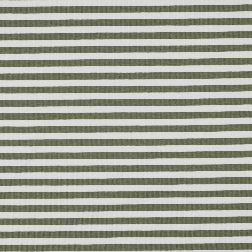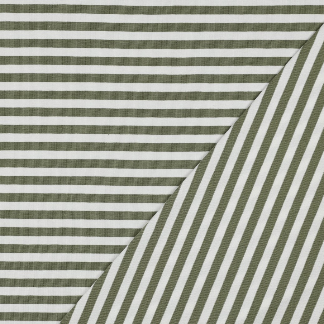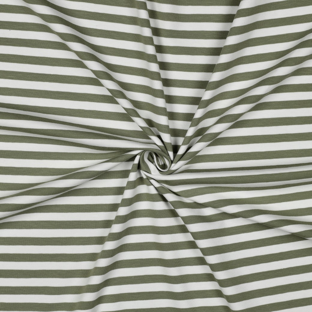Deze garengeverfde jersey valt op door het tijdloze gestreepte ontwerp in fris wit en elegant olijf. De fijne, gelijkmatige strepen ogen modern en toch natuurlijk – perfect voor iedereen die houdt van eenvoudige patronen met een bijzondere charme.