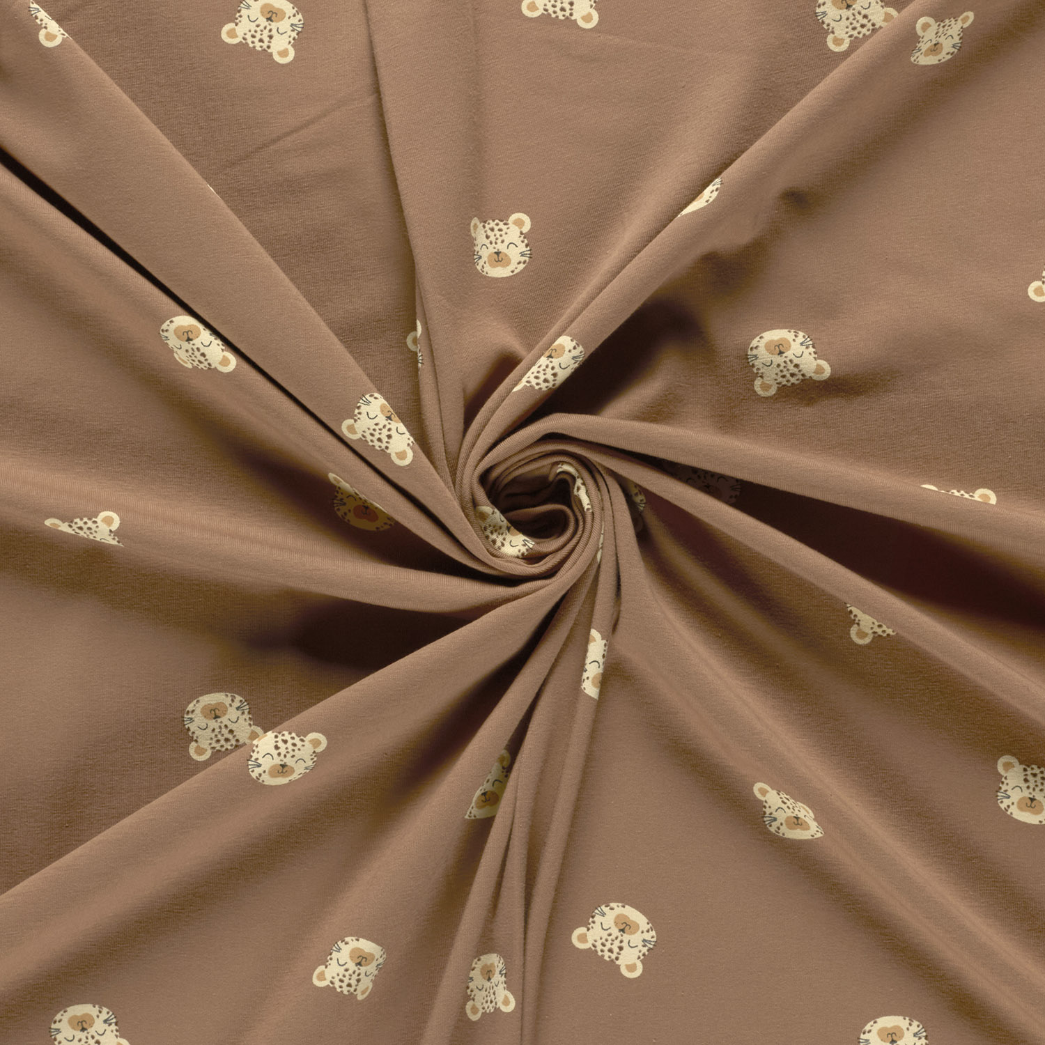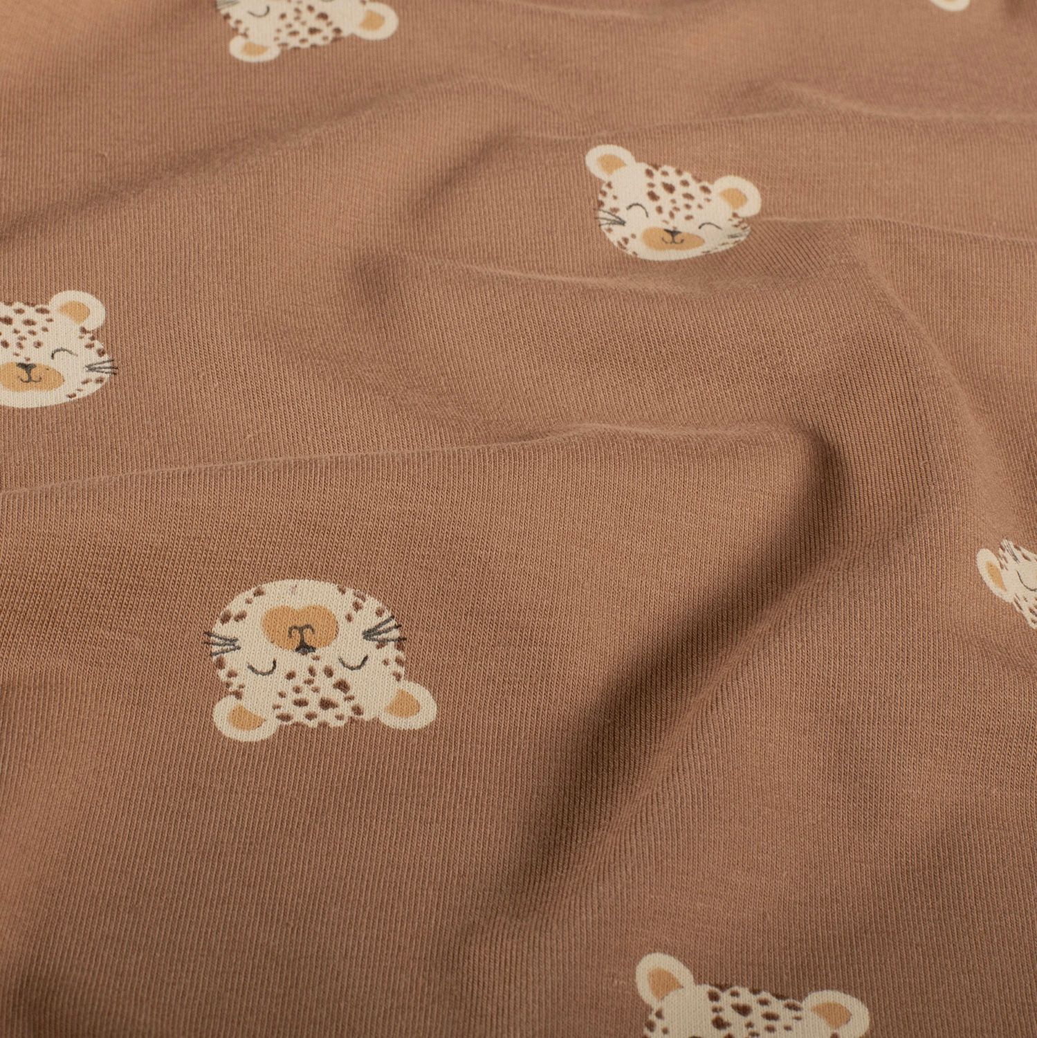 Deze jersey brengt de wilde schoonheid van de jungle direct naar je naaitafel. Op een warme bruine achtergrond stralen indrukwekkende tijgerkoppen met fijne contouren en expressieve gezichten – een echte blikvanger voor grote en kleine roofdierfans.