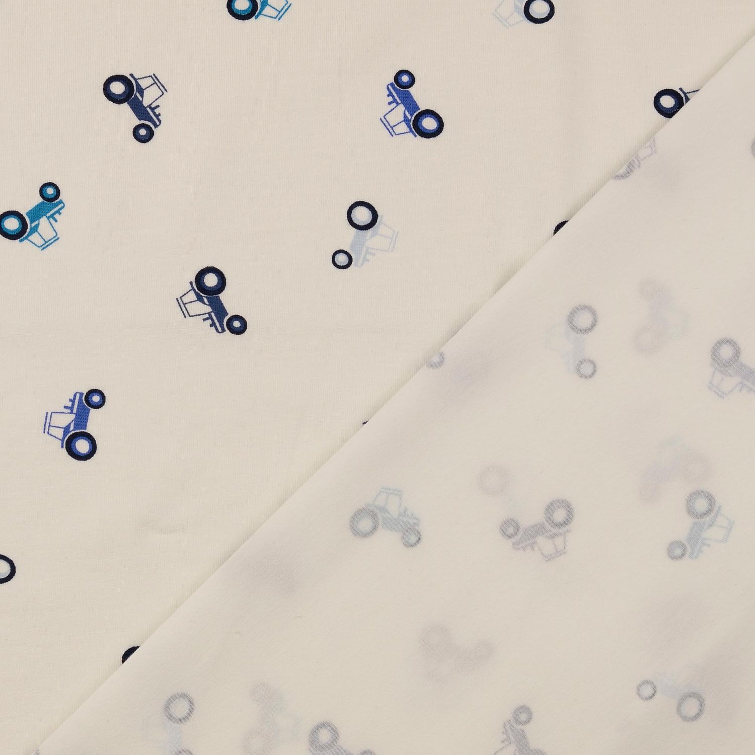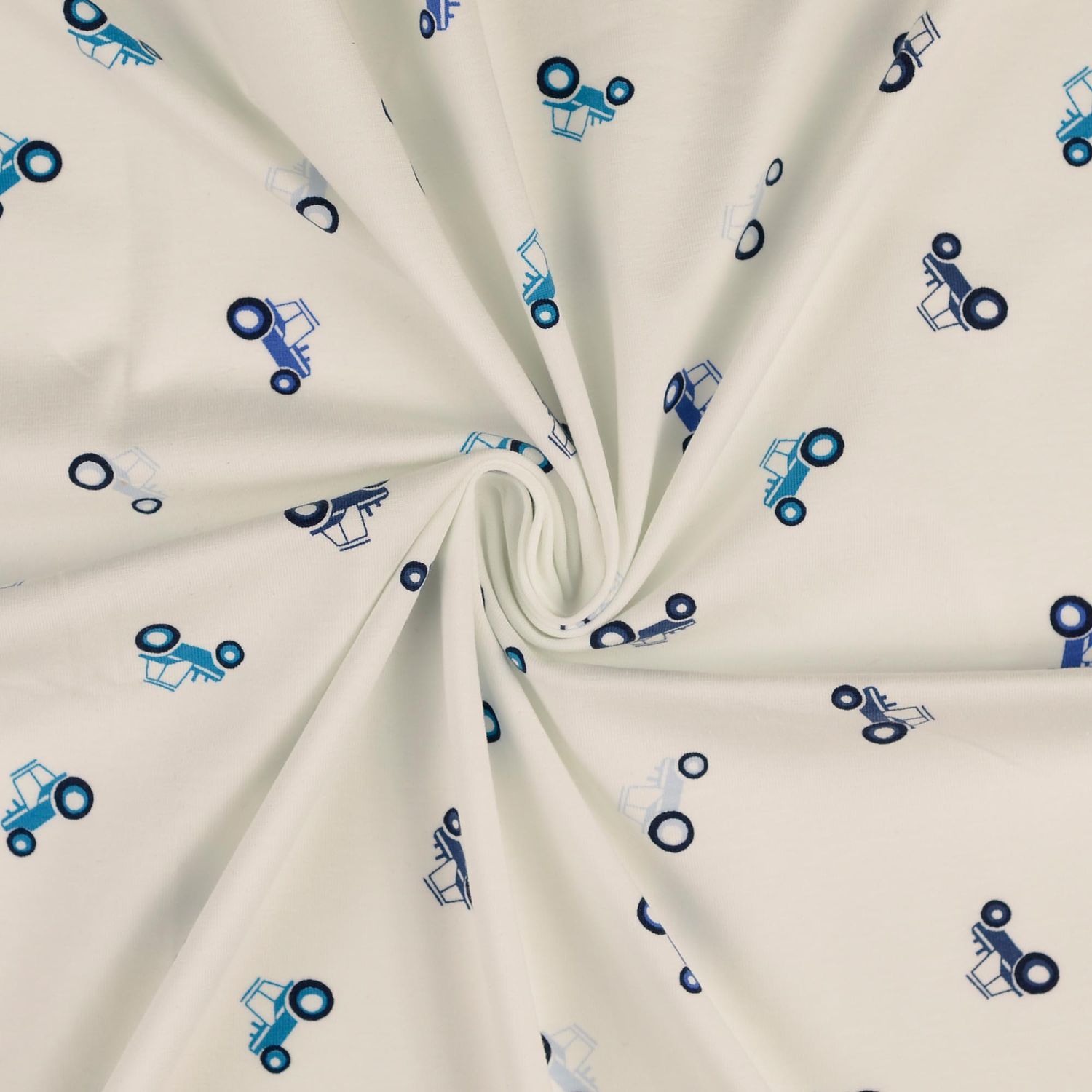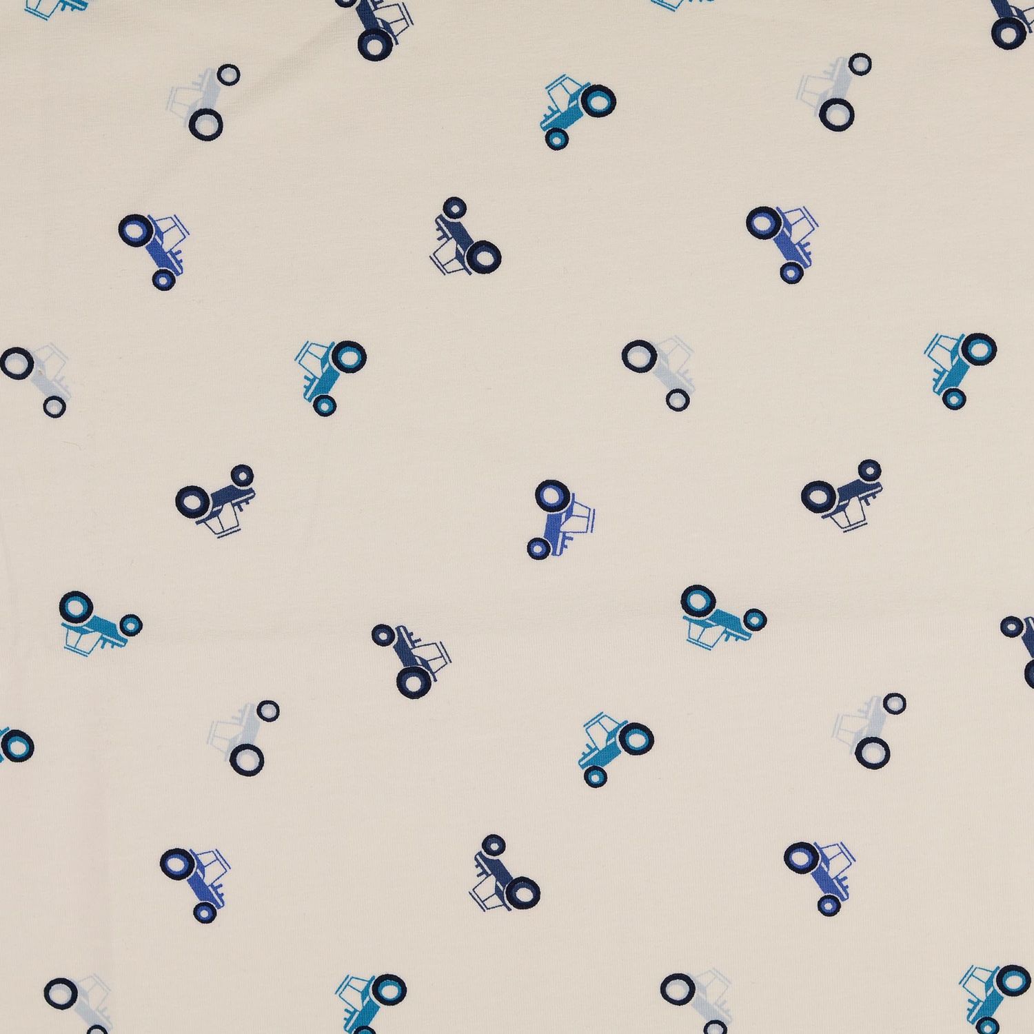 Hier is de perfecte stof voor kleine en grote tractorfans! Op een stralend witte achtergrond rijden gedetailleerd geïllustreerde tractoren in krachtig blauw over het oppervlak. Fijne contouren en liefdevolle details zoals wielen, motorkap en bestuurderscabine laten de voertuigen levendig lijken zonder het ontwerp te overladen.