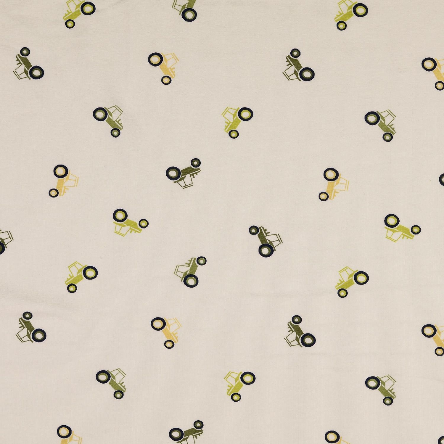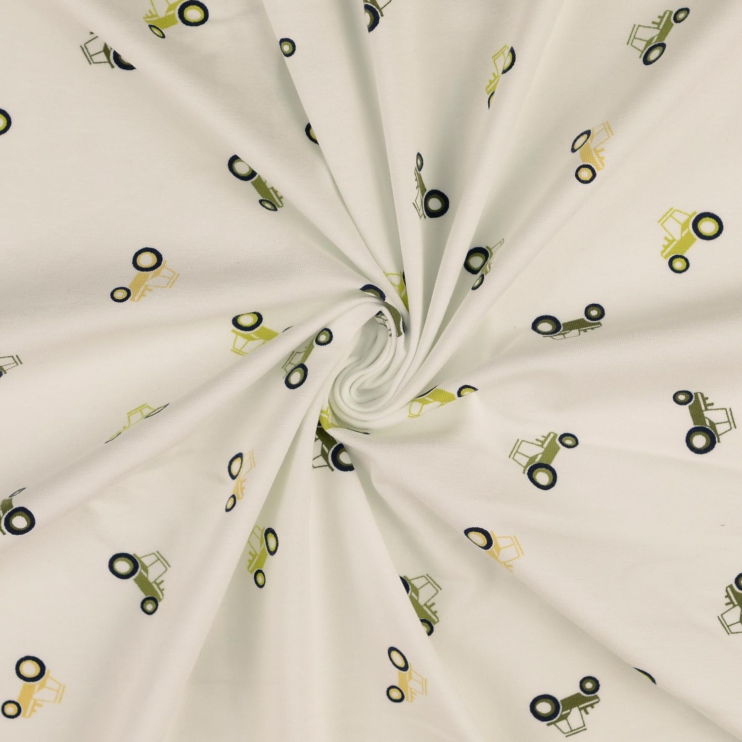 Een stof die kinderharten sneller doet kloppen: op een stralend witte achtergrond rijden vrolijke groene tractoren over de stof. De liefdevol ontworpen voertuigen zitten vol met kleine details – van de grote wielen tot de bestuurderscabine – en lijken rechtstreeks uit het favoriete boerderijverhaal te komen.