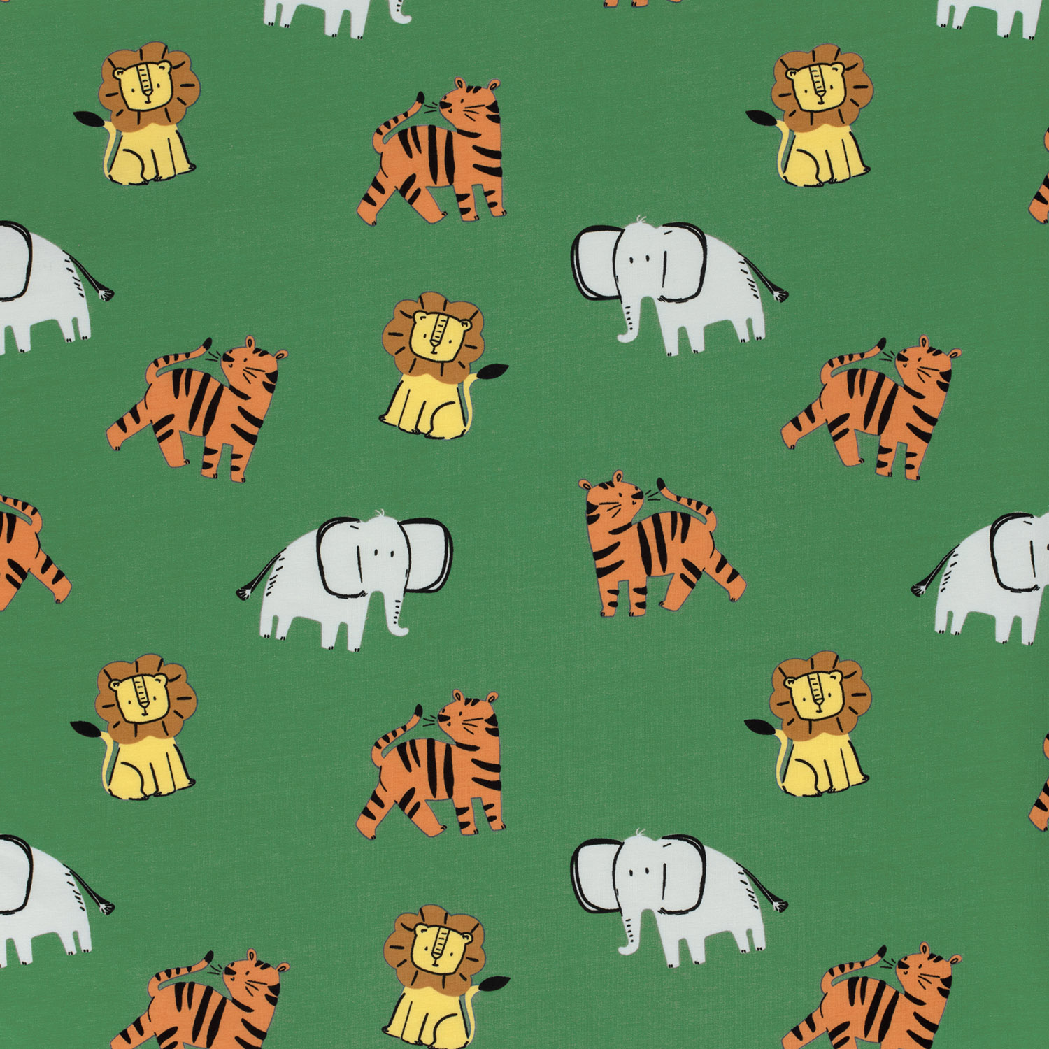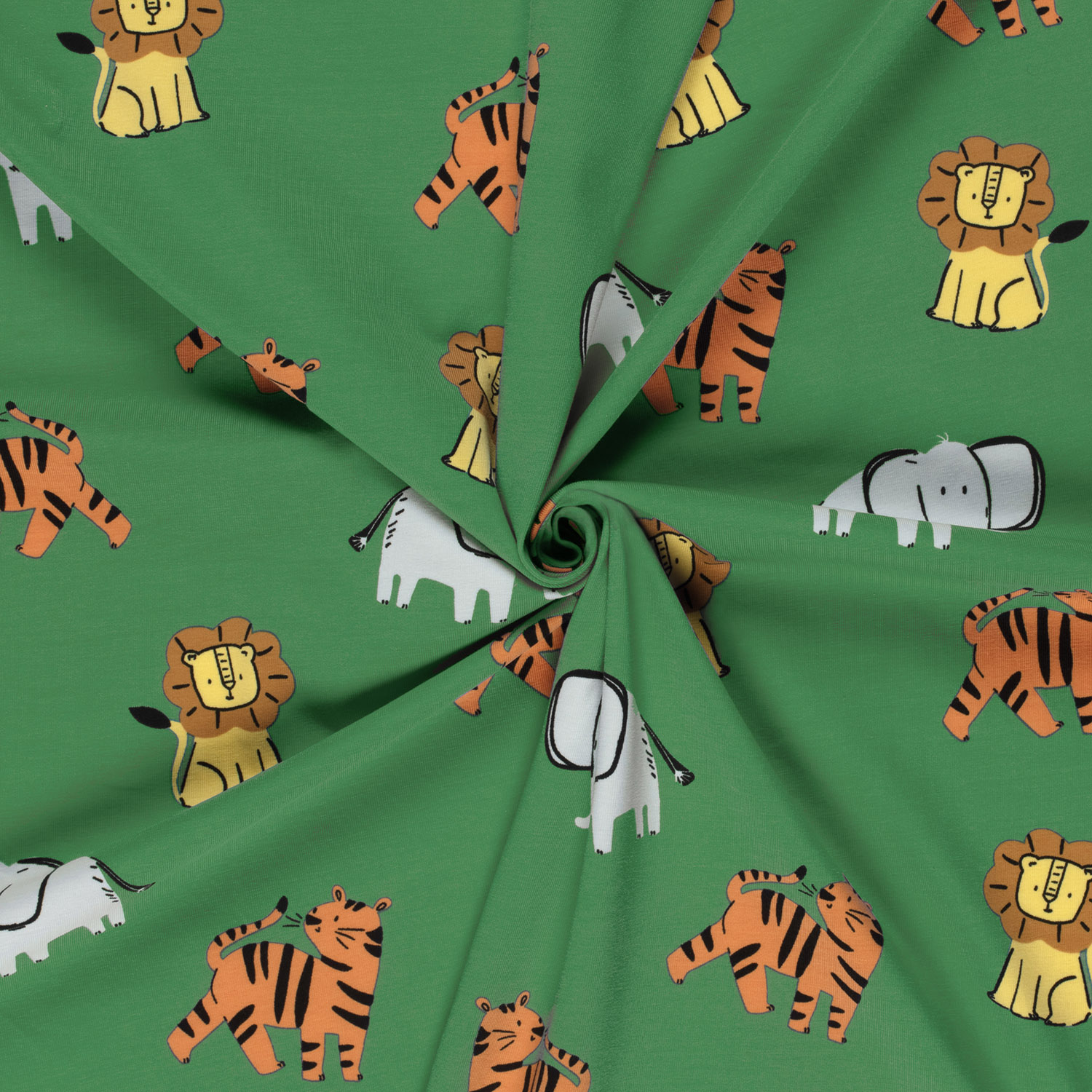 Een stof als een kleine excursie naar de jungle: Op een diep groene achtergrond dartelen vrolijke, liefdevol geïllustreerde wilde dieren – van nieuwsgierige leeuwen tot blije apen en olifanten en giraffen. De warme natuurtinten van de dieren steken prachtig af tegen de frisse groene achtergrond en creëren een levendig maar harmonieus geheel.