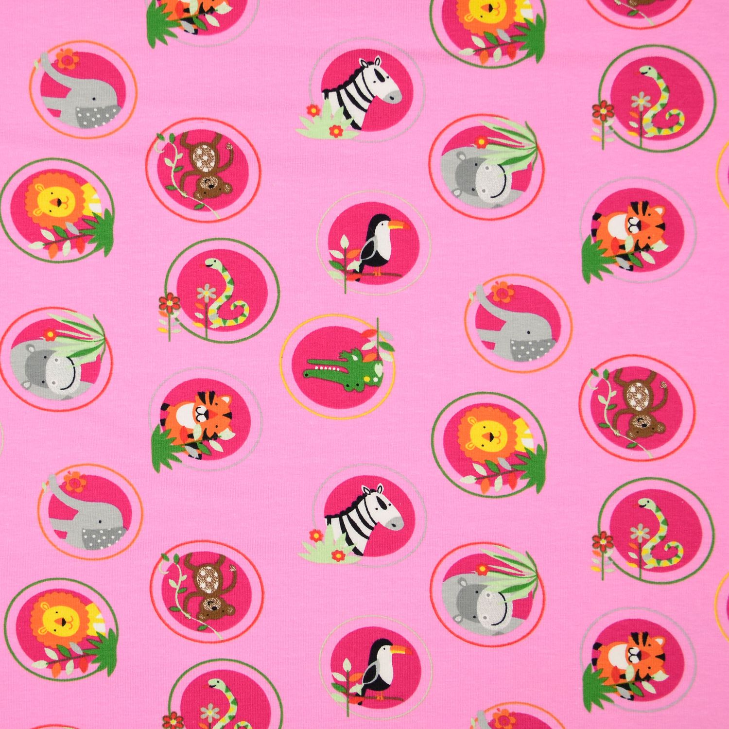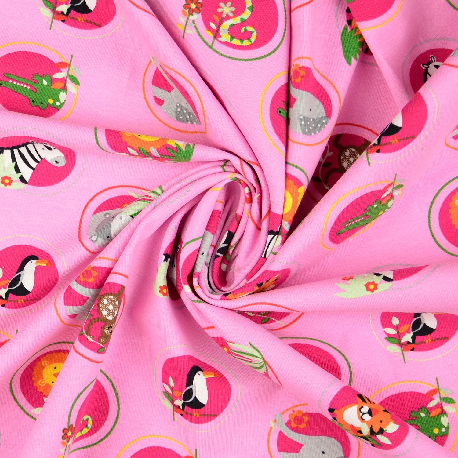 Deze betoverende jersey laat kinderogen stralen: op een zachte roze achtergrond spelen schattige zoo-dieren – slang, tijger, nijlpaard, olifant, kaketoe en zebra – elk gerangschikt in decoratieve cirkels. De liefdevol geïllustreerde dieren zijn vrolijk, maar niet te fel, waardoor ze bijzonder harmonieus en kindvriendelijk overkomen.