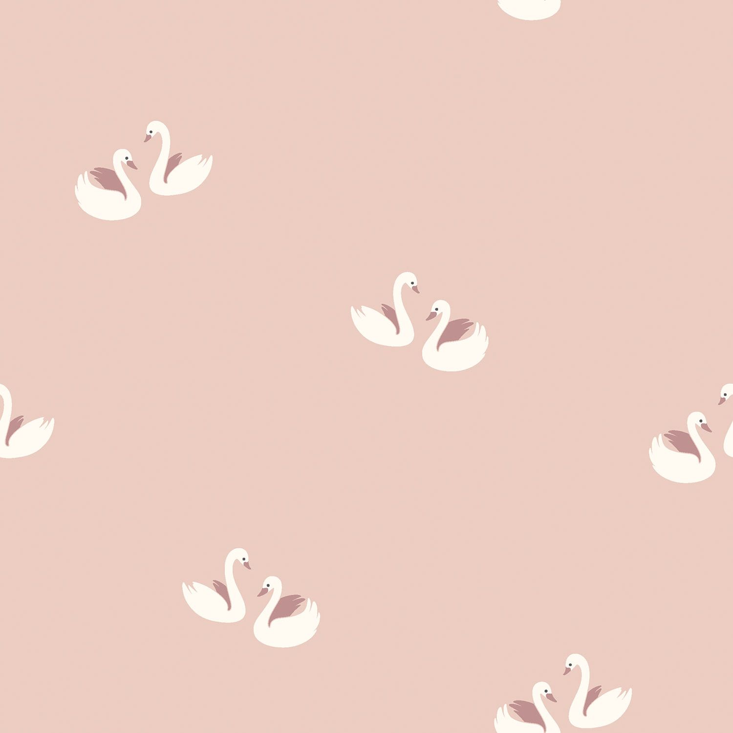 Een zachte zalmroze vormt het droomdecor voor dit romantische zwaanontwerp. Gracieze witte zwanen met fijne details drijven als op een stille vijver, omgeven door subtiele, florale accenten en kleine, liefdevol ontworpen ornamenten.