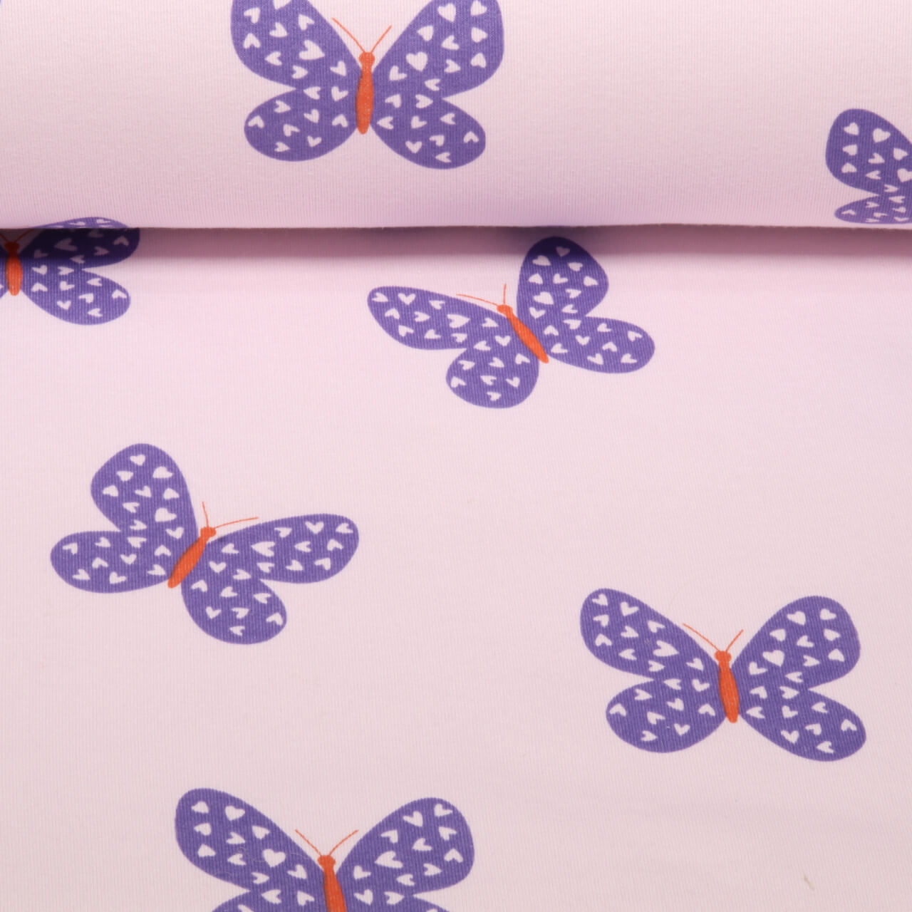 Een droom voor vlinderfans jong en oud: delicate vlinders fladderen op een zachtroze achtergrond in zachte pasteltinten - van licht lila tot poederroze en subtiel beige. De gedetailleerde vleugeltekeningen geven de stof een speels, bijna sprookjesachtig tintje zonder te bont of onrustig over te komen.