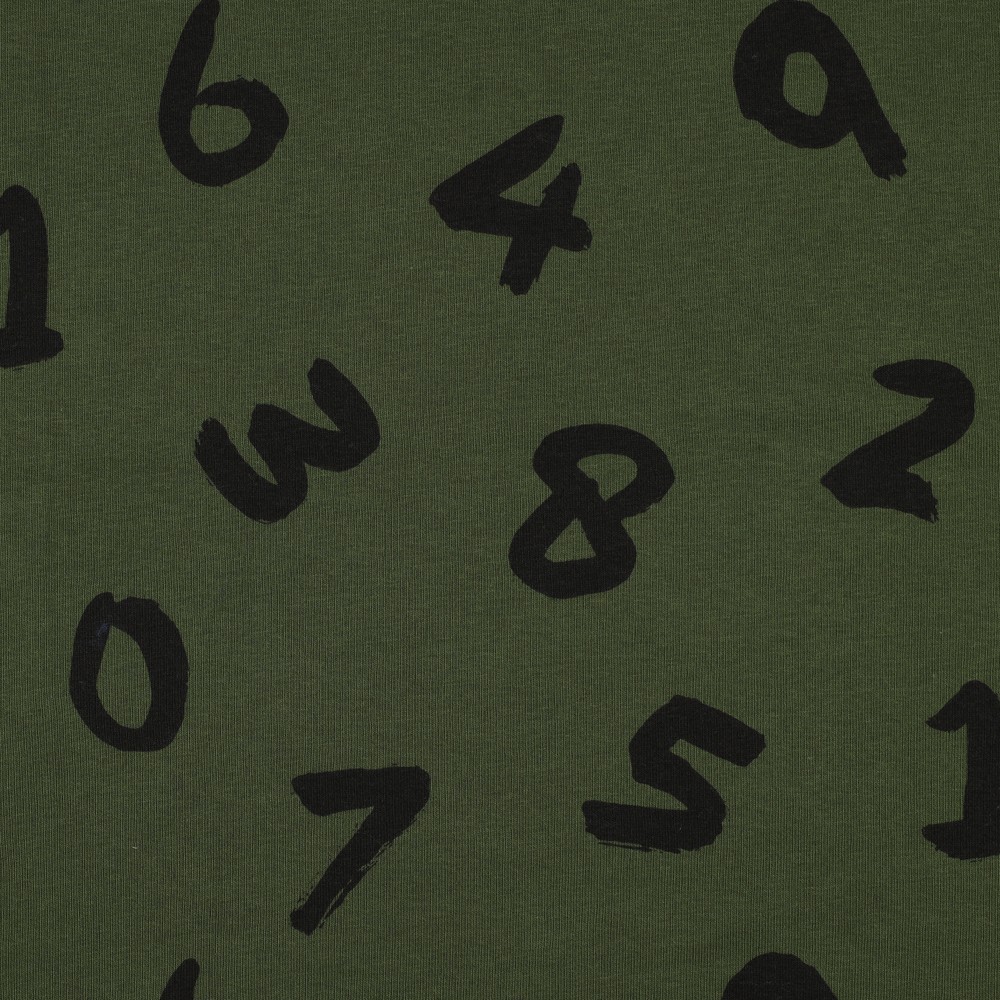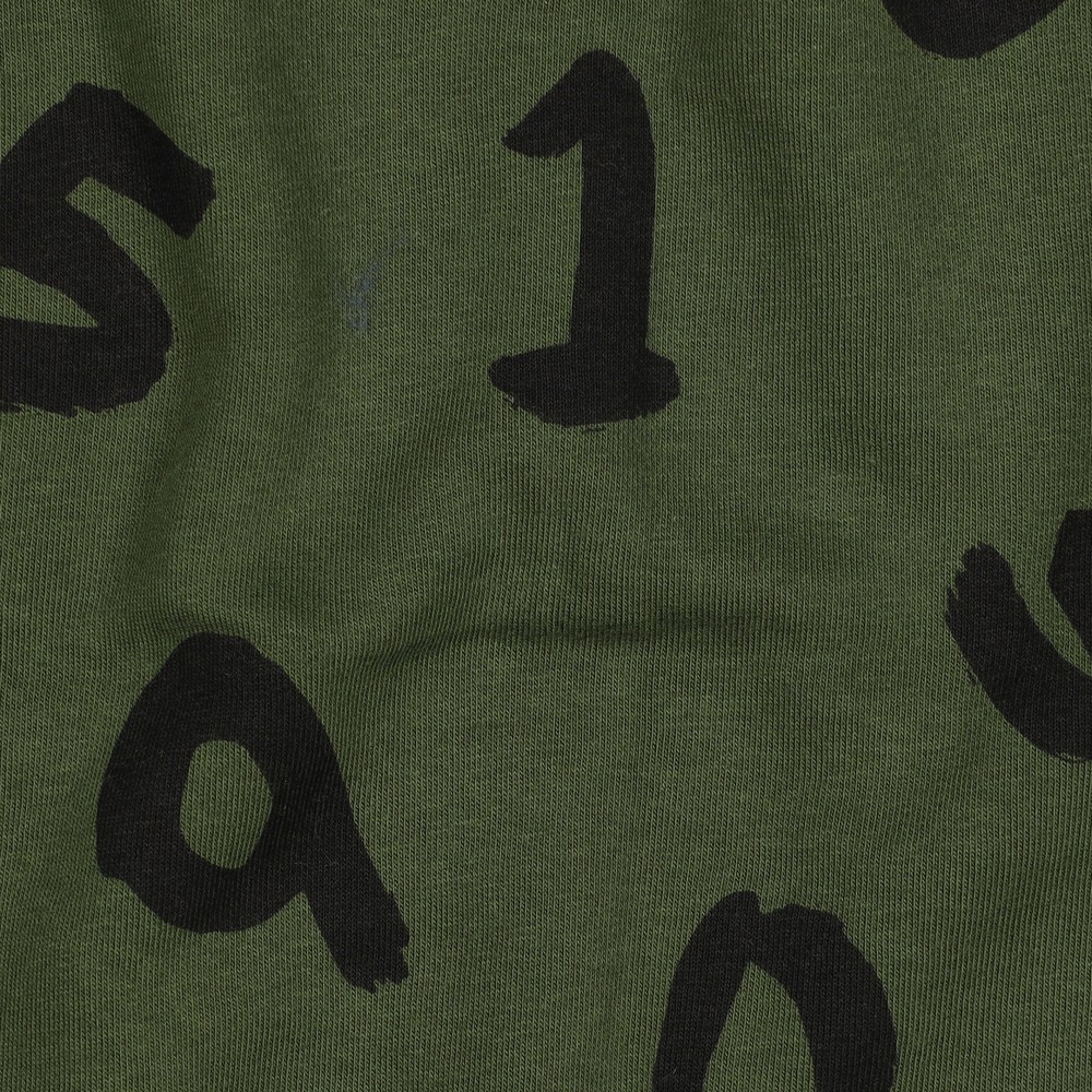 Deze sportieve jersey in diep armygroen trekt alle blikken met zijn coole cijfersdesign. Grote, opvallende cijfers in lichte beige- en natuurtinten zijn verspreid over de stof, deels met een licht 'vervaagd' uiterlijk – als een relaxte mix van college-stijl en streetwear.