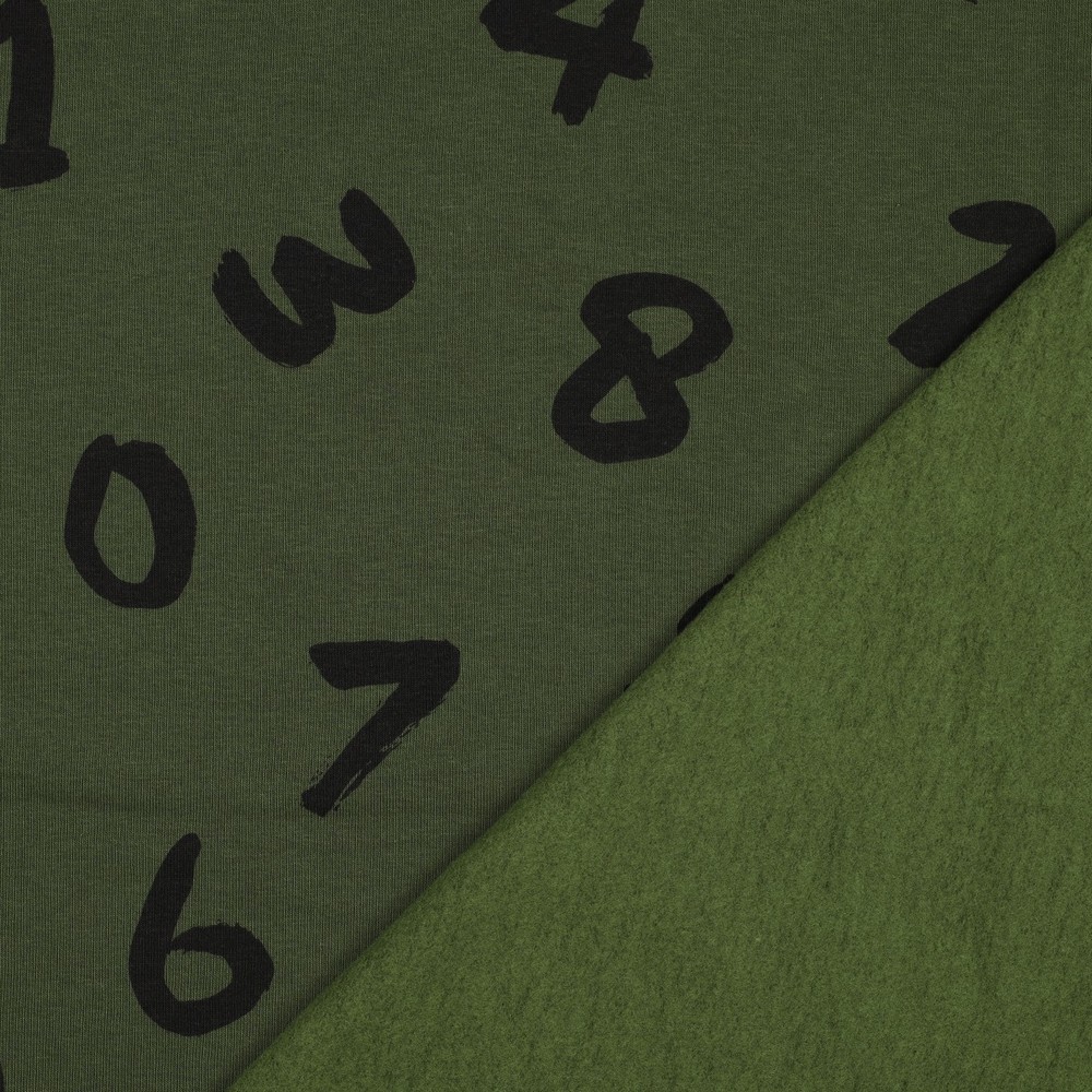Het harmonieuze contrast tussen het donkere groen en de subtiele lichte cijfers maakt de stof perfect voor stijlvolle vrijetijdskleding: of het nu comfortabele joggingbroeken, hoodies, sweaters, jurken of comfortabele kinderkleding zijn – hier ontstaan favoriete stukken met een sportief karakter.
