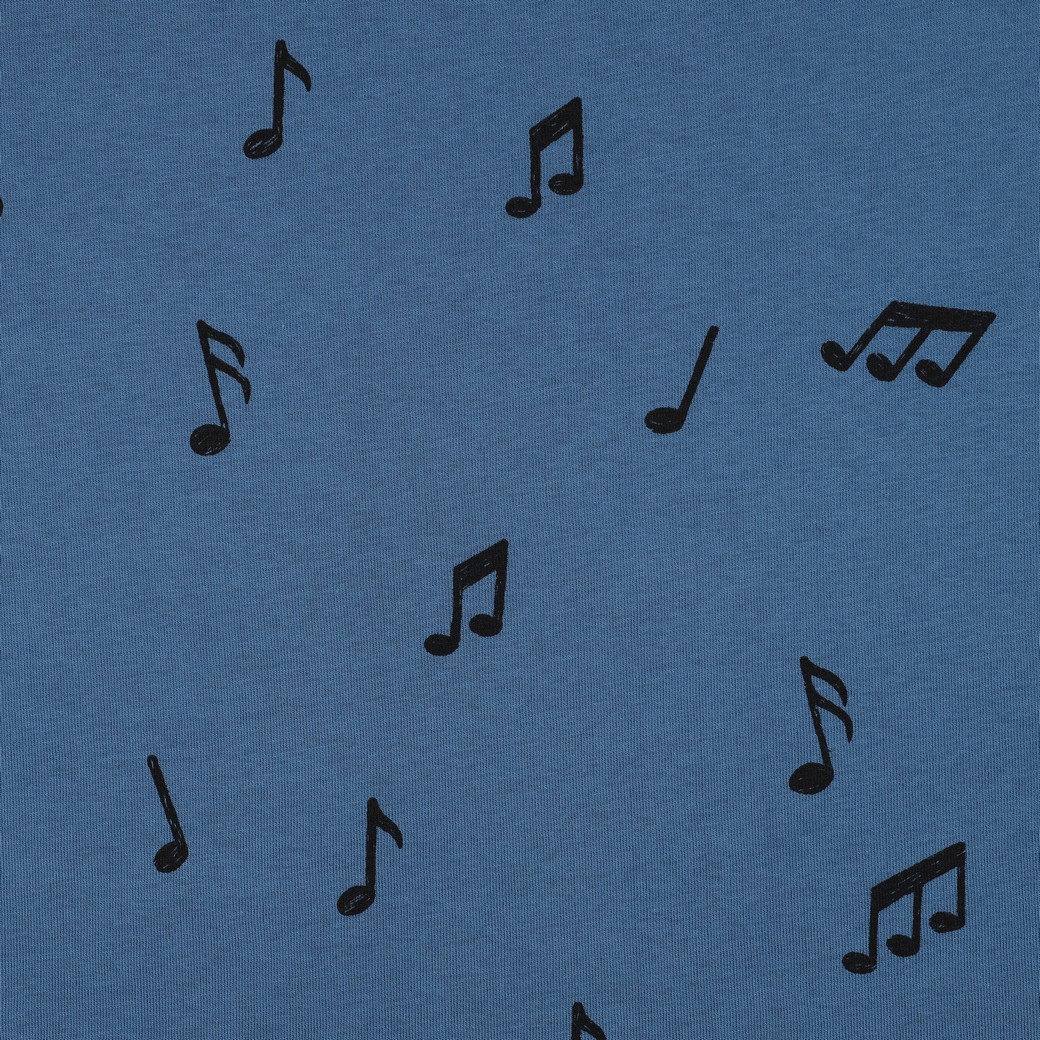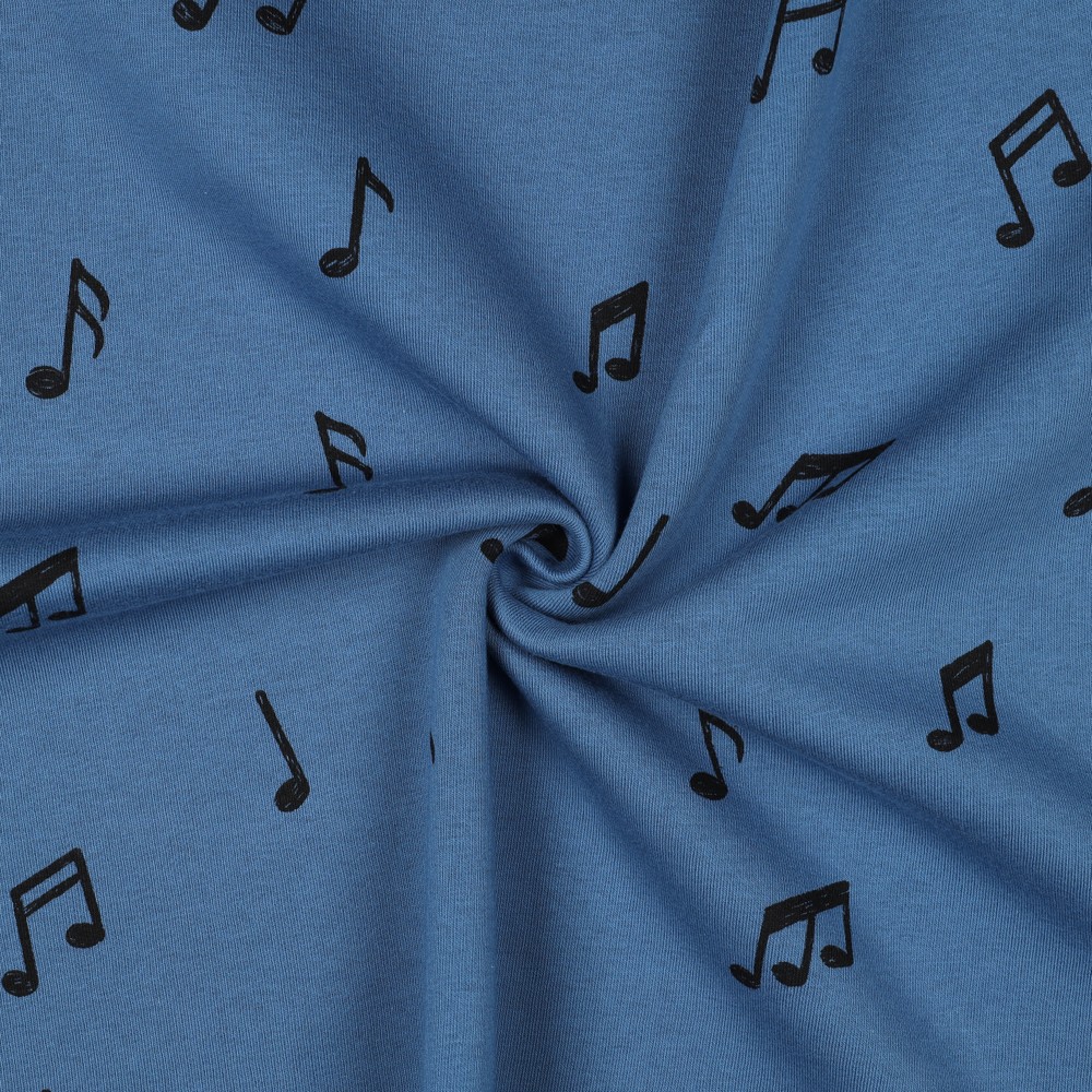 Een stof als muziek in het blauw: op deze zacht geborstelde joggingstof dansen speelse noten over een rijke, donkerblauwe achtergrond. De witte notensymbolen steken duidelijk en vrolijk af en geven het ontwerp een levendig, muzikaal karakter – perfect voor kleine en grote muziekliefhebbers.