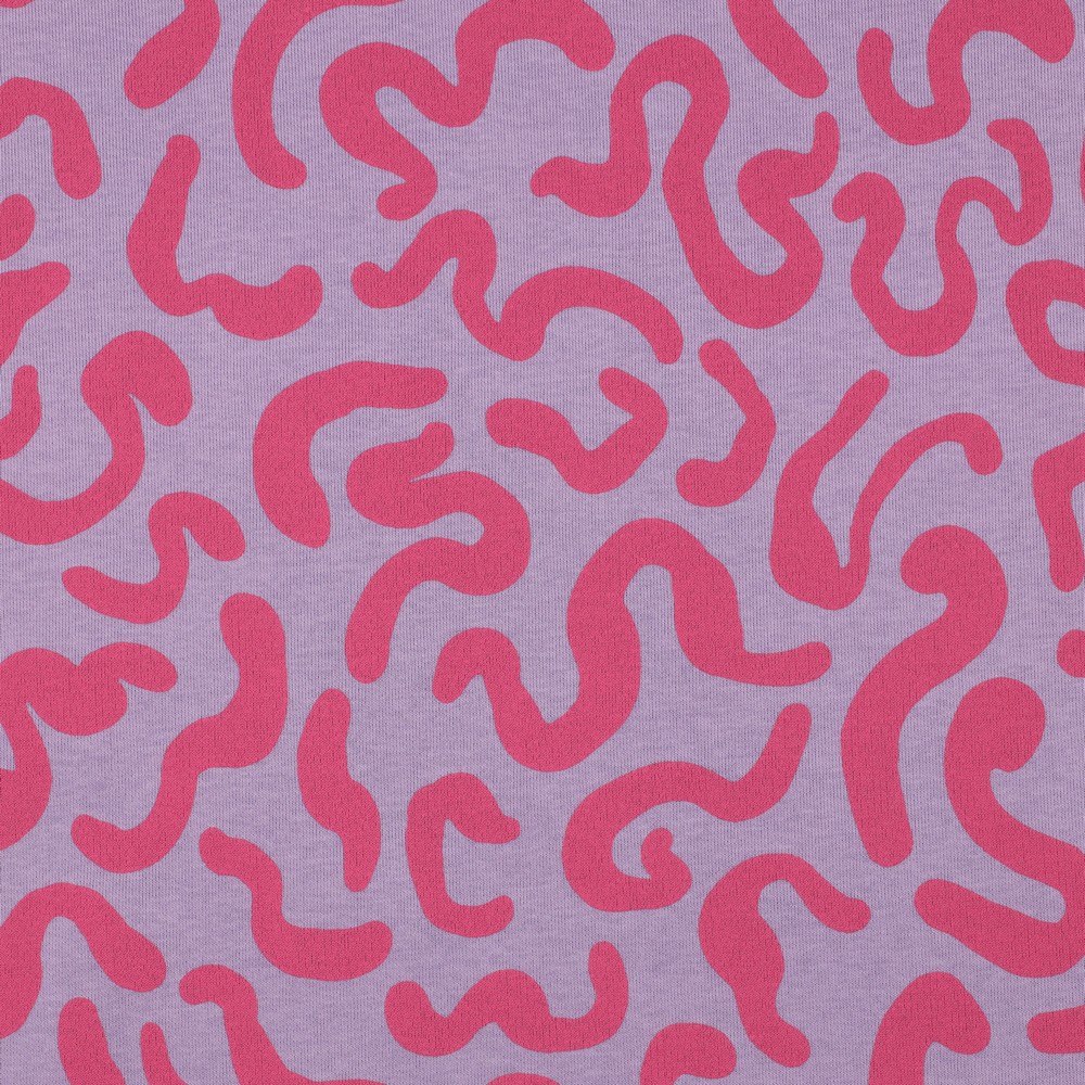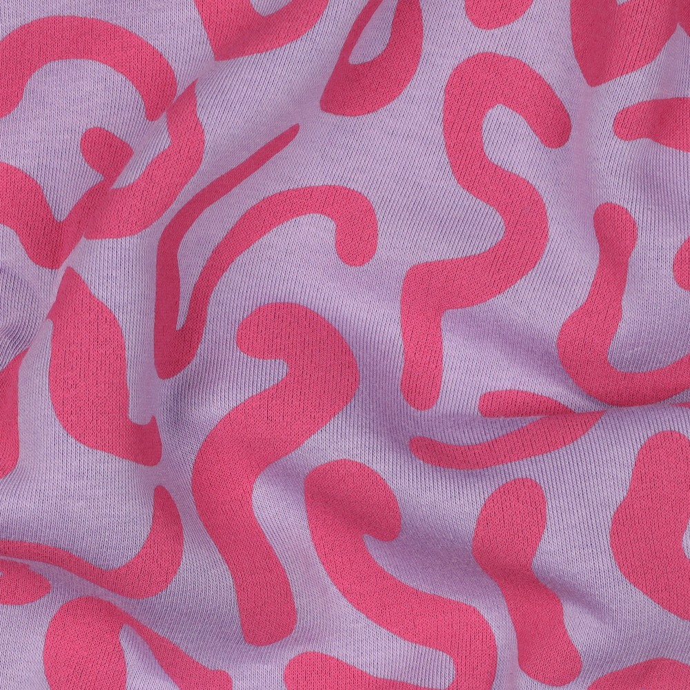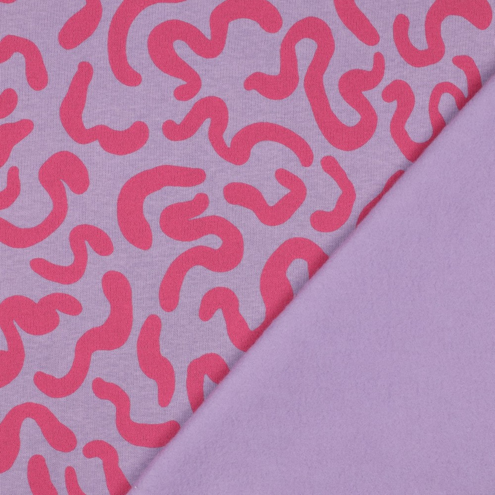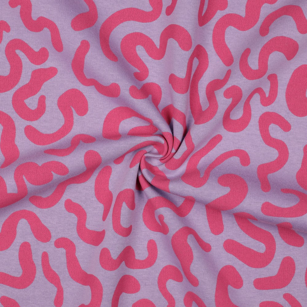 Zacht, speels en toch modern – deze prachtige joggingstof in lila betovert met zijn golvende lijnenspel. Zacht gebogen, lichte lijnen dansen over de lila achtergrond en geven de stof een levendige maar toch rustige uitstraling.