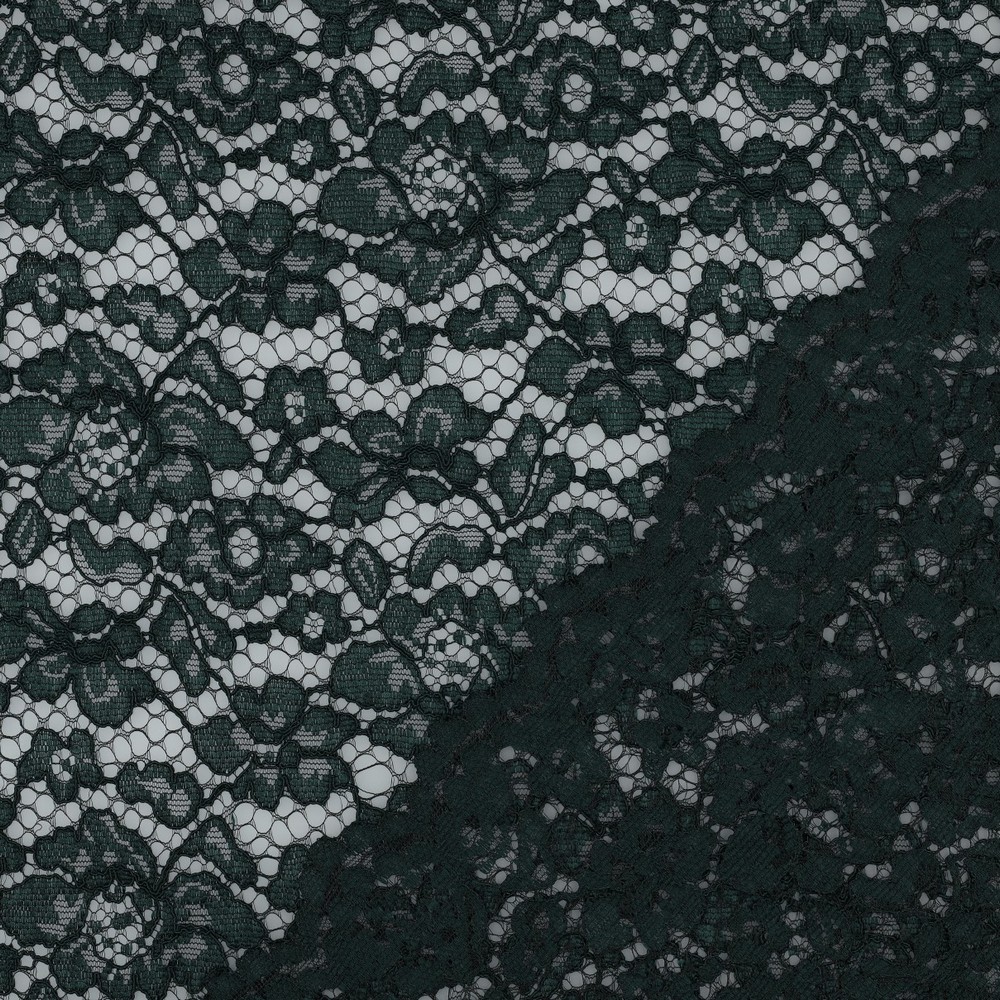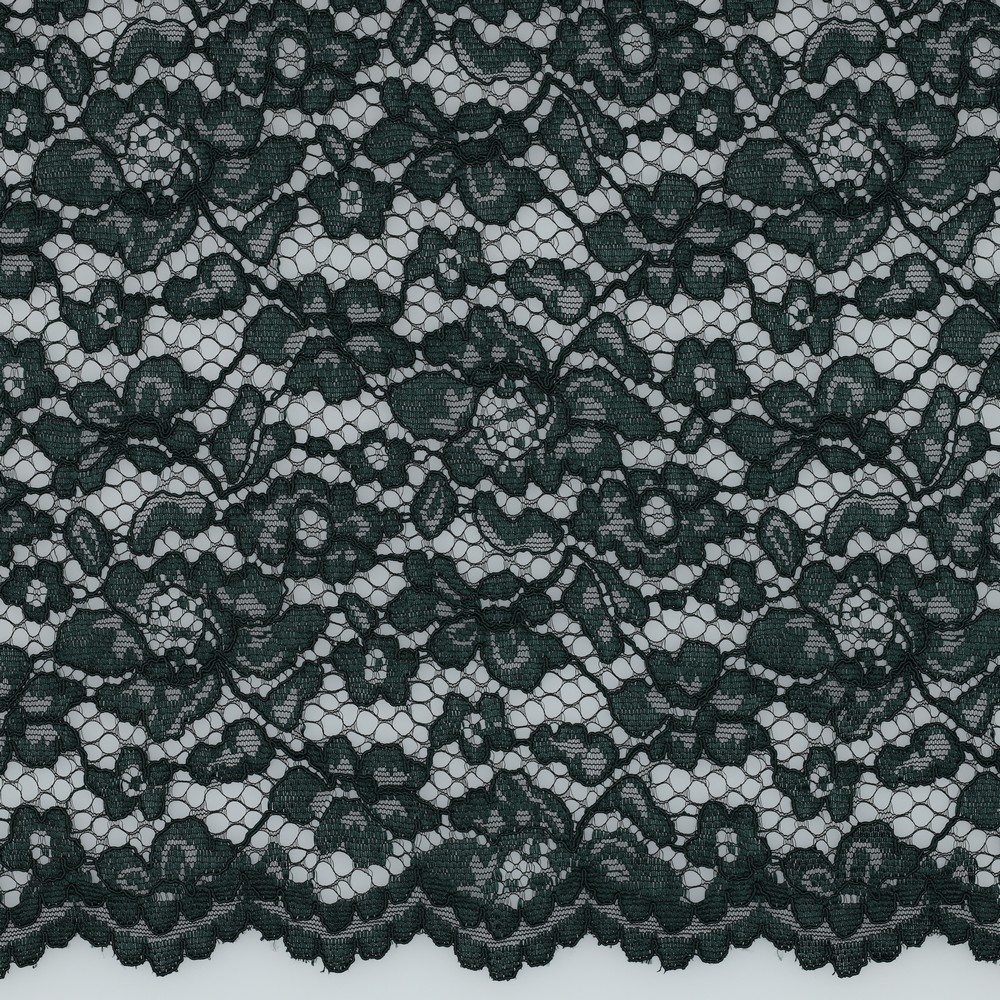 Een bijzonder detail is de dubbelzijdige, decoratieve boogrand (scallop-rand): deze kan direct worden gebruikt als verfijnde zoomafwerking en bespaart extra zomen. Qua greep doet deze kanten stof denken aan een hoogwaardige modestof, aangenaam stevig en vormvast, zodat hij zijn contour behoudt en patronen en silhouetten duidelijk tot hun recht komen.