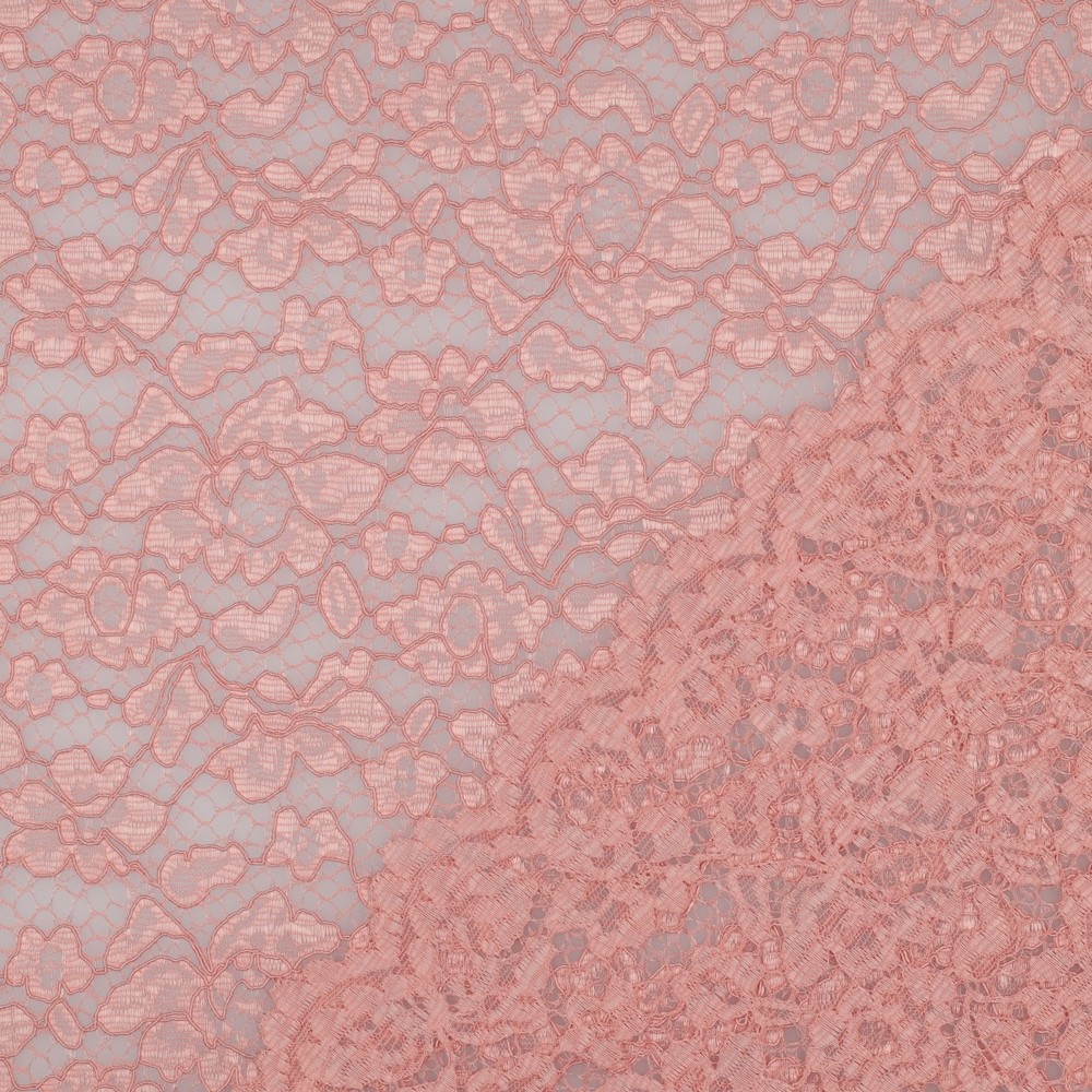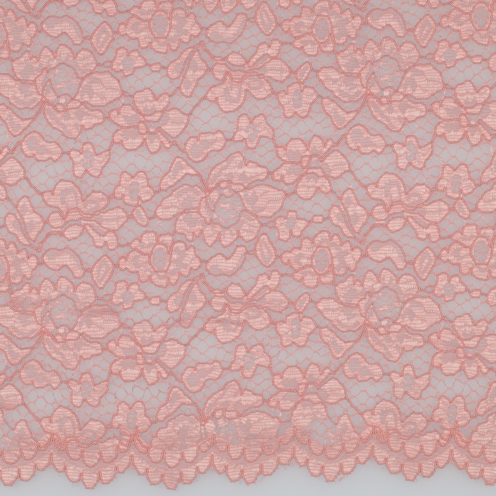 Een bijzonder detail is de dubbelzijdige, decoratieve boogrand (scallop-rand): deze kan direct worden gebruikt als verfijnde zoomafwerking en bespaart extra zomen. Qua greep doet deze kanten stof denken aan een hoogwaardige modestof, aangenaam stevig en vormvast, zodat hij zijn contour behoudt en patronen en silhouetten duidelijk tot hun recht komen.