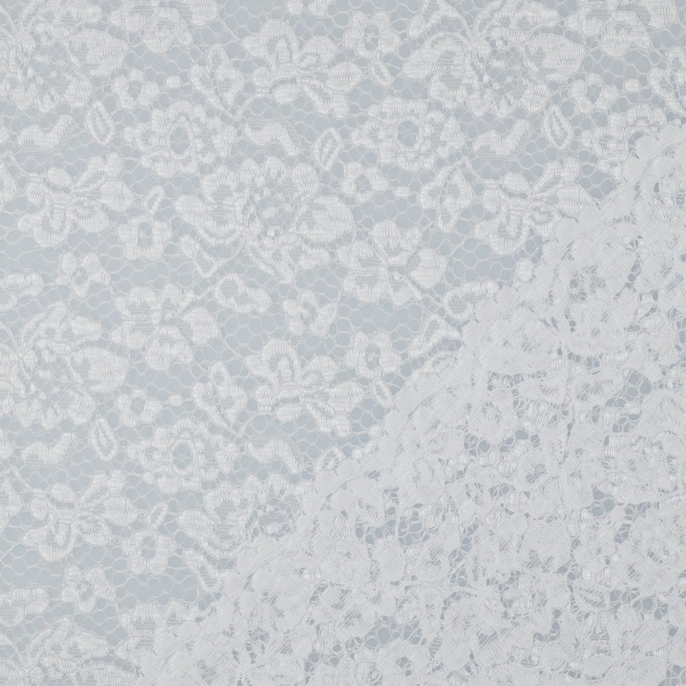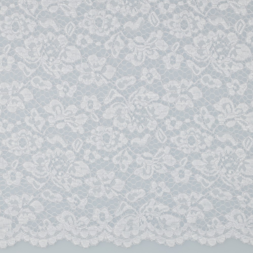 Een bijzonder detail is de dubbelzijdige, decoratieve boogrand (scallop-rand): deze kan direct worden gebruikt als verfijnde zoomafwerking en bespaart extra zomen. Qua greep doet deze kanten stof denken aan een hoogwaardige modestof, aangenaam stevig en vormvast, zodat hij zijn contour behoudt en patronen en silhouetten duidelijk tot hun recht komen.
