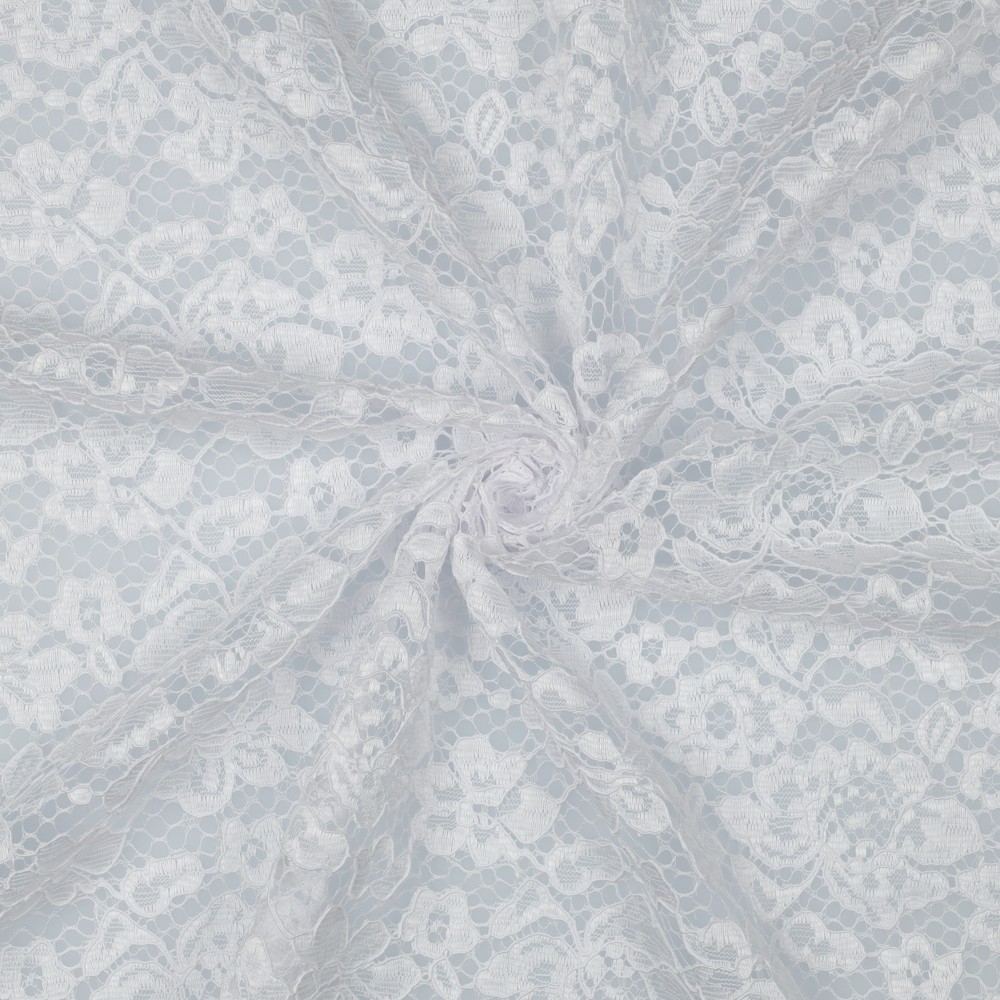 Deze verfijnde kanten stof trekt alle blikken naar zich toe: filigrane bloemslingers en kunstzinnige ornamenten spreiden zich uit over een transparante netbasis en creëren een romantische, licht nostalgische look. De kant straalt in intense kleuren – van diep bordeauxviolet via fris mint tot krachtig rood – en zorgt voor indrukwekkende contrasten die elk naaiproject tot een highlight maken.