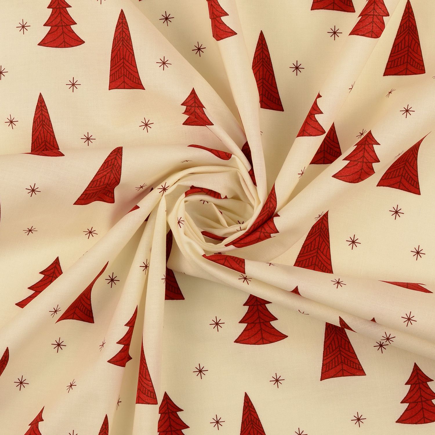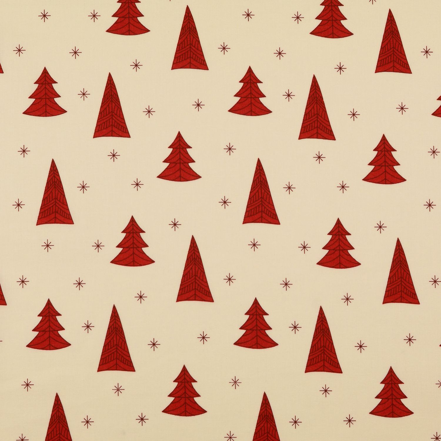 Een feestelijke katoenen stof die direct kerstsfeer oproept: op een zacht crèmekleurige achtergrond spelen kleine kerstboompjes en sterren in harmonieuze groentinten, warm rood en subtiel goudgeel. De liefdevol getekende kerstboompjes en fonkelende sterretjes ogen speels maar toch stijlvol – perfect voor een gezellige, moderne kerstdecoratie.