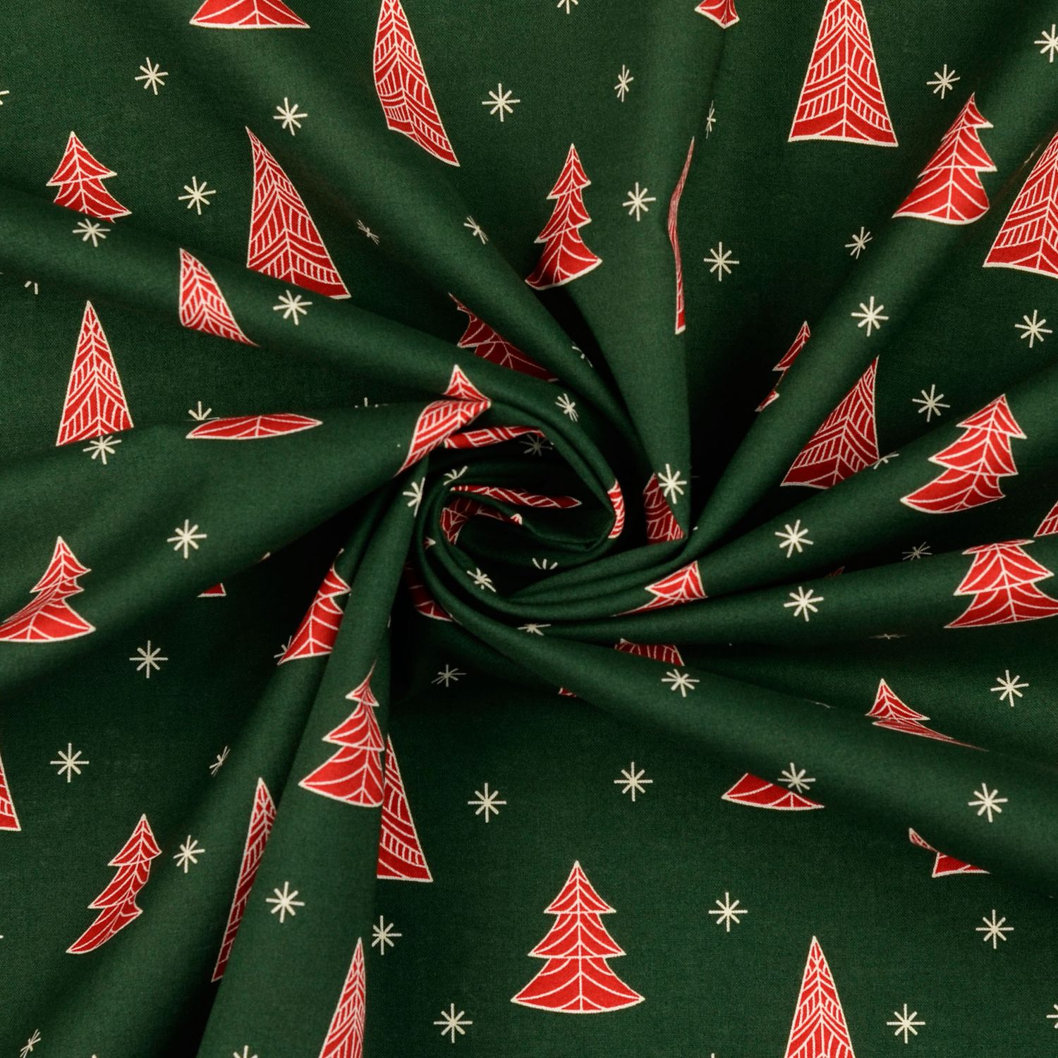 Een feestelijke katoenen stof als uit een winterwonderland: Op diep donkergroen dennenkleurige achtergrond spelen kleine, liefdevol ontworpen kerstbomen en delicate sterren. De dennenbomen variëren in vorm en grootte – soms eenvoudig, soms speels versierd – en worden omringd door fijne sterretjes en stipjes die lijken op fonkelende sneeuwval.