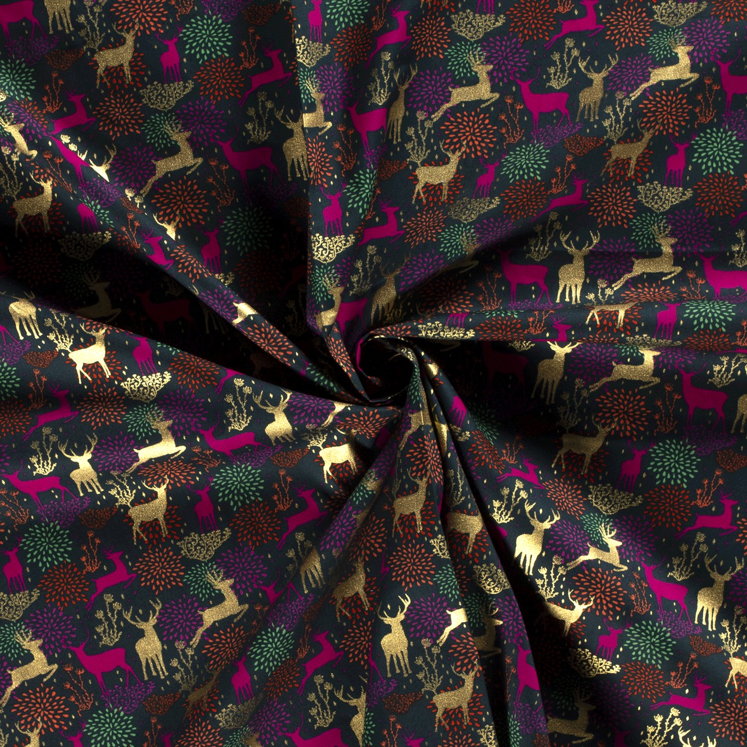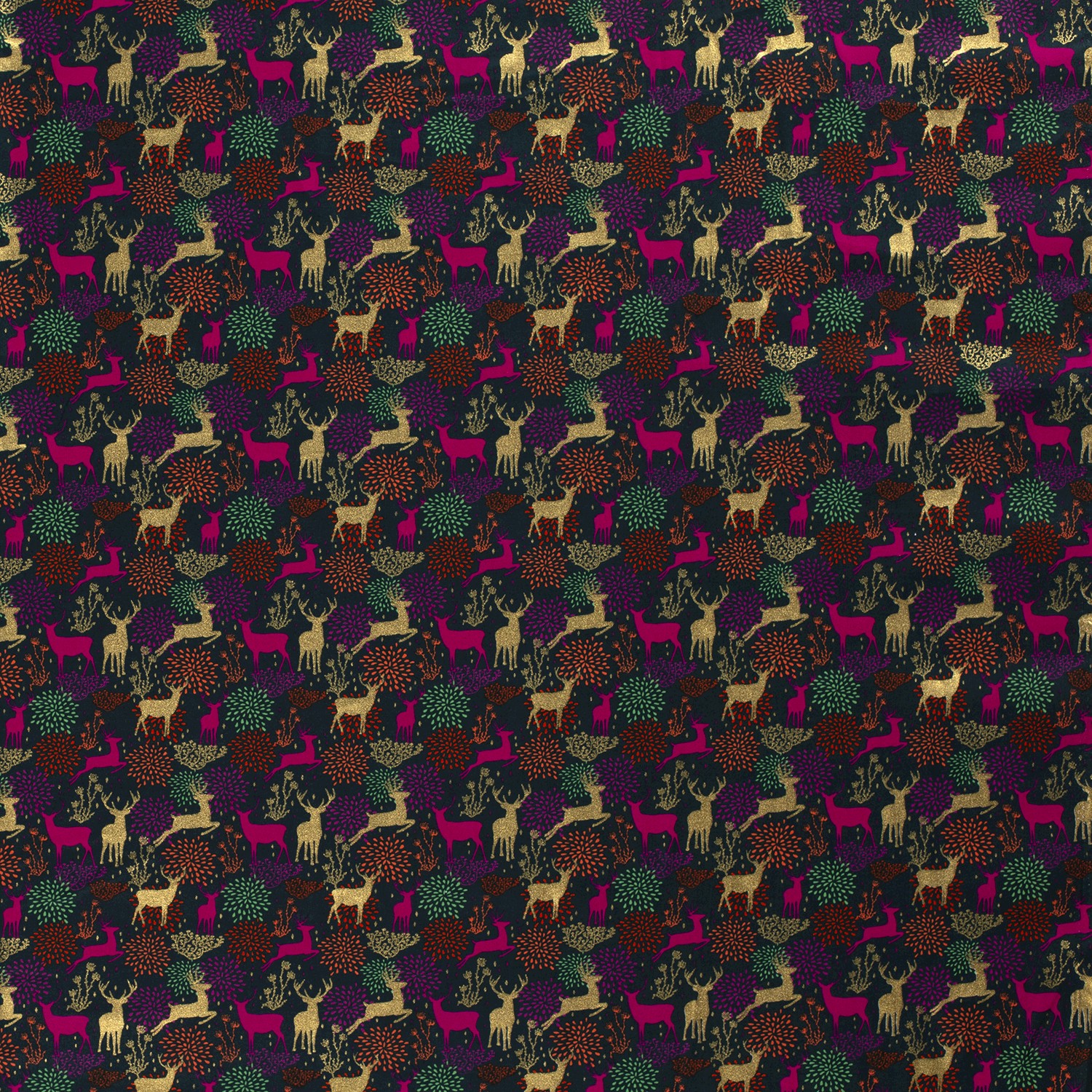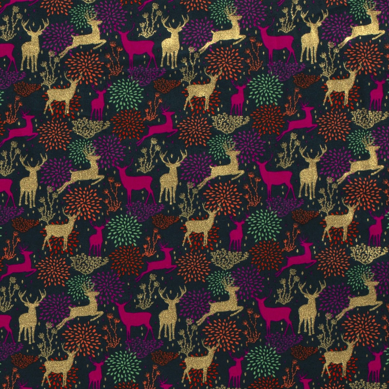 Een luxe kerststof die direct een feestelijke sfeer creëert: op diep petrol stralen fijne herten, grassen en kleine stippen in glanzende foliedruk. Het fonkelende ontwerp lijkt bedekt met rijp en brengt een stijlvolle, moderne look in je kerstdecoratie.