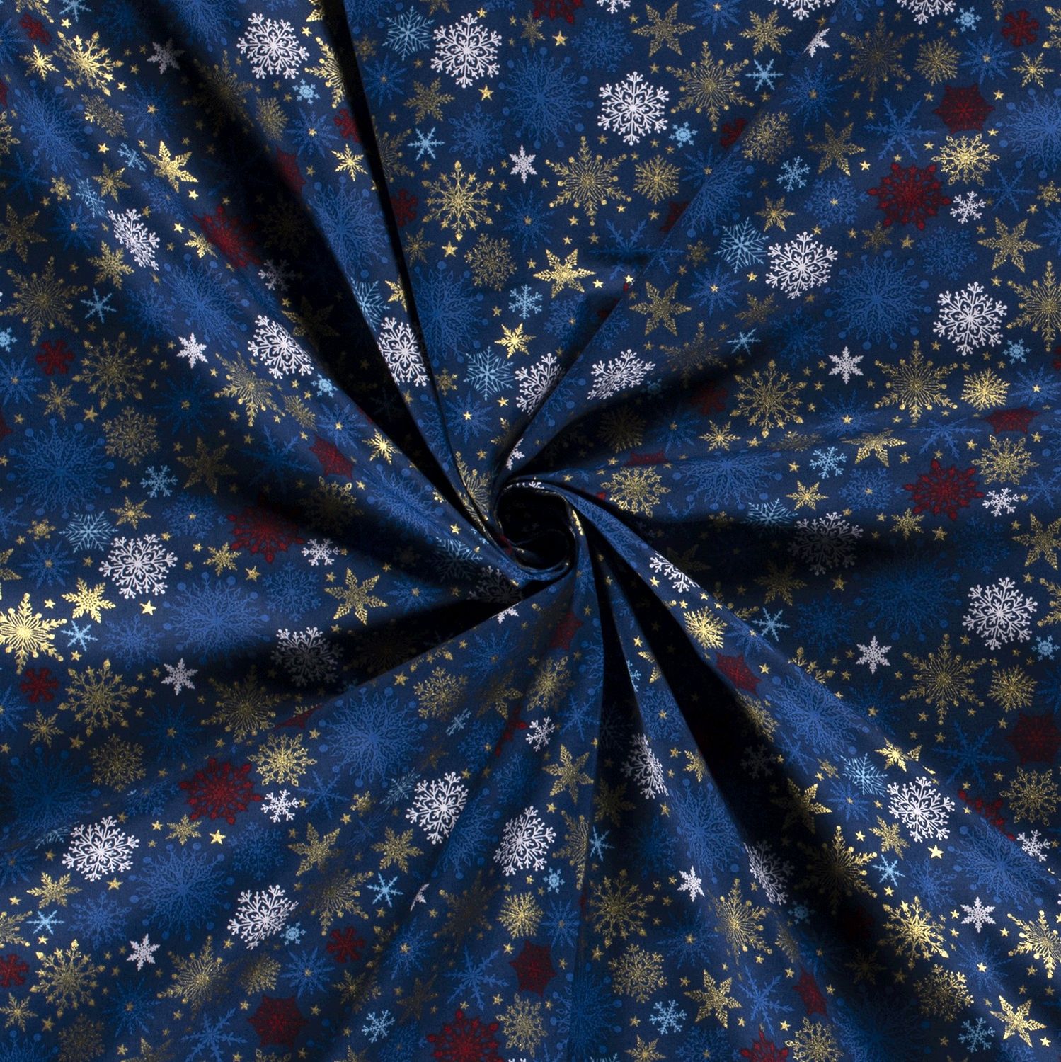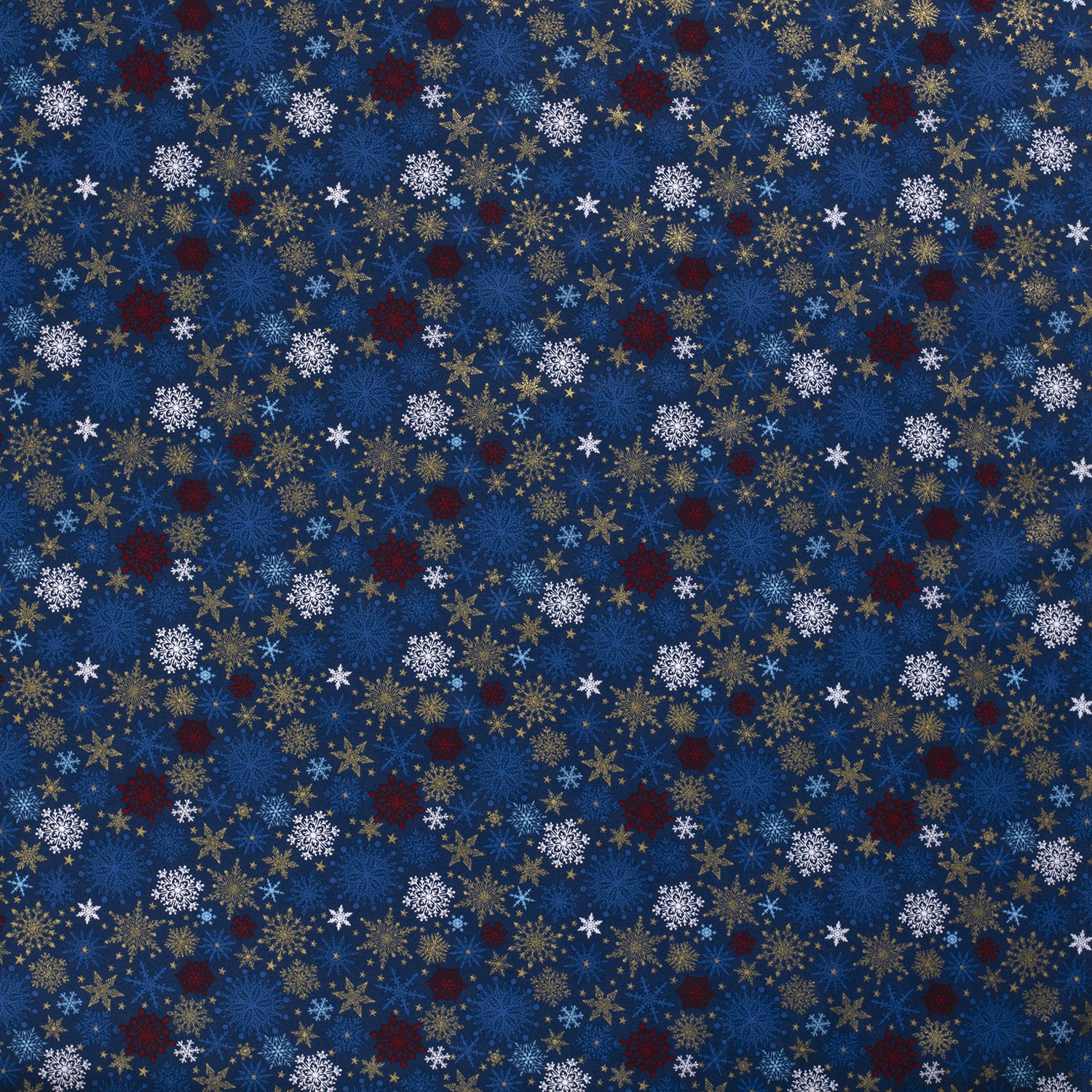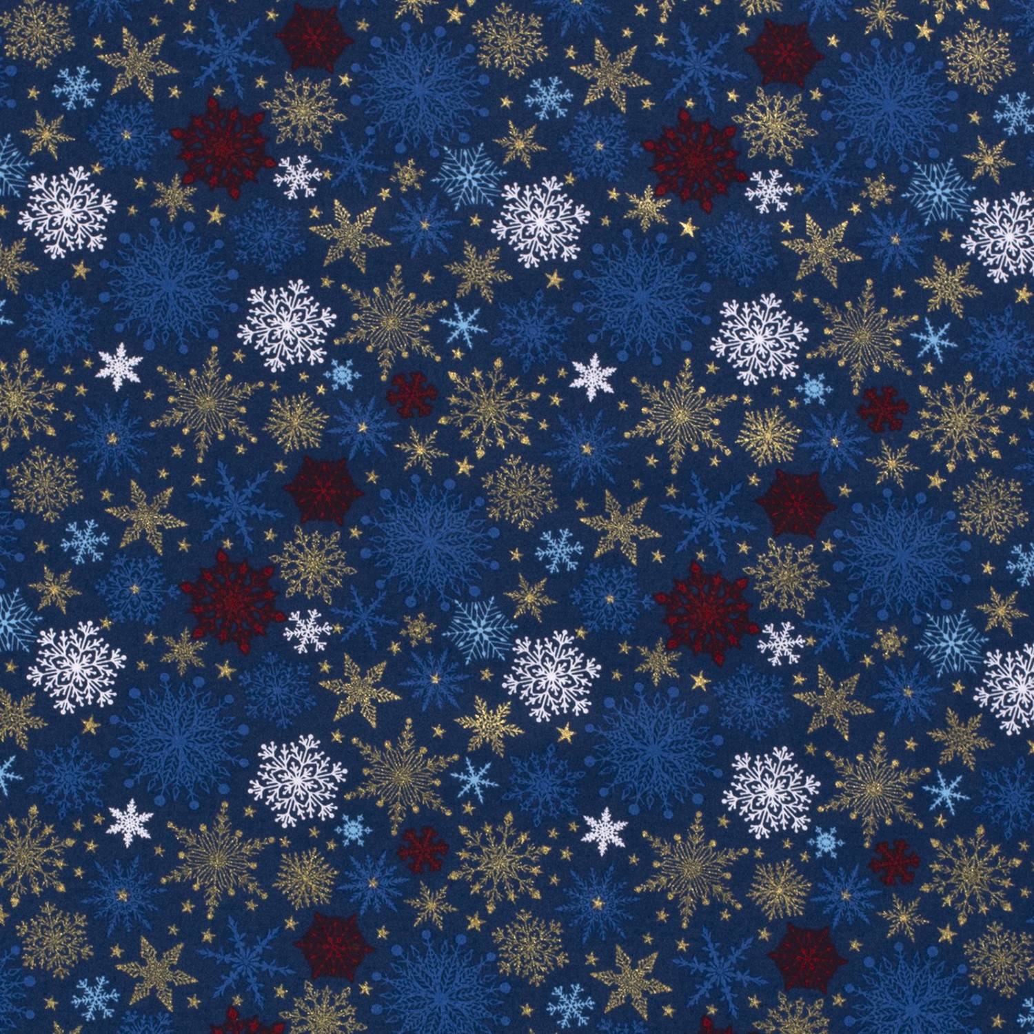 Katoen KERST Foliedruk Ijskristallen op Donkerblauw