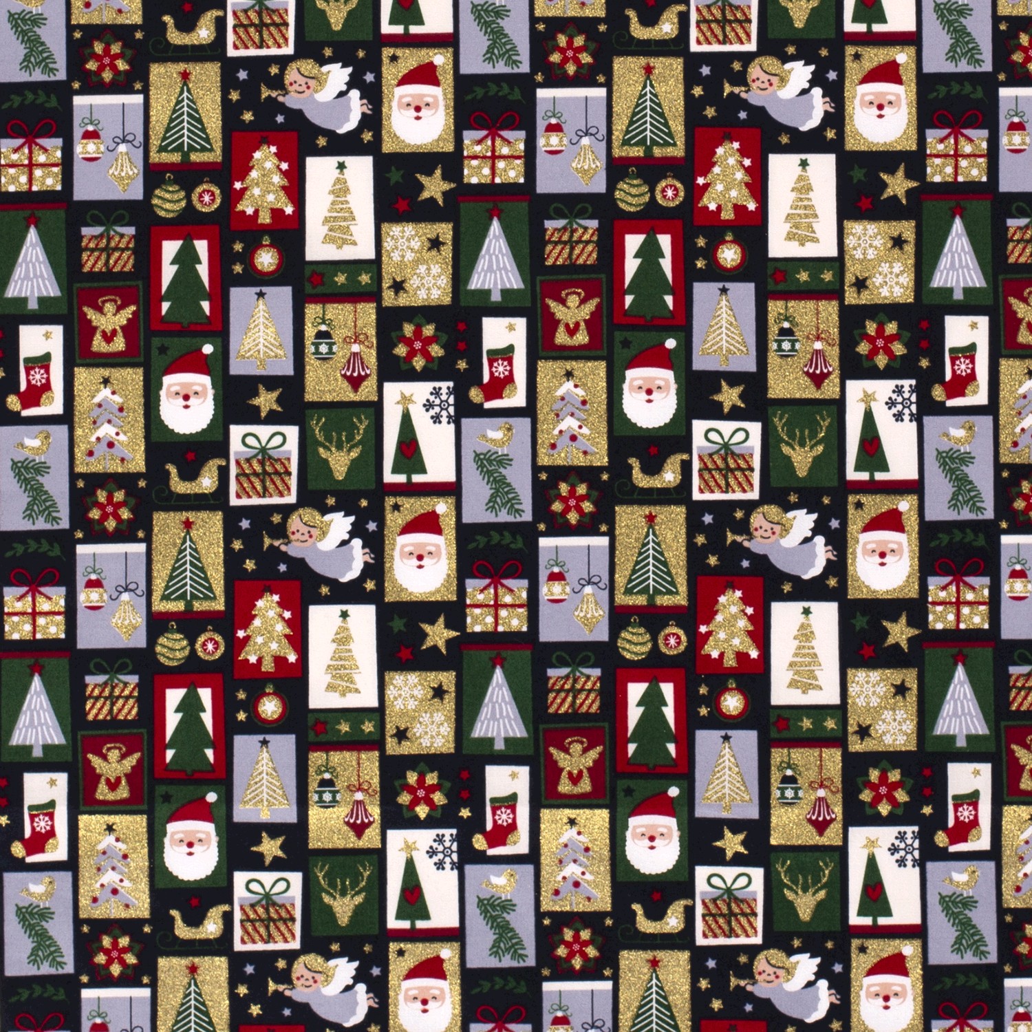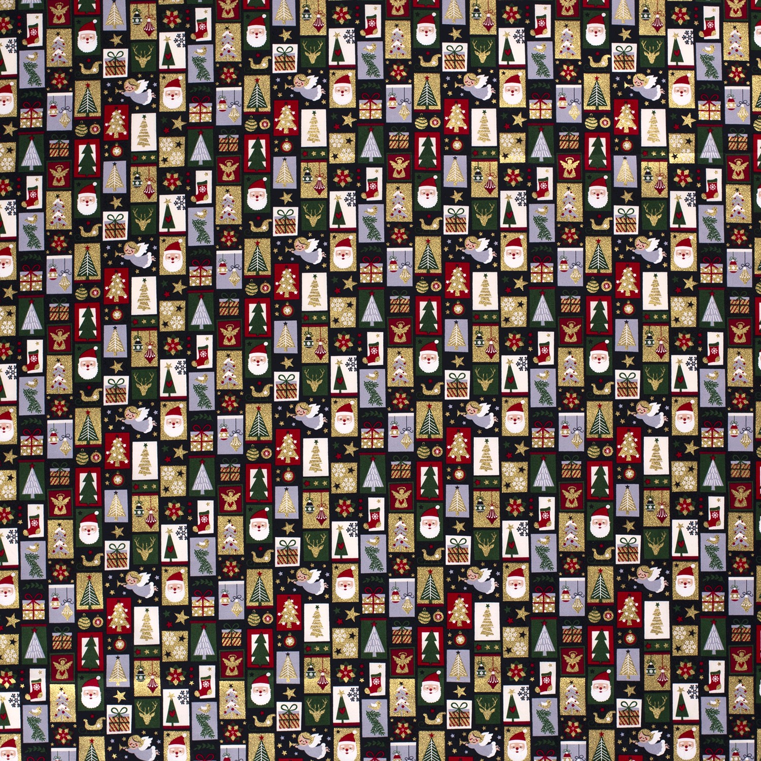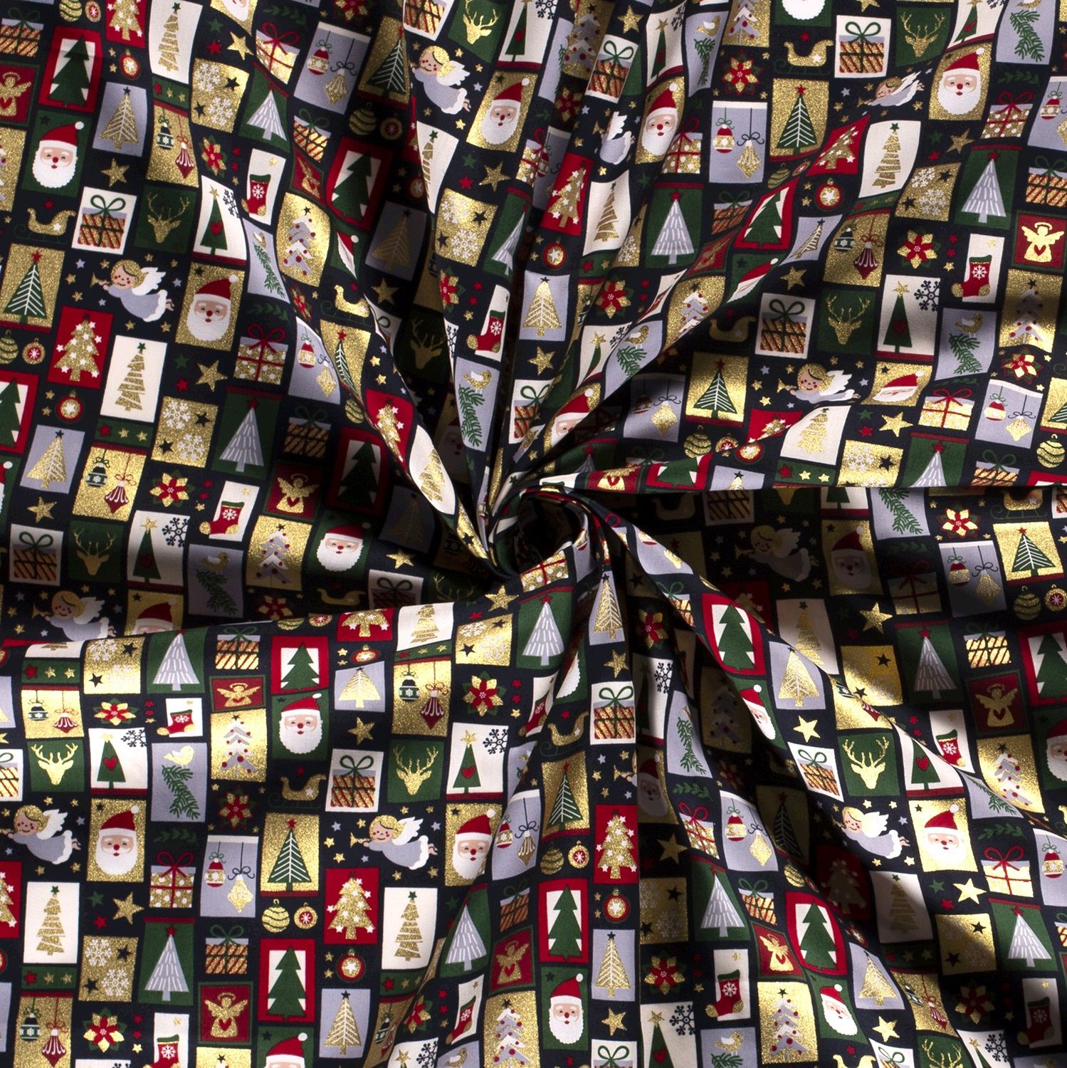 Fijne sterren, dennenbomen, herten, cadeaus, sokken, vogeltjes en wintertakjes wisselen elkaar af en worden versierd met elegant glanzende gouden folie-elementen. De fijne foliedruk zet glanzende accenten – bij kaarslicht of lichtsnoer fonkelt de stof extra mooi en creëert meteen een kerstachtige sfeer.