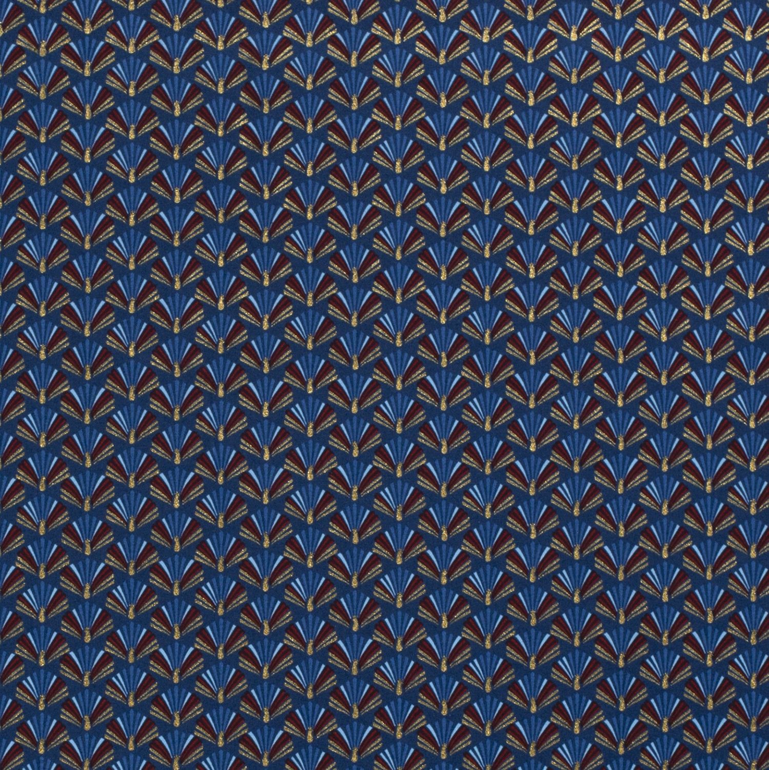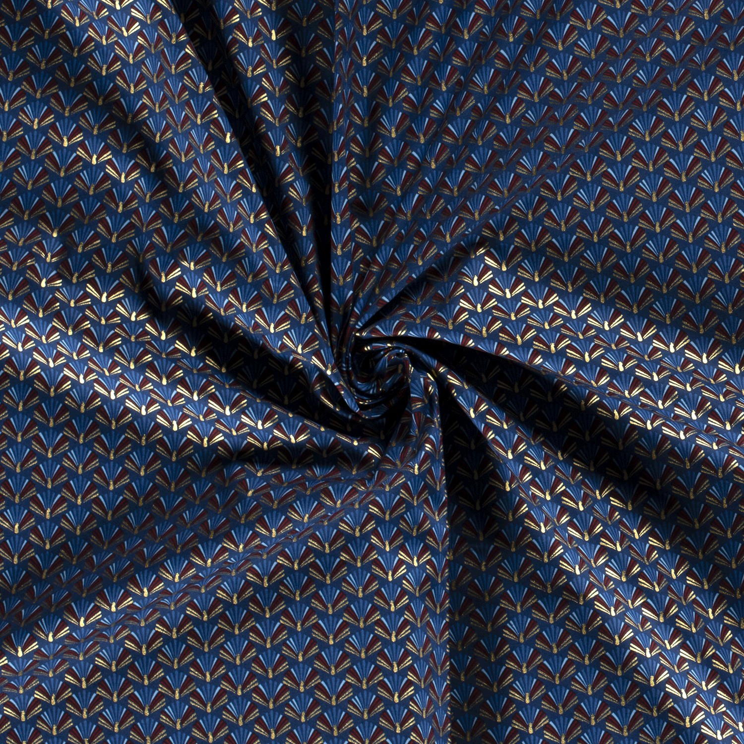 Een vleugje feestelijke glamour: Op diep donkerblauw schitteren delicate, gestileerde waaiers in elegante gouden foliedruk. Het fijne grafische patroon doet denken aan elegante art-deco ornamenten en geeft je naaisels een luxe kerstlook – modern, maar met een vleugje retro charme.