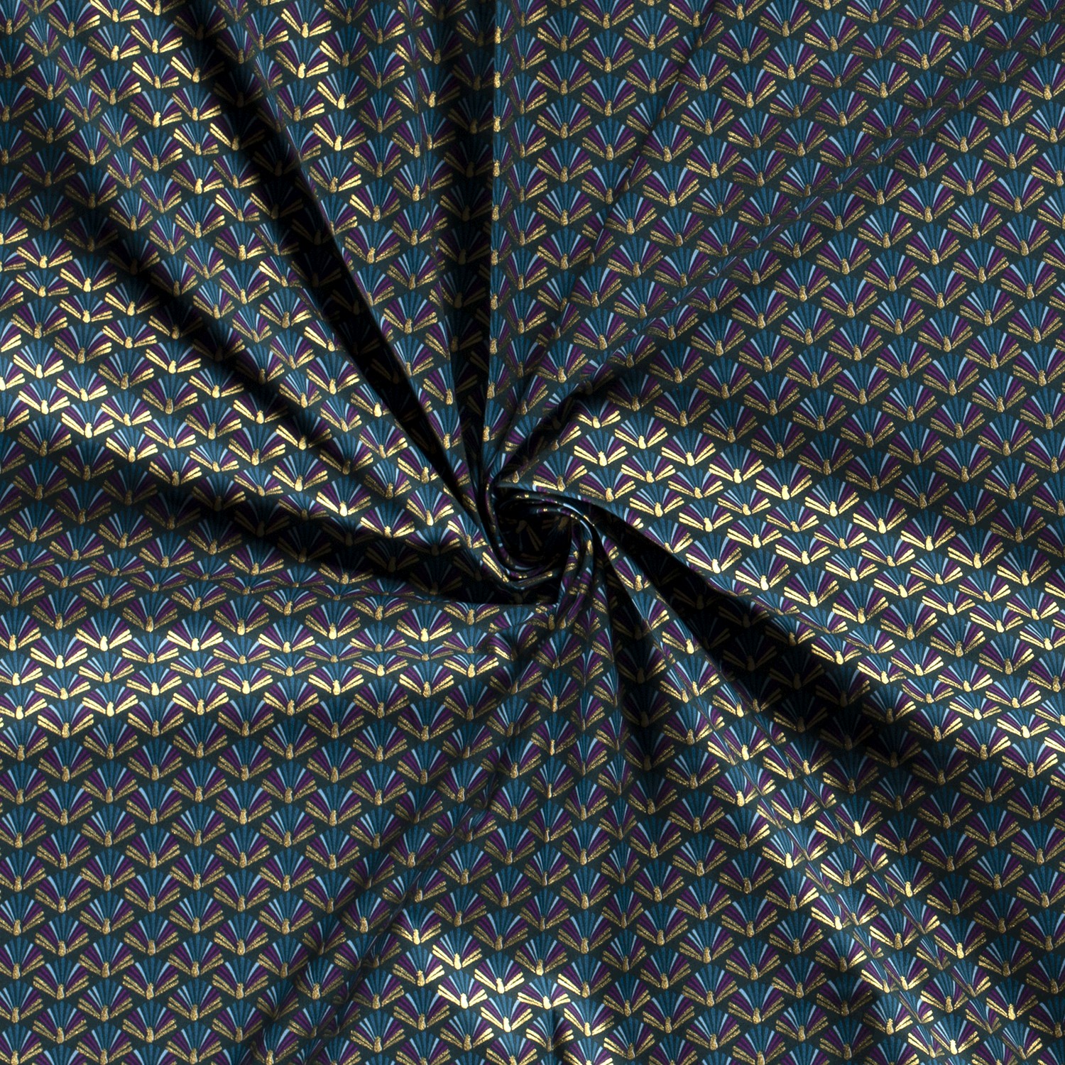 Deze feestelijke katoenen stof betovert met een elegant waaierontwerp op diep petrol. De delicate waaiers doen denken aan stijlvolle kerstornamenten en zijn gelijkmatig verdeeld over de stof – chique, modern en toch met een vleugje retro-charme.
