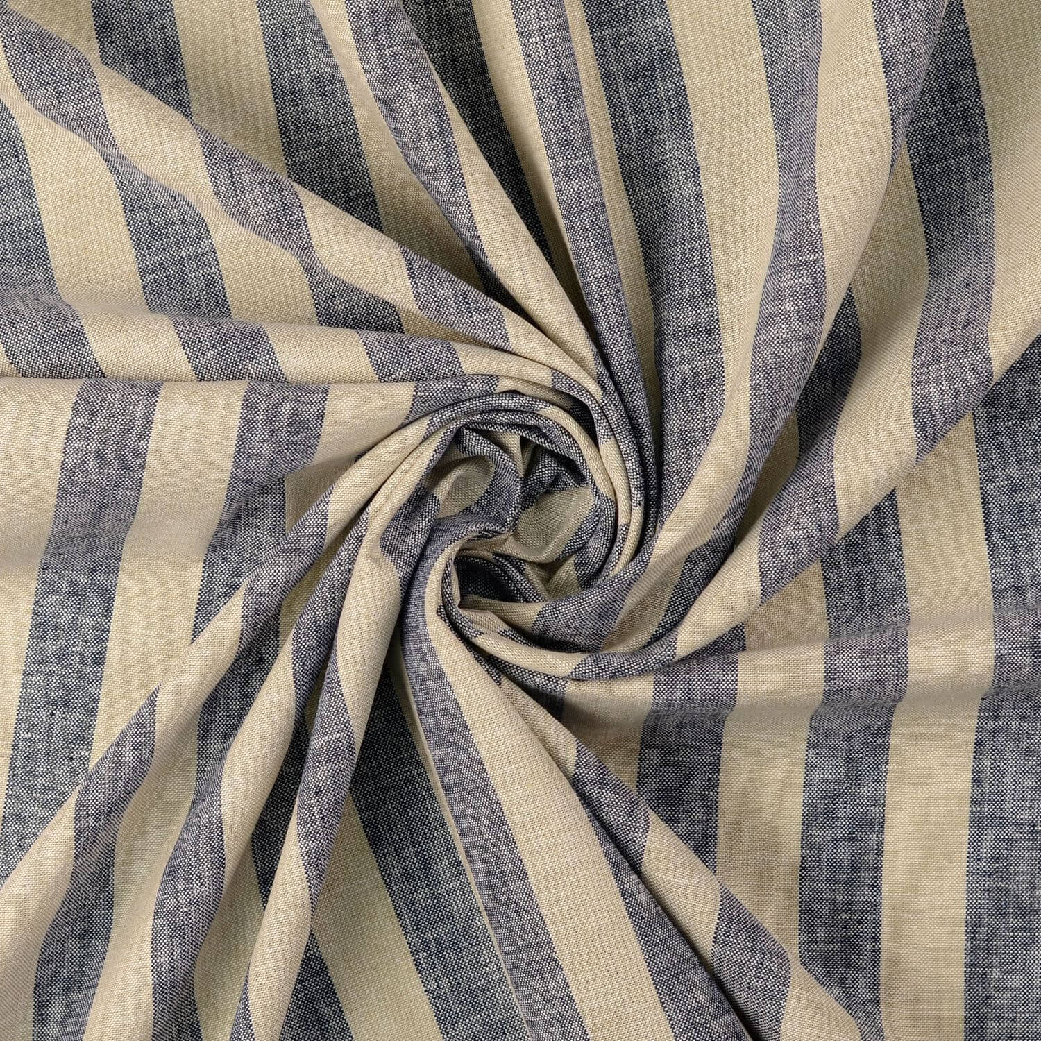 Een stof als een frisse zeebries: de getextureerde katoenen linnen stof maakt indruk met zijn garengeverfde strepen in warm beige en diep marineblauw, die het een verfijnde, nautisch geïnspireerde look geven. De fijne, natuurlijke textuur zorgt voor een levendig oppervlak dat zowel casual als stijlvol is.