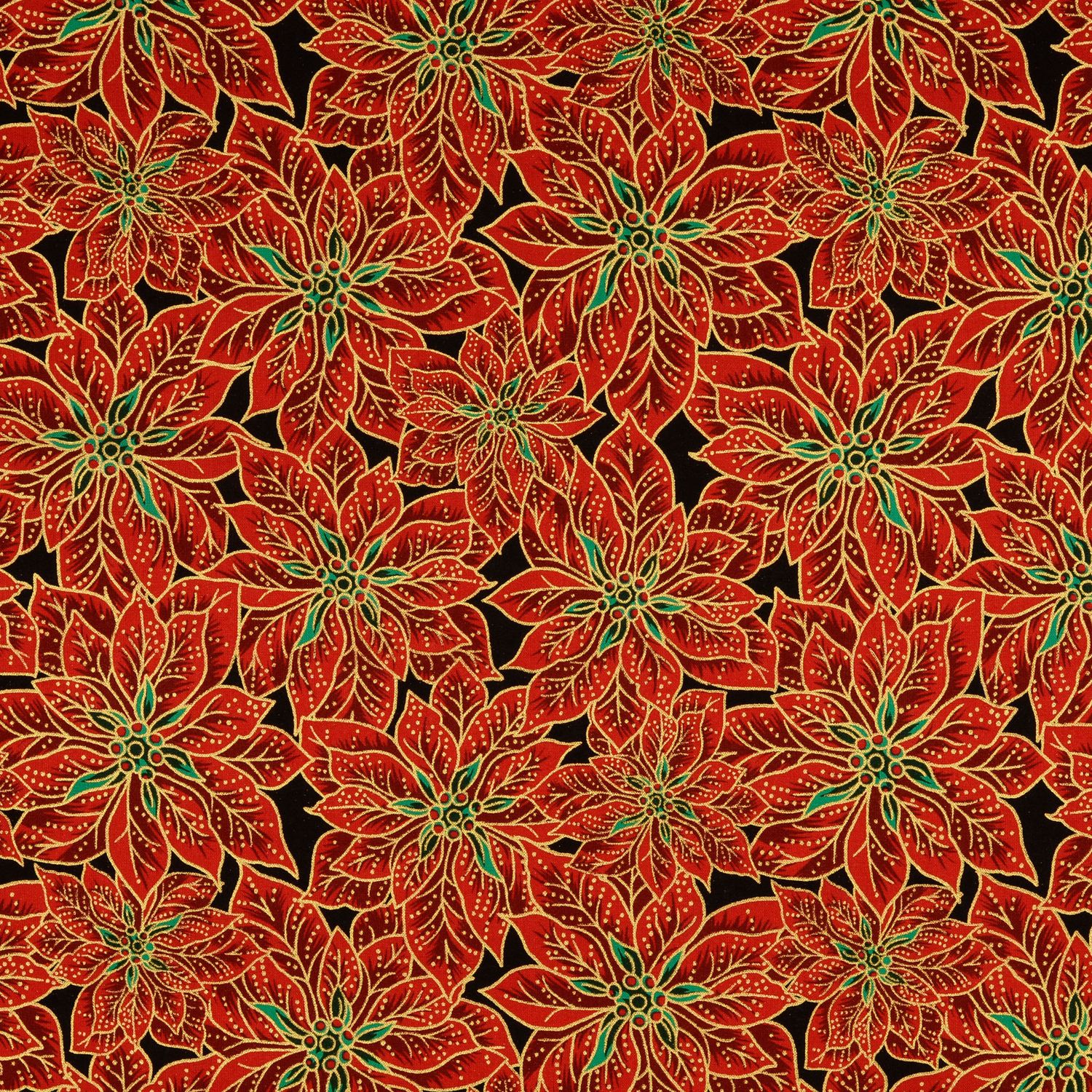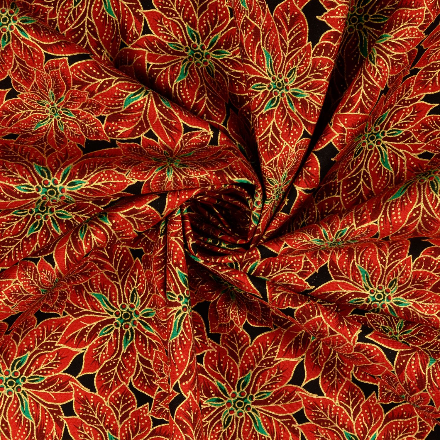 Een feestelijke stof als uit een kerstverhaal: Op een diepzwarte achtergrond stralen weelderige rode kerstbloemen, versierd met fijn getekende bladeren en bessen. Fijne gouddrukaccenten omlijsten de bloemen en zorgen voor elegante highlights die subtiel glanzen afhankelijk van het licht – perfect voor een stijlvolle kerstsfeer.