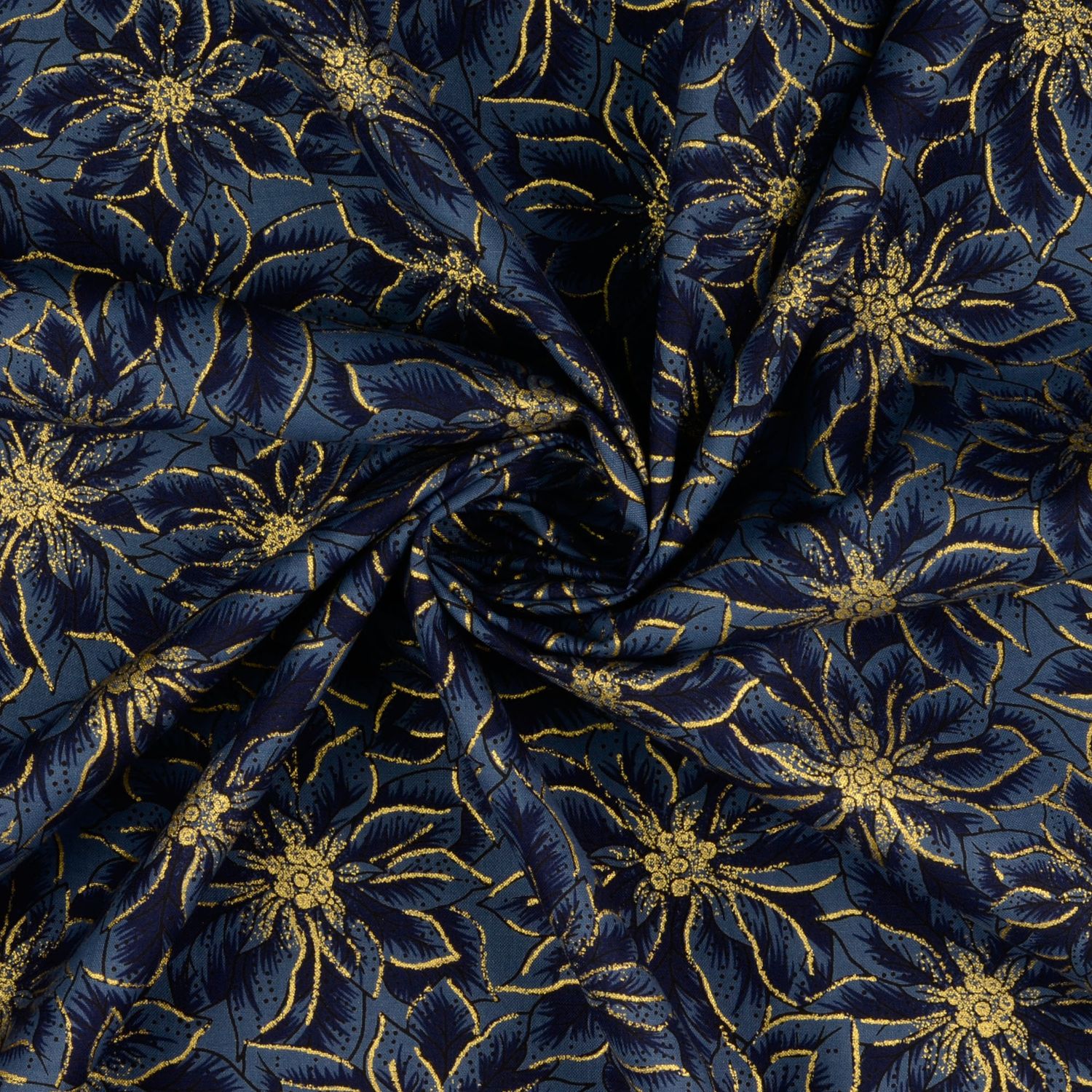 Een diep nachtblauw als achtergrond, met talloze gouden sterren die fonkelen als een winterse sterrenhemel – deze stof brengt direct een feestelijke sfeer in elk naai-project. De edele gouden print glinstert afhankelijk van het licht en geeft jouw creaties een vleugje luxe en kerstmagie.
