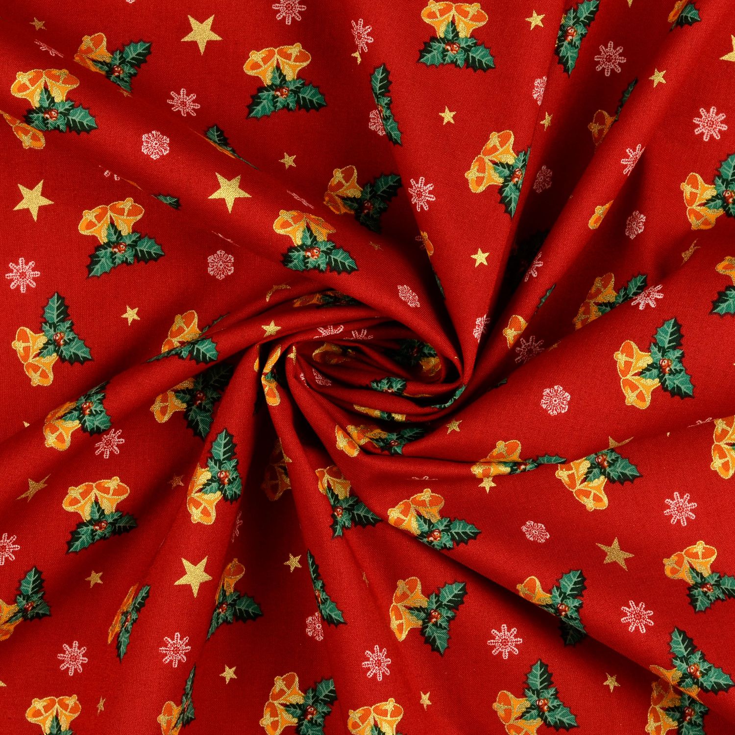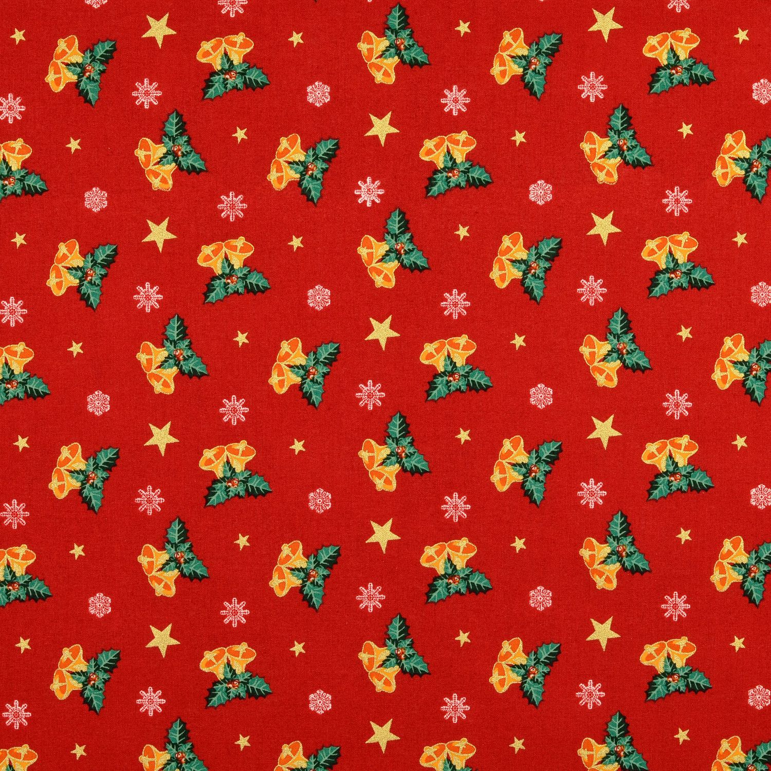Een feestelijke katoenen stof als uit een kerstverhaal: Op een stralend rode achtergrond glanzen fijne kerstbellen, sterren, sneeuwvlokken en tere maretakken in een elegante gouden print. De fijne motieven lijken bedekt met een vleugje wintermagie en laten de stof subtiel glanzen afhankelijk van het licht.