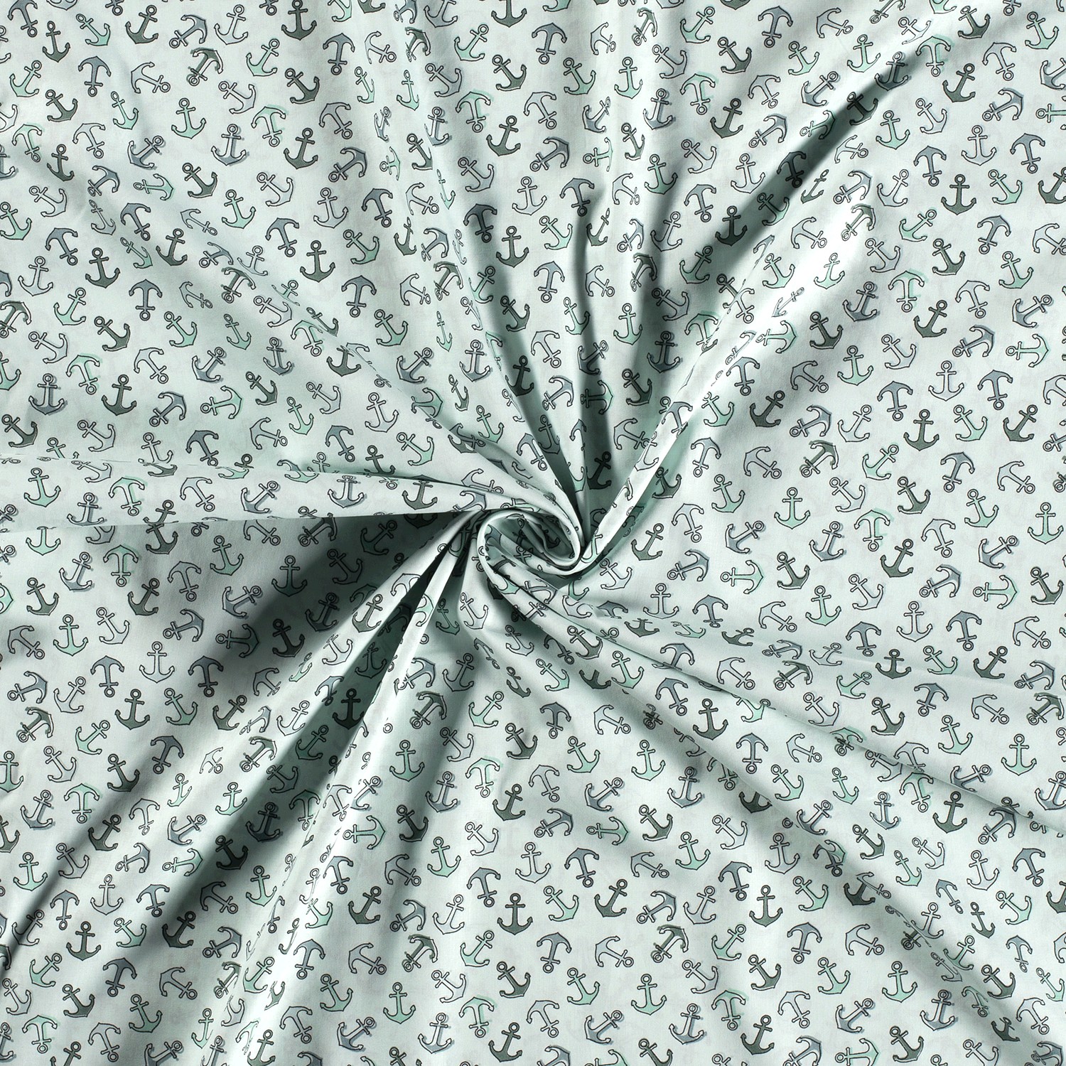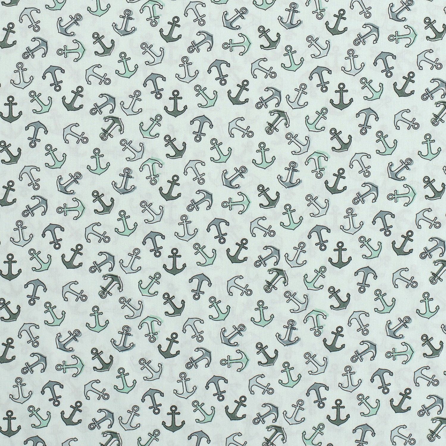 Deze maritieme katoenen stof brengt een frisse zeebries in je naai-projecten: Op een zacht licht mintkleurig vlak spelen kleine, meerkleurige ankers in blauw, rood en geel – vrolijk, speels en tegelijk prachtig tijdloos. De gladde structuur en de aangenaam lichte kwaliteit maken het de ideale metgezel voor alles wat direct op de huid wordt gedragen.