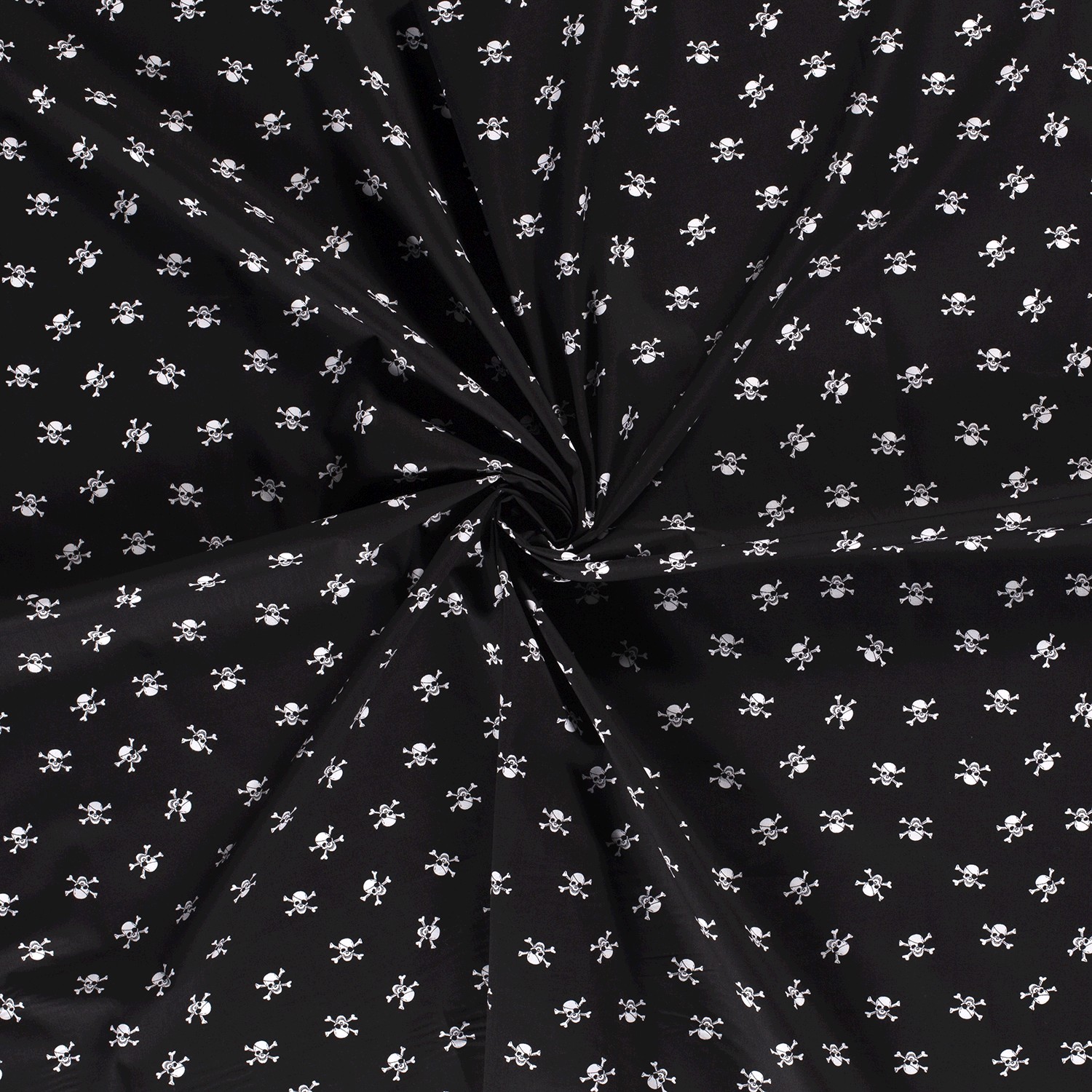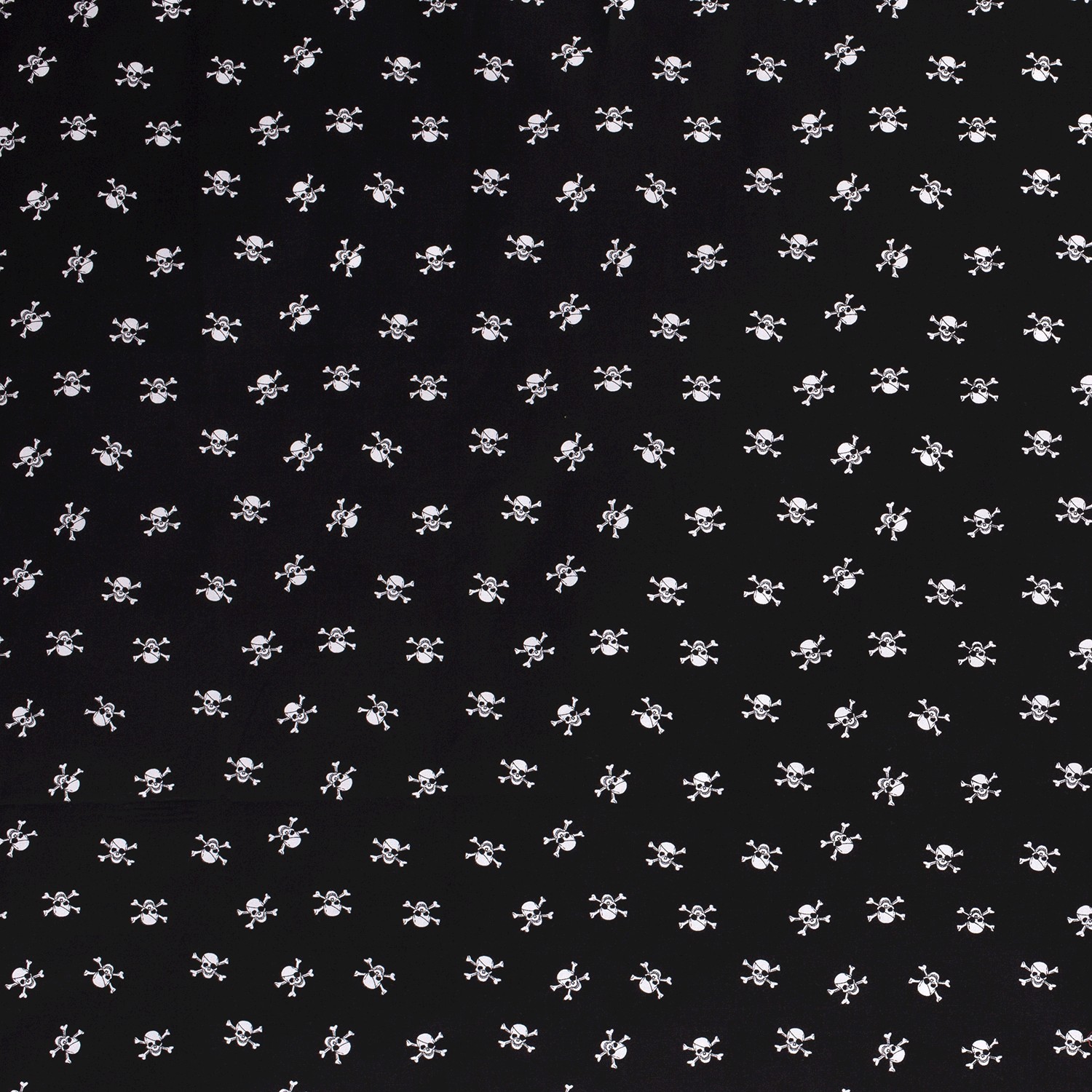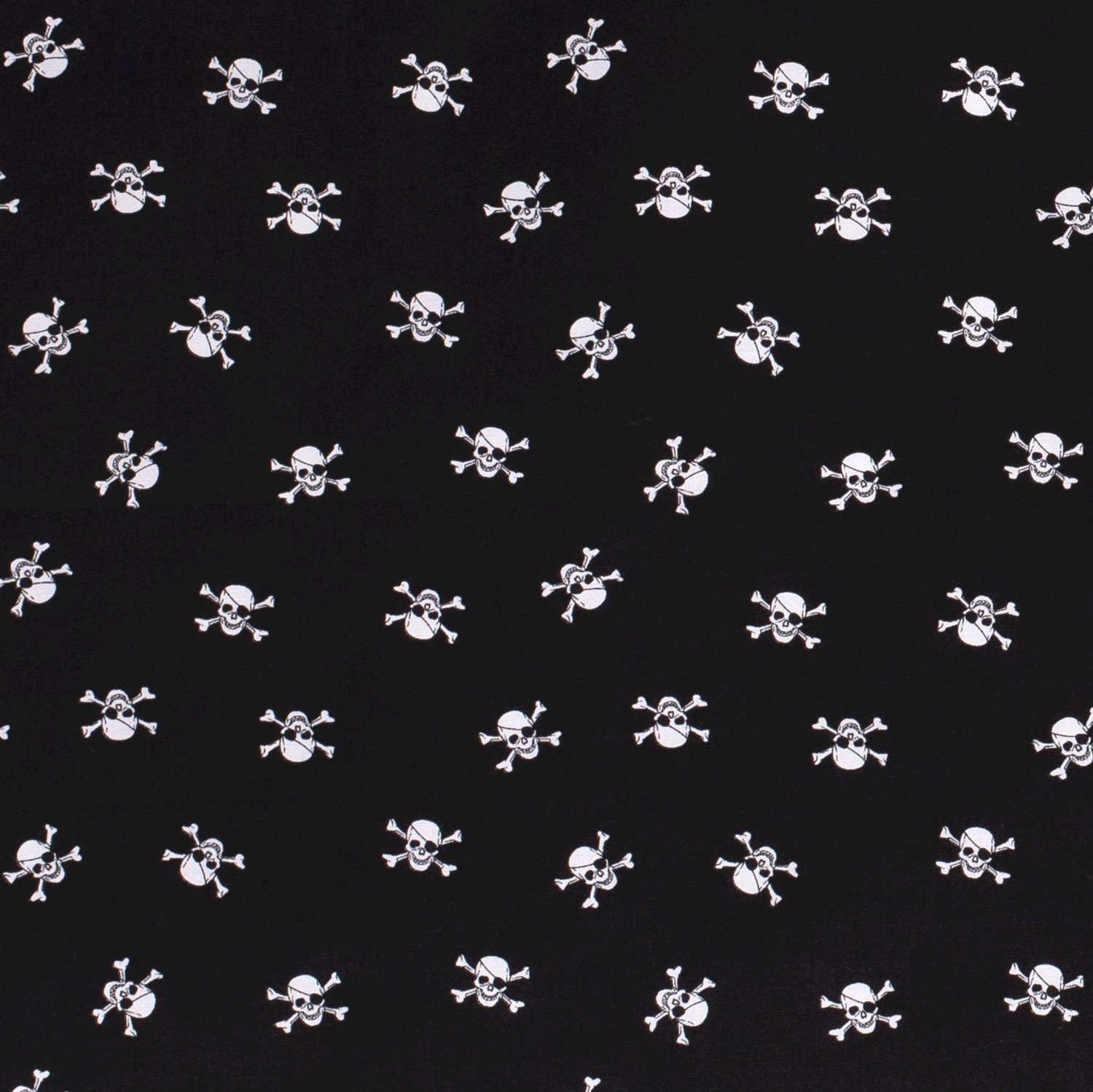 Een stof voor echte piratenfans: op een diepzwarte achtergrond staan kleine, gedetailleerd getekende doodskopmotieven – soms met het typische piratenooglapje, soms met gekruiste botten. Het strakke zwart-wit ontwerp is tegelijk stoer, maritiem en een beetje rebels en laat zich prachtig combineren.