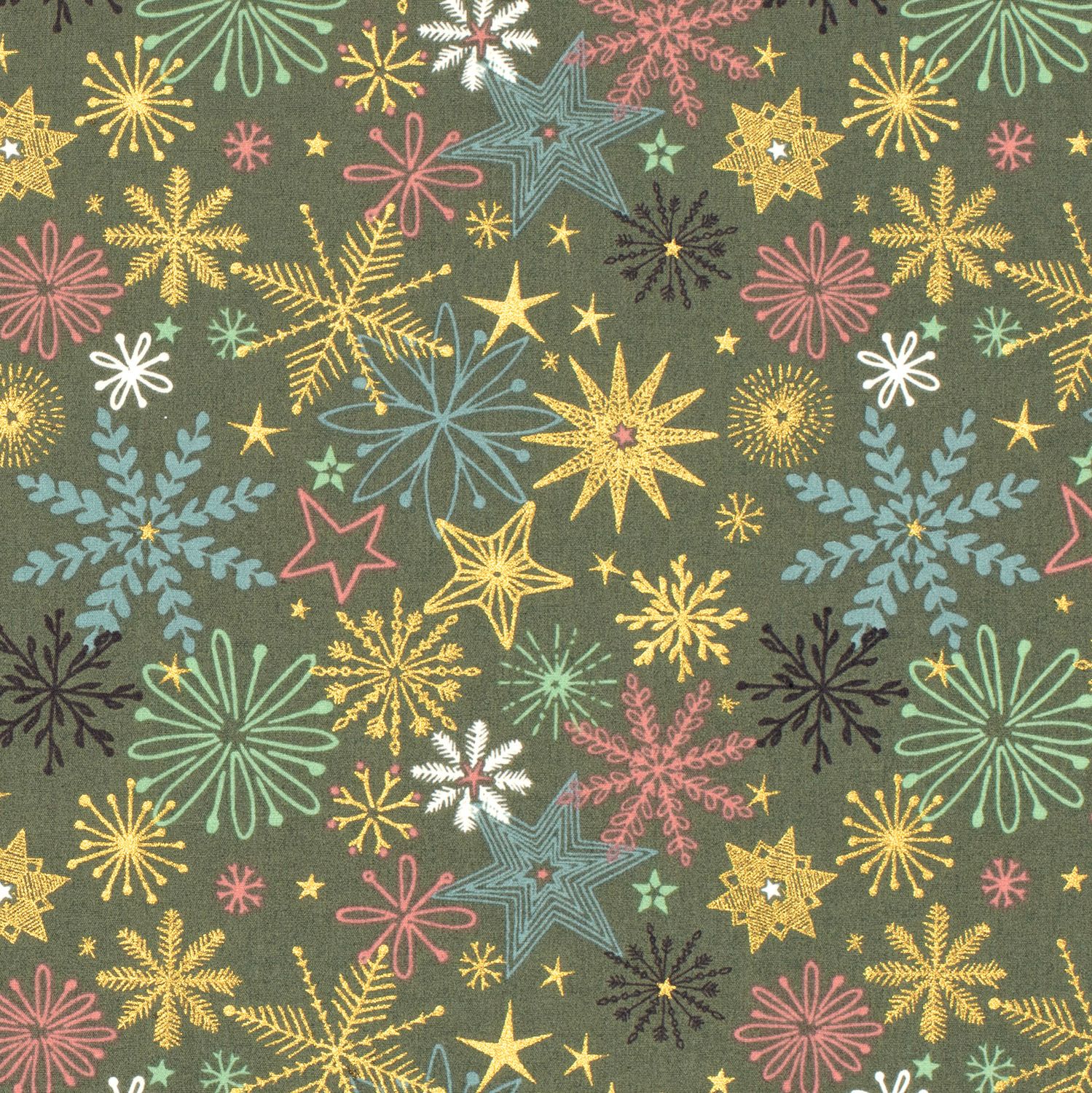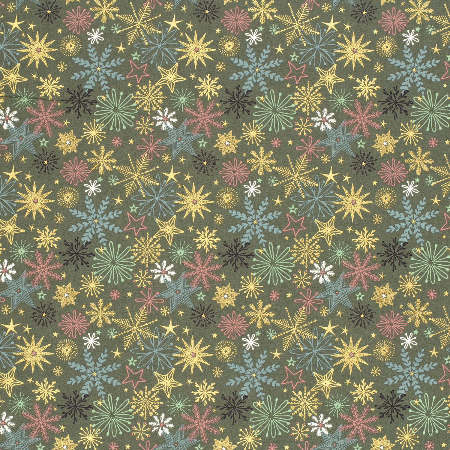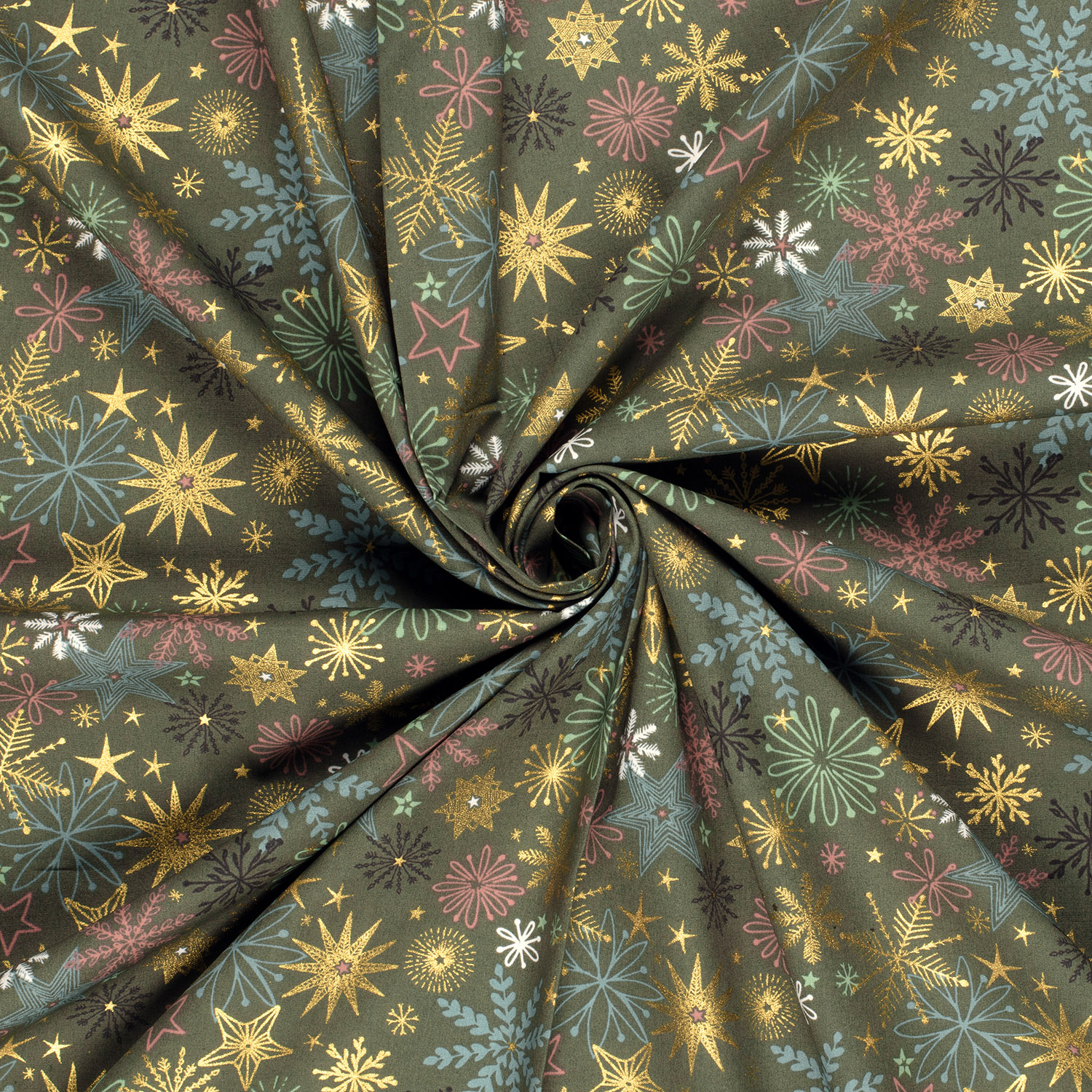 Een delicate sterrenhemel voor je naaiprojecten: Fijne, gouden sterren en kristallen vormen glinsteren als kleine lichtpuntjes in de nacht op elegant kaki. Het delicate patroon ziet er tegelijkertijd elegant, modern en speels uit - perfect voor iedereen die van subtiele kerst- en winterontwerpen houdt, maar een vleugje magie het hele jaar door niet wil missen.