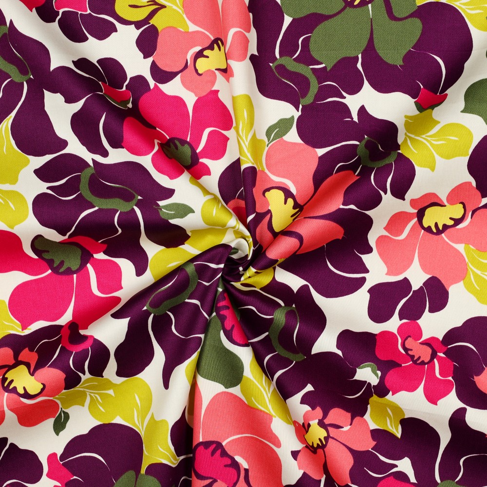 Een vleugje elegantie voor je naai-projecten: deze edel glanzende katoensatijn betovert met een expressief bloemenontwerp in diep aubergine. Fijne bloemblaadjes in harmonieuze paarse en rozetinten verspreiden zich als een bloemenkleed over de stof en worden stijlvol geaccentueerd door fijne, donkerdere nuances.