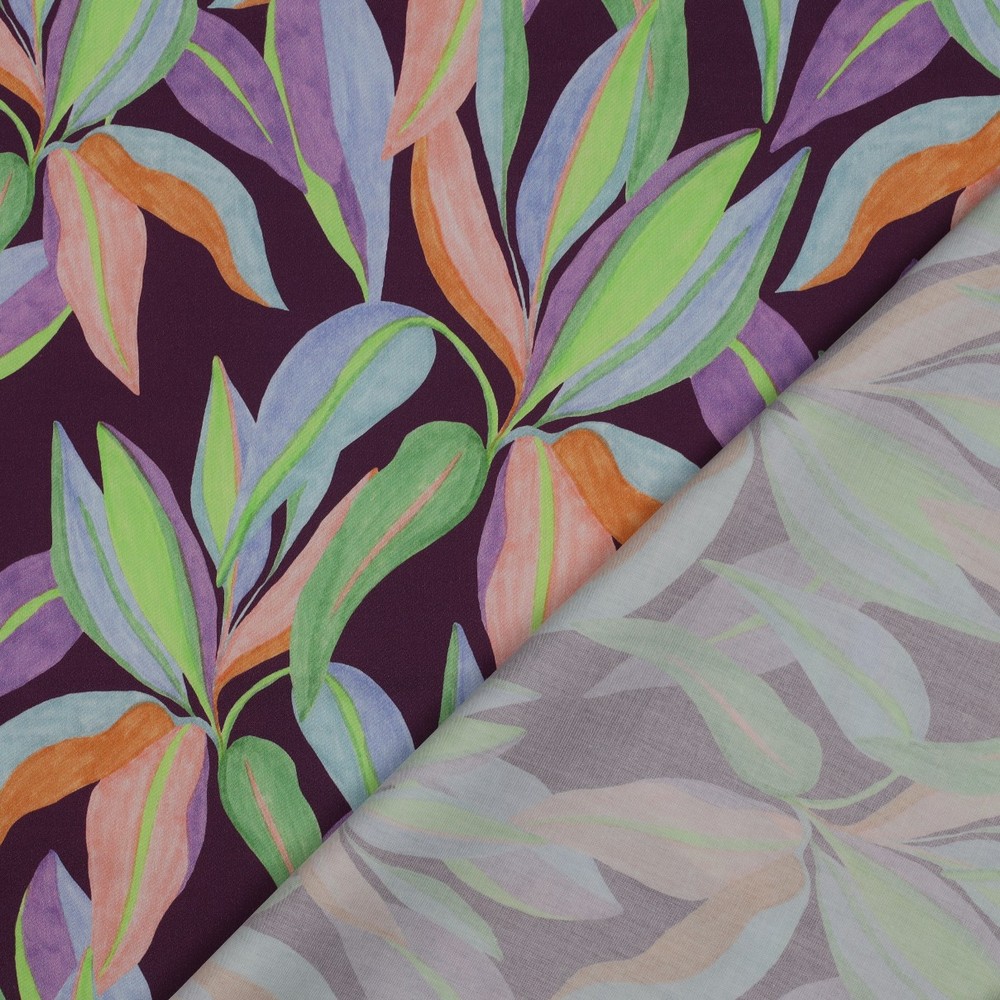 Katoen satijn - digitale print kleurrijke bladeren paars
