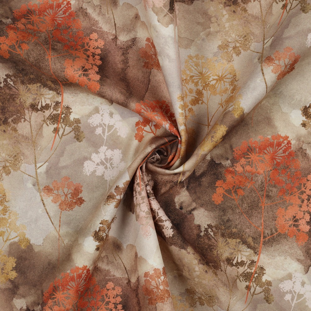 Een warme toffeetint vormt het perfecte decor voor dit gedetailleerde bloemenmotief. Fijne bloemen in crème, roze en zachte lila tinten verspreiden zich als een elegante verspreide tuin over de stof, met fijne bladeren en kleine knopjes ertussen die het ontwerp levendigheid en luchtigheid geven.