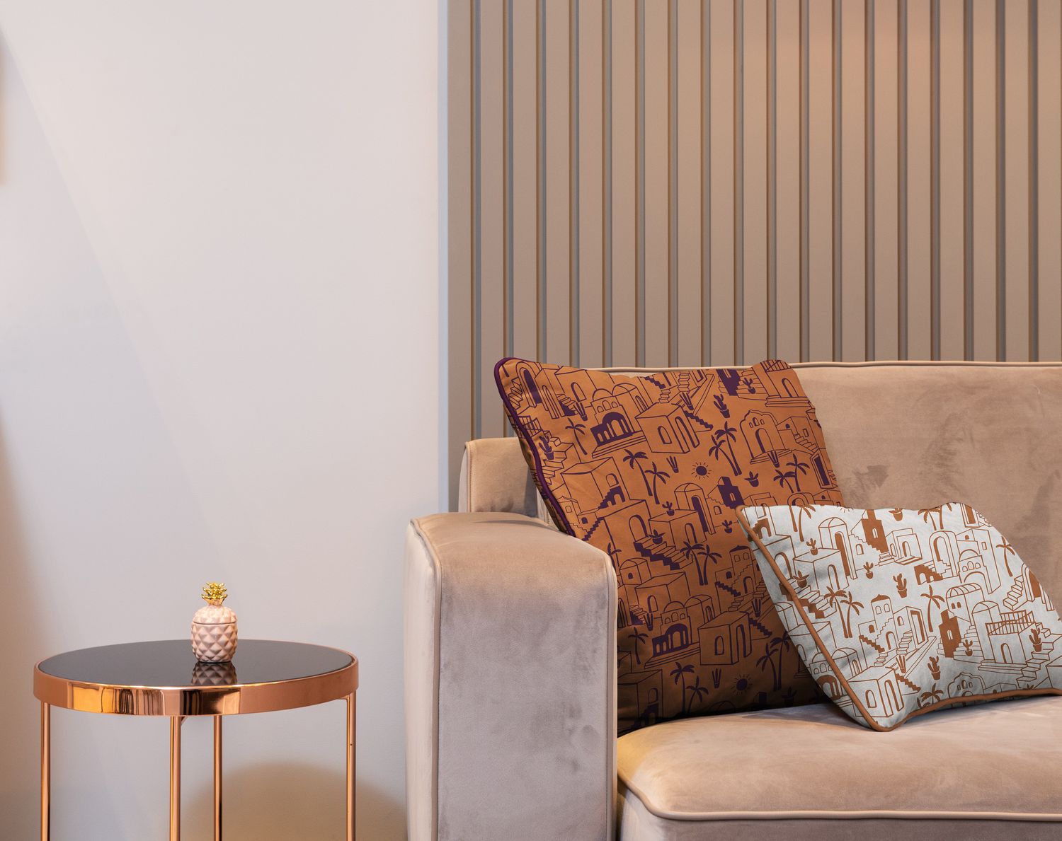 Met dit katoenen canvas haal je de magie van een oosterse woestijnstad rechtstreeks naar je naaiwerkplek. Warme terracotta- en zandtinten ontmoeten zachte beige- en bruine nuances en vormen een harmonieus, aards kleurenspel dat meteen doet denken aan zon, warmte en trillende lucht.