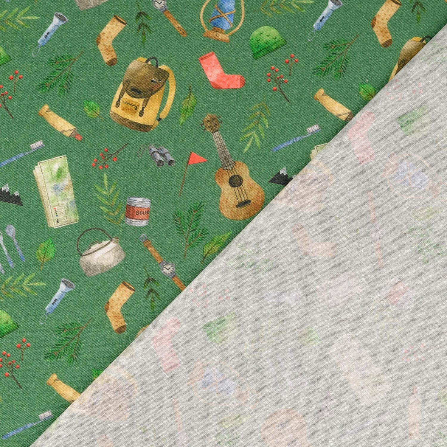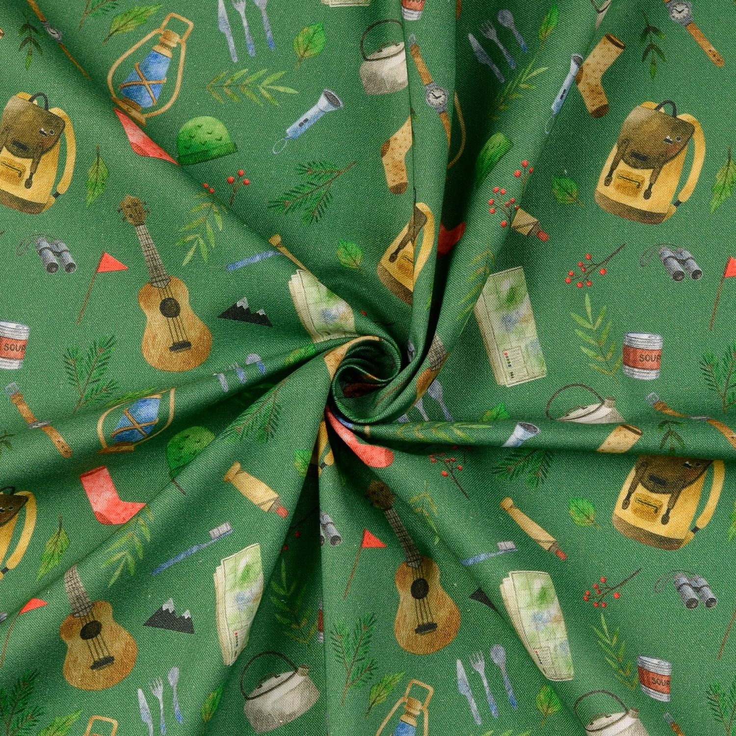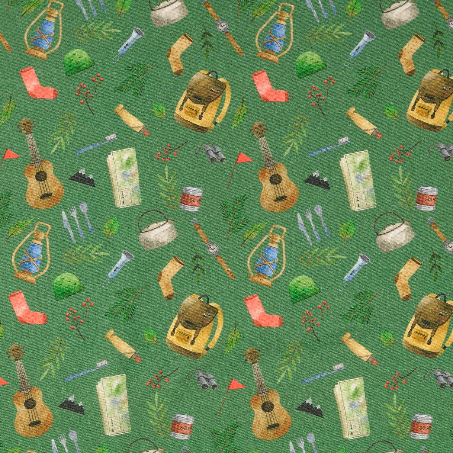 Klaar voor je volgende naai-avontuur? Deze katoenen cretonne met gedetailleerde digitale print toont alles wat het wandelhart sneller doet kloppen: rugzakken, tenten, kompassen, drinkflessen, lantaarns, slaapzakken en meer – liefdevol geïllustreerd als kleine vondsten van een perfect geplande outdoortrip.