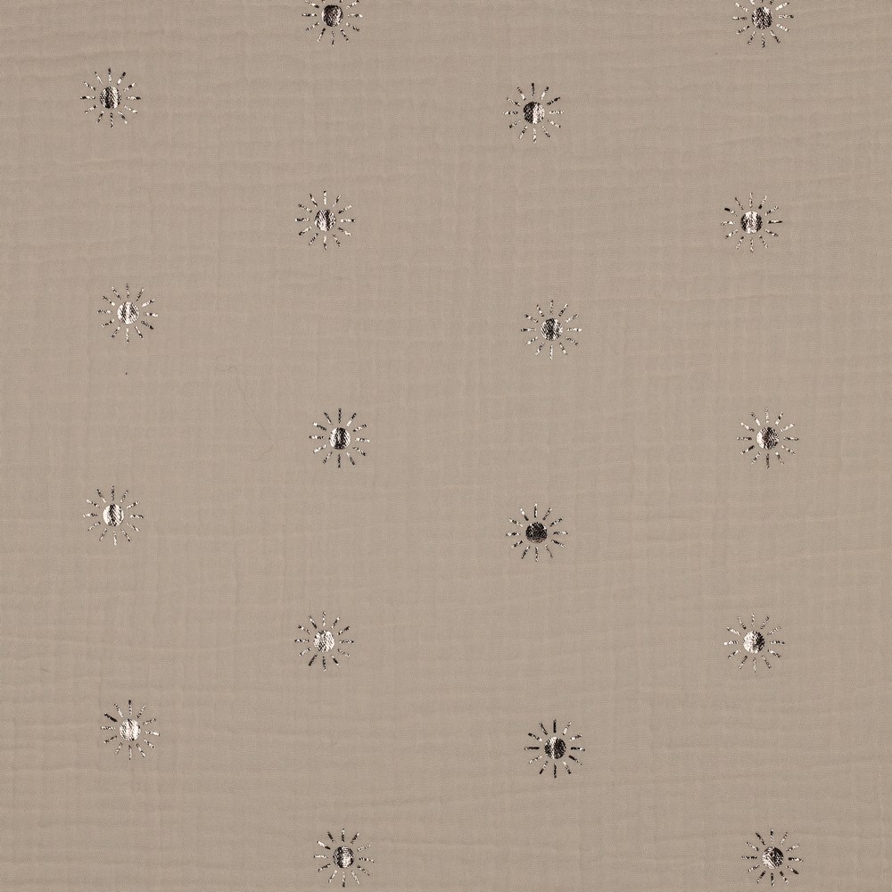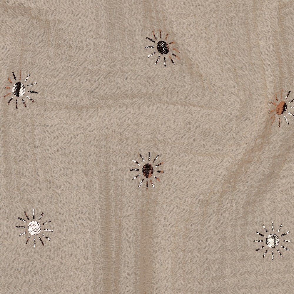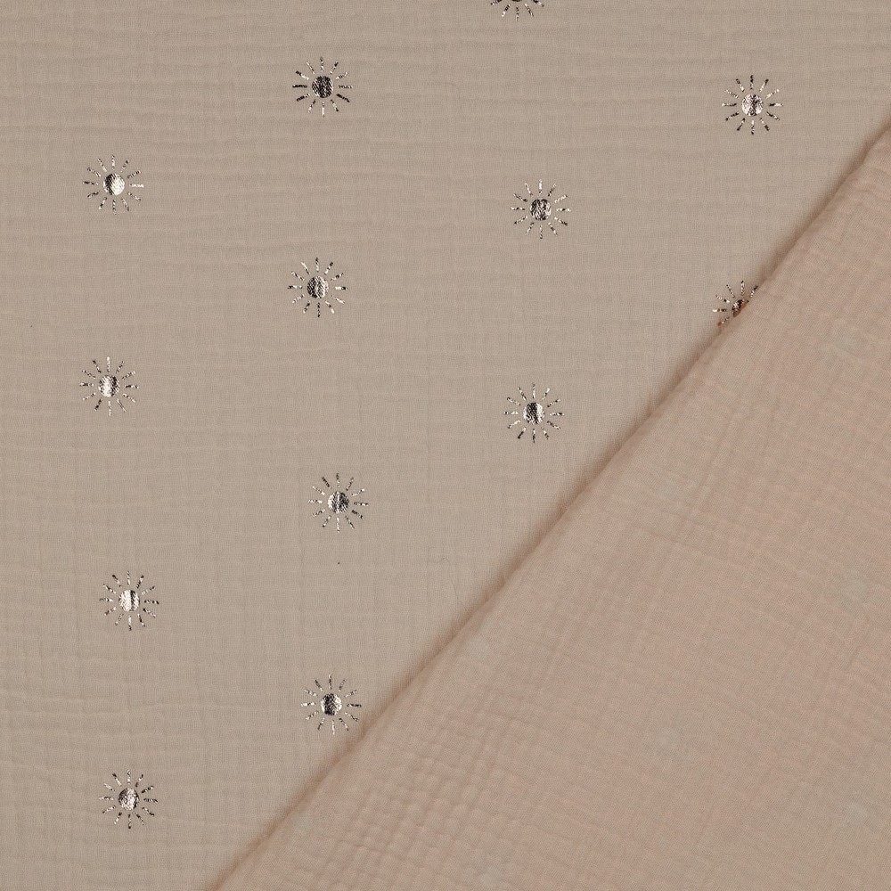 Een vleugje zomer op stof: deze delicate mousseline in een zachte perzikkleur is versierd met kleine, gestileerde zonnen in een elegante folieprint. De fijne, glinsterende gouden zonnetjes weerkaatsen het licht afhankelijk van de beweging en geven de stof een subtiele maar effectieve glans - perfect voor iedereen die van iets speciaals houdt.