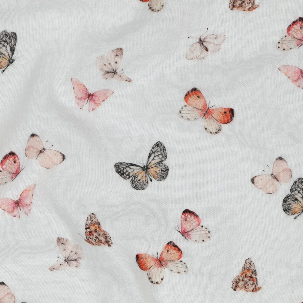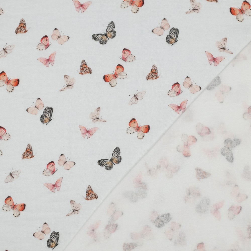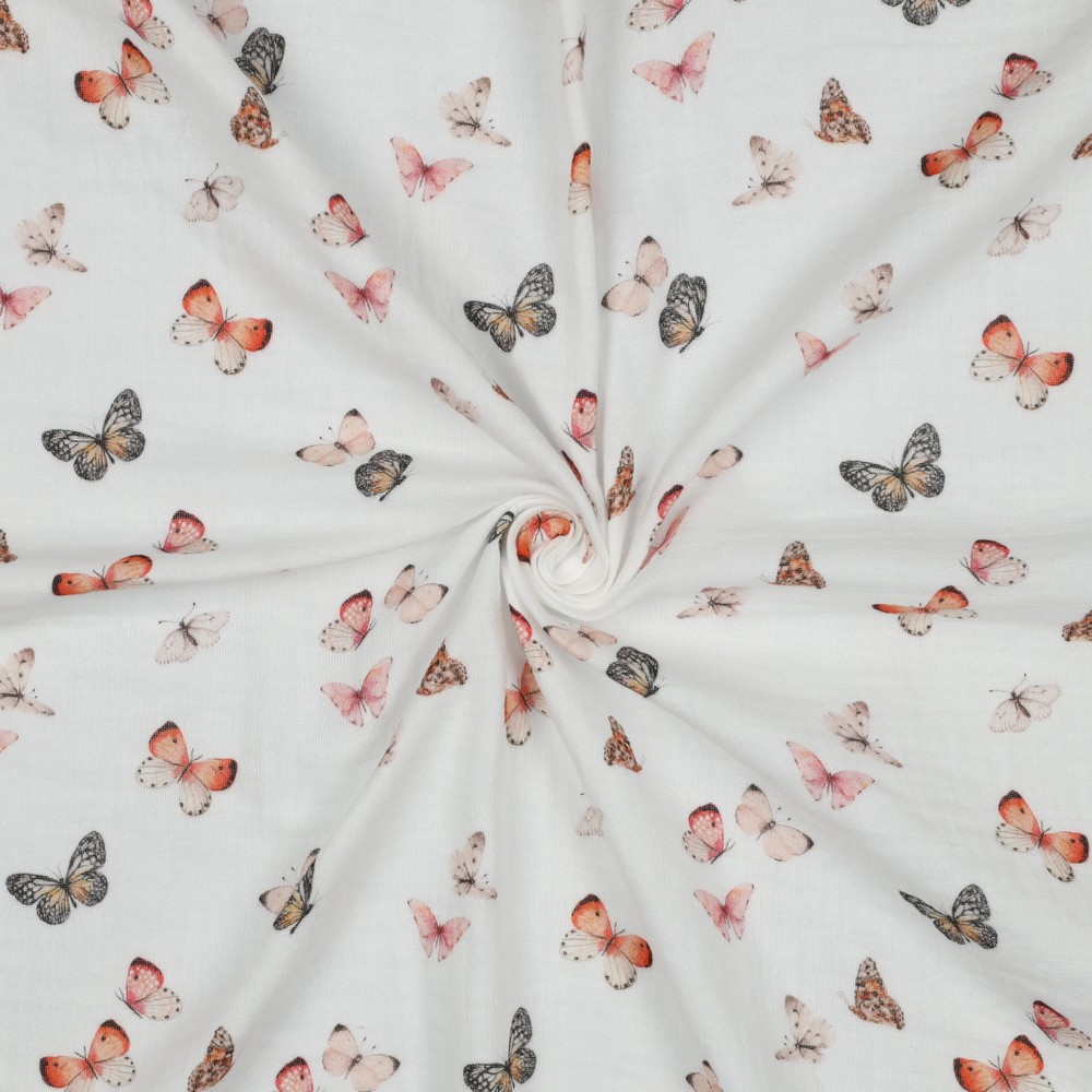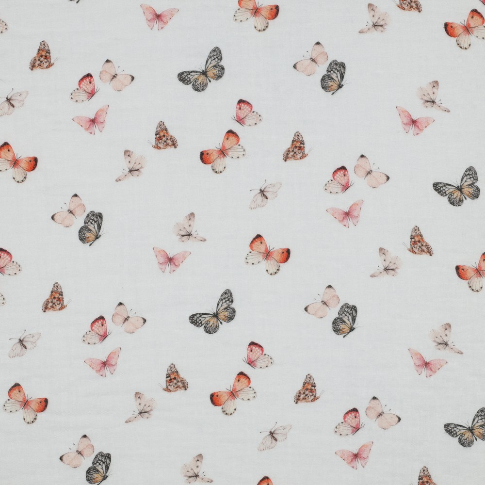 Katoenen mousseline glad - Double Gauze digitale print vlinders wit