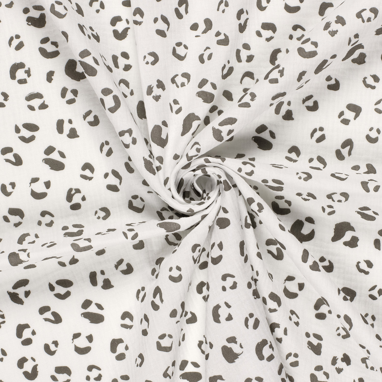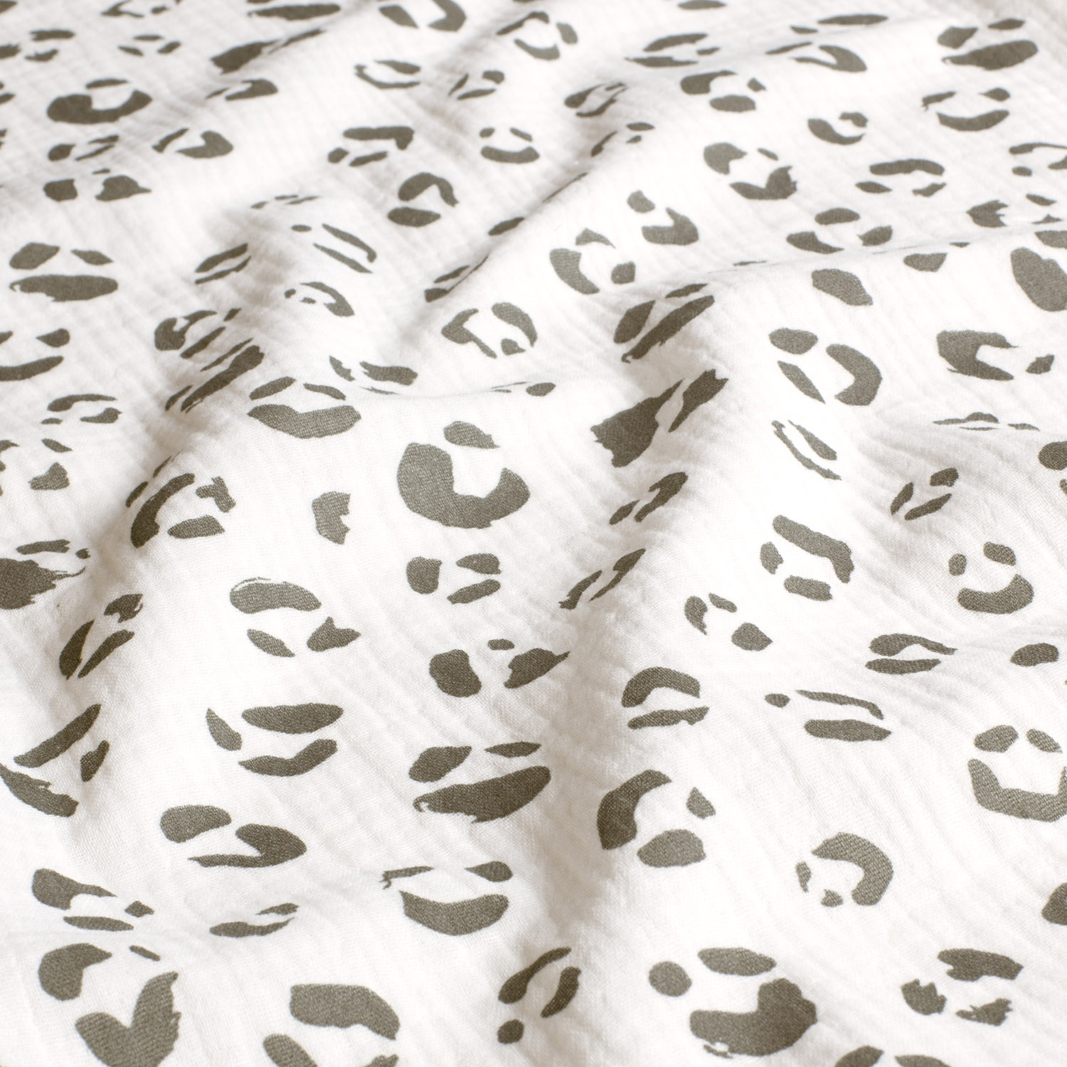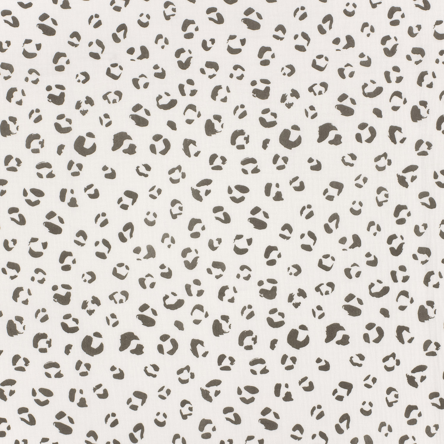 Deze mousseline combineert een casual boho-charme met een vleugje wildheid: op een zachte, wolwitte achtergrond spelen gestileerde luipaardvlekken in warme natuurtinten en zachte contrasten. Het subtiele dierenprint is zowel modern als elegant – perfect voor iedereen die van patronen houdt, maar niet te opvallend.