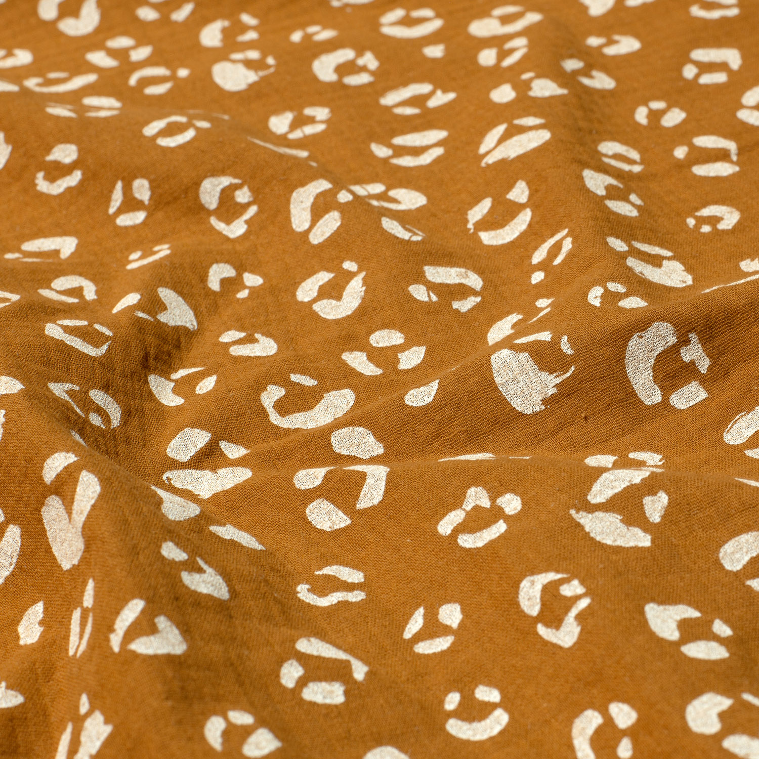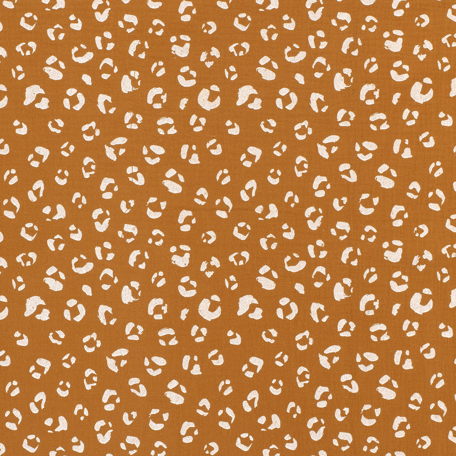 Wild, zacht en prachtig – deze mousseline met trendy luipaardprint geeft direct een fashiongevoel aan je naai-projecten. Het ontwerp toont een gestileerde luipaardprint in warme karamel- en beigetinten, doorspekt met zacht contrasterende donkerbruine stippen. Zo ontstaat een moderne dierenprint-look die tegelijk chic en gezellig oogt.