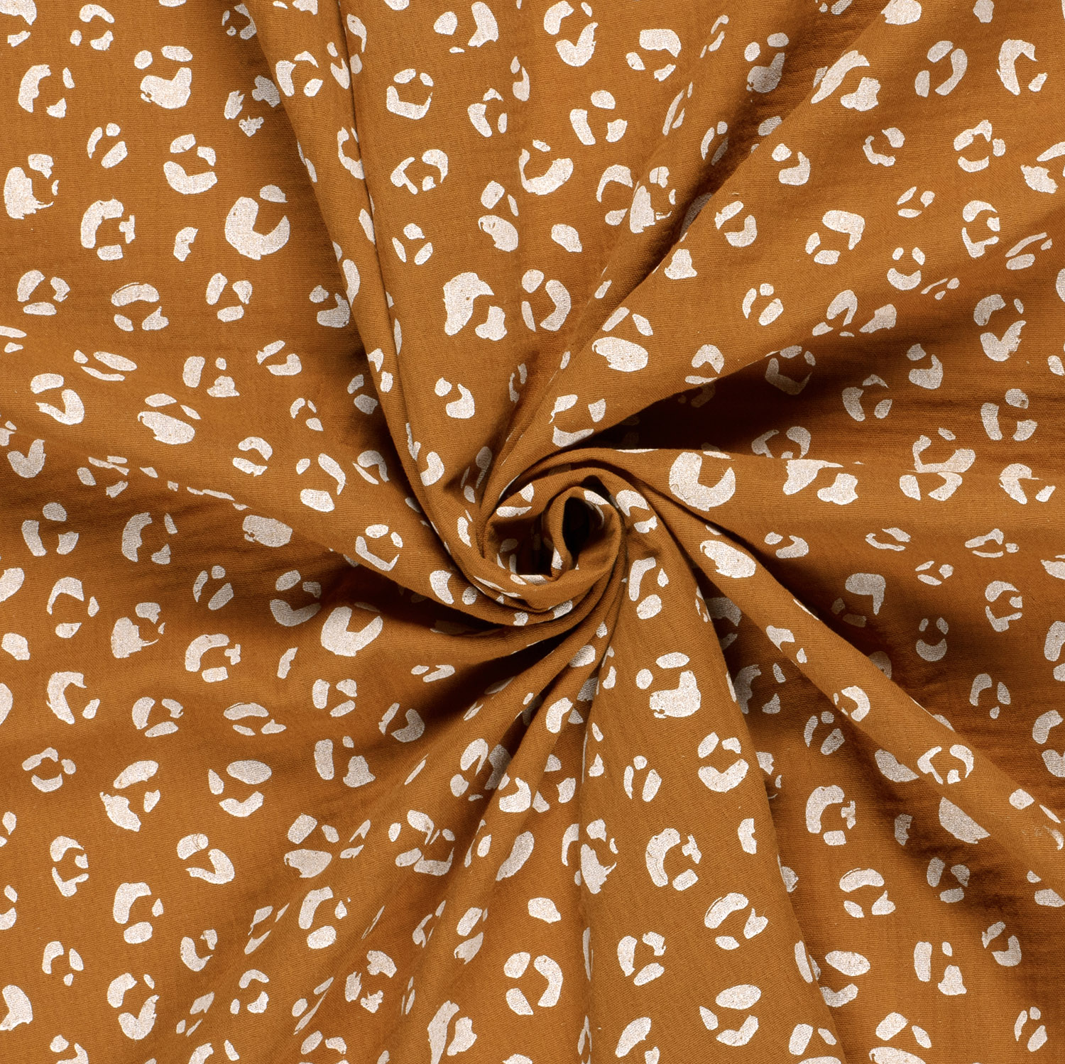Of het nu een opvallend kledingstuk is, een knuffelzacht doek of een stijlvol woonaccessoire: deze karamelkleurige luipaardmousseline geeft je naai-ideeën een trendy en tegelijk tijdloos natuurlijke look.