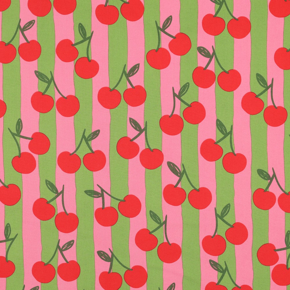 Zomerse stemming om te naaien: sappige, rozerode kersen met kleine groene blaadjes dansen over een heldere, vriendelijke achtergrond op deze vrolijke stof. Het ontwerp ziet er speels en modern tegelijk uit - als een vers geplukte fruitmand op een zonnige dag.