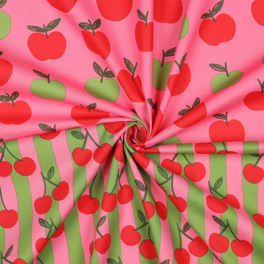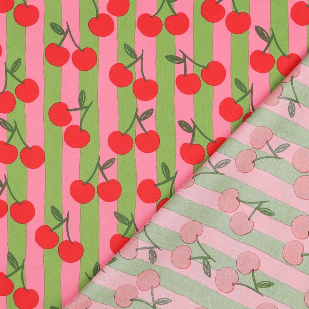 Perfect voor schattige kinderkleding, luchtige blouses, rokjes of kleurrijke accessoires zoals haarbanden, cosmeticatassen of kussenhoezen. De heldere kleuren en het charmante kersenpatroon maken van elk naaiproject een blikvanger - ideaal voor iedereen die een speels, fris accent aan zijn outfit of huis wil toevoegen.