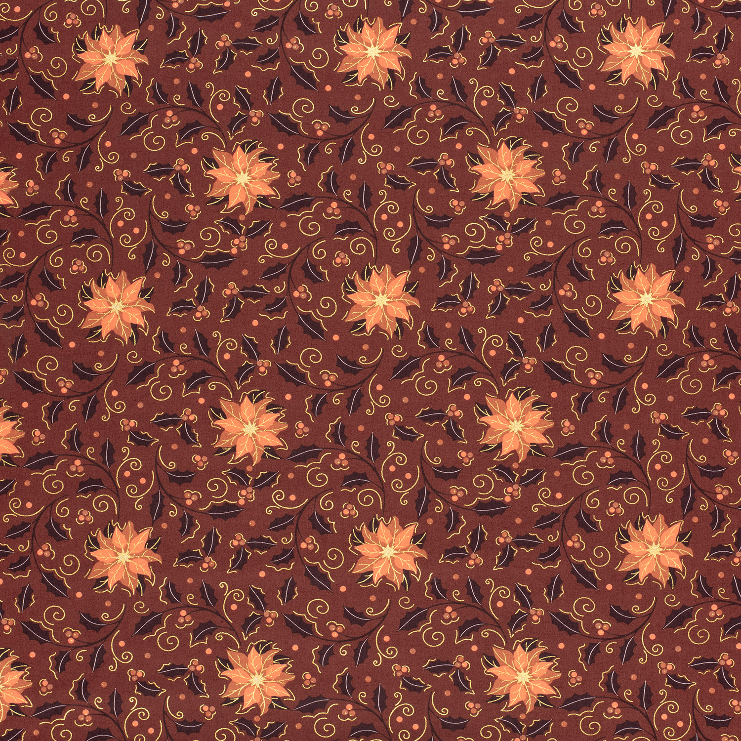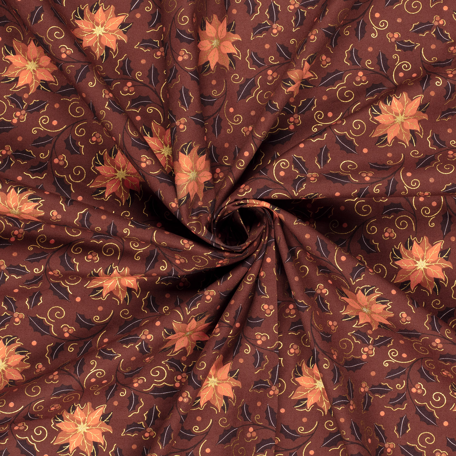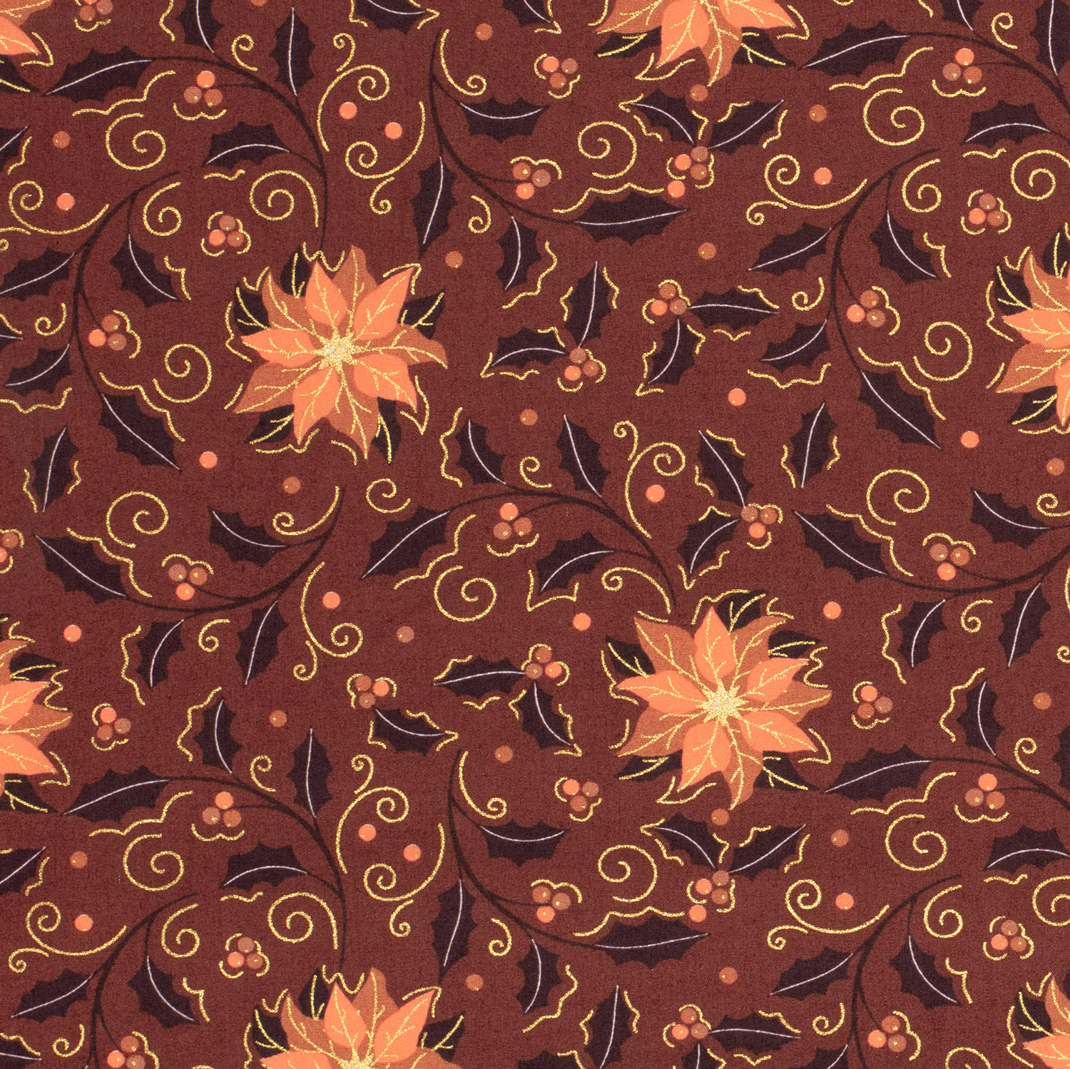 Een feestelijke stof als uit een kerstverhaal: op een edele bordeauxkleur rijgen stijlvolle kerstballen zich aaneen, kunstig versierd met fijne ornamenten en delicate patronen. Subtiele gouden accenten laten het ontwerp elegant glanzen en geven de stof een warme, luxe uitstraling – perfect voor iedereen die kerst graag een beetje glamouruzer viert.